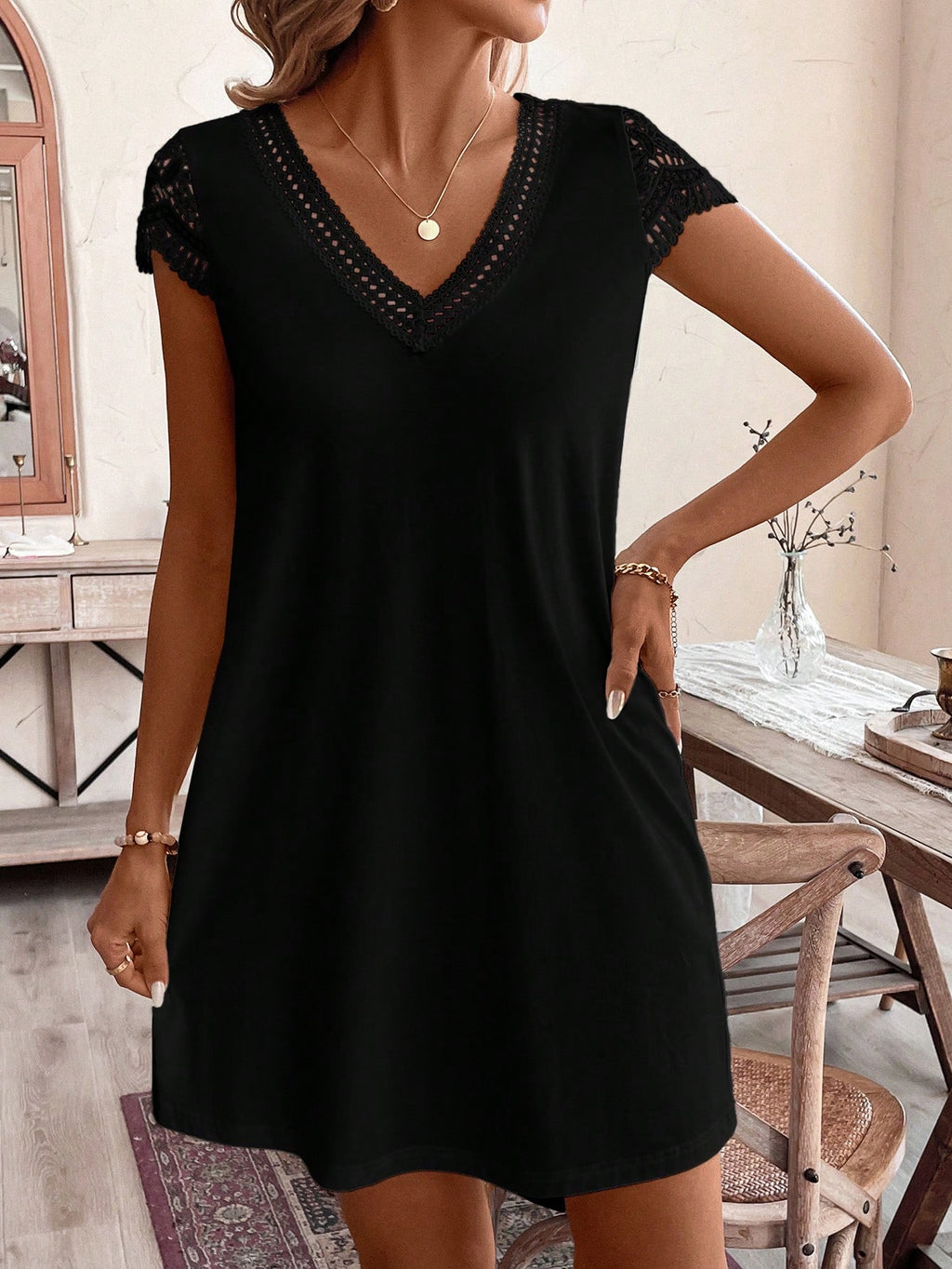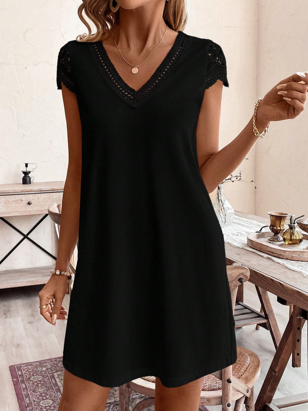 MIU francuska haljina u jednobojnoj boji s ukrasnim šavom i čipkom topivom u vodi, ležernog kroja — savršena za ljeto, boho stil, cvjetne motive, svakodnevne i elegantne kombinacije.