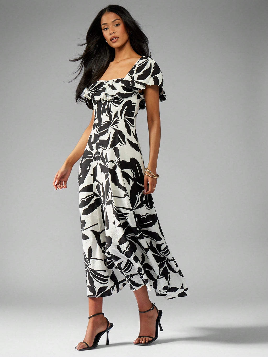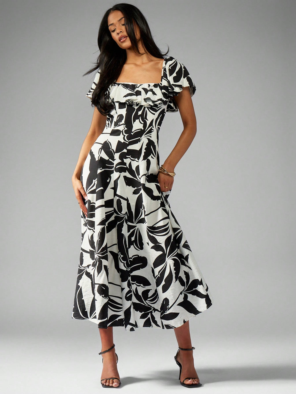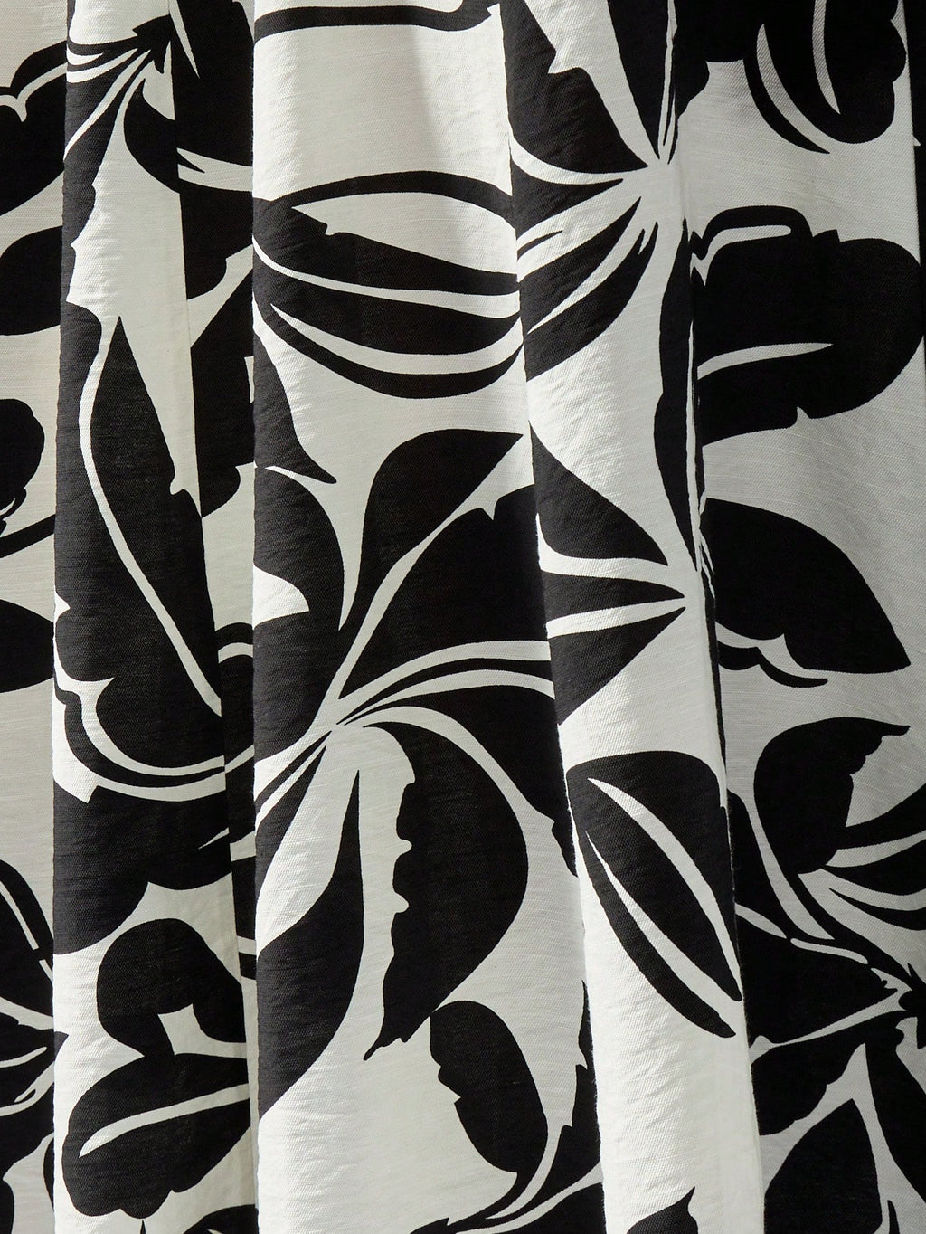 BELLAVOG Leaf Print Linen Ruffle And Seam Detail Midi Dress