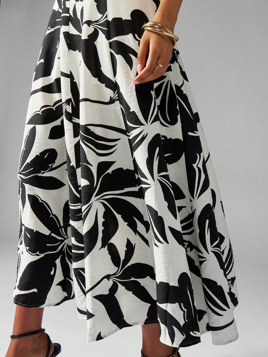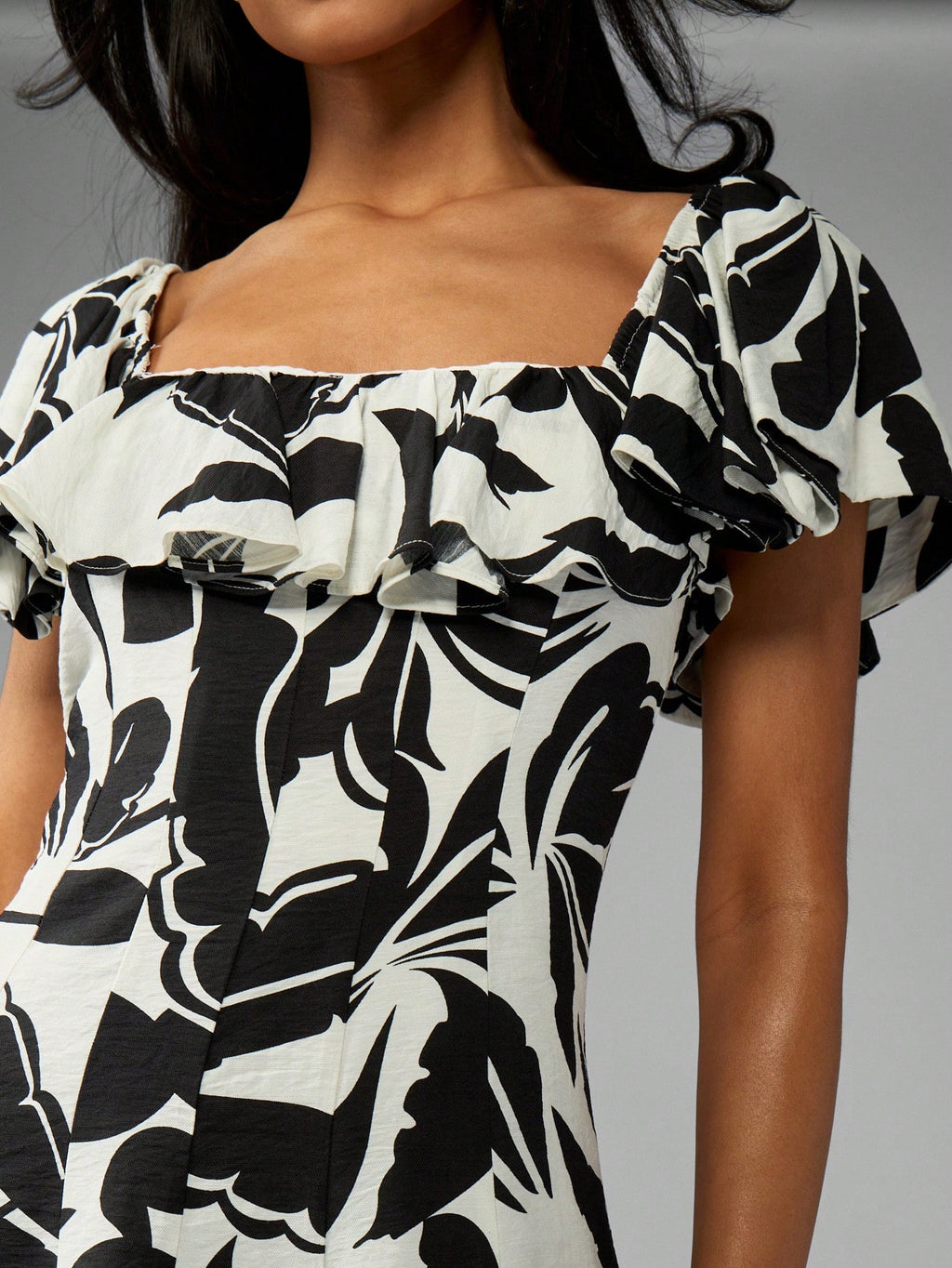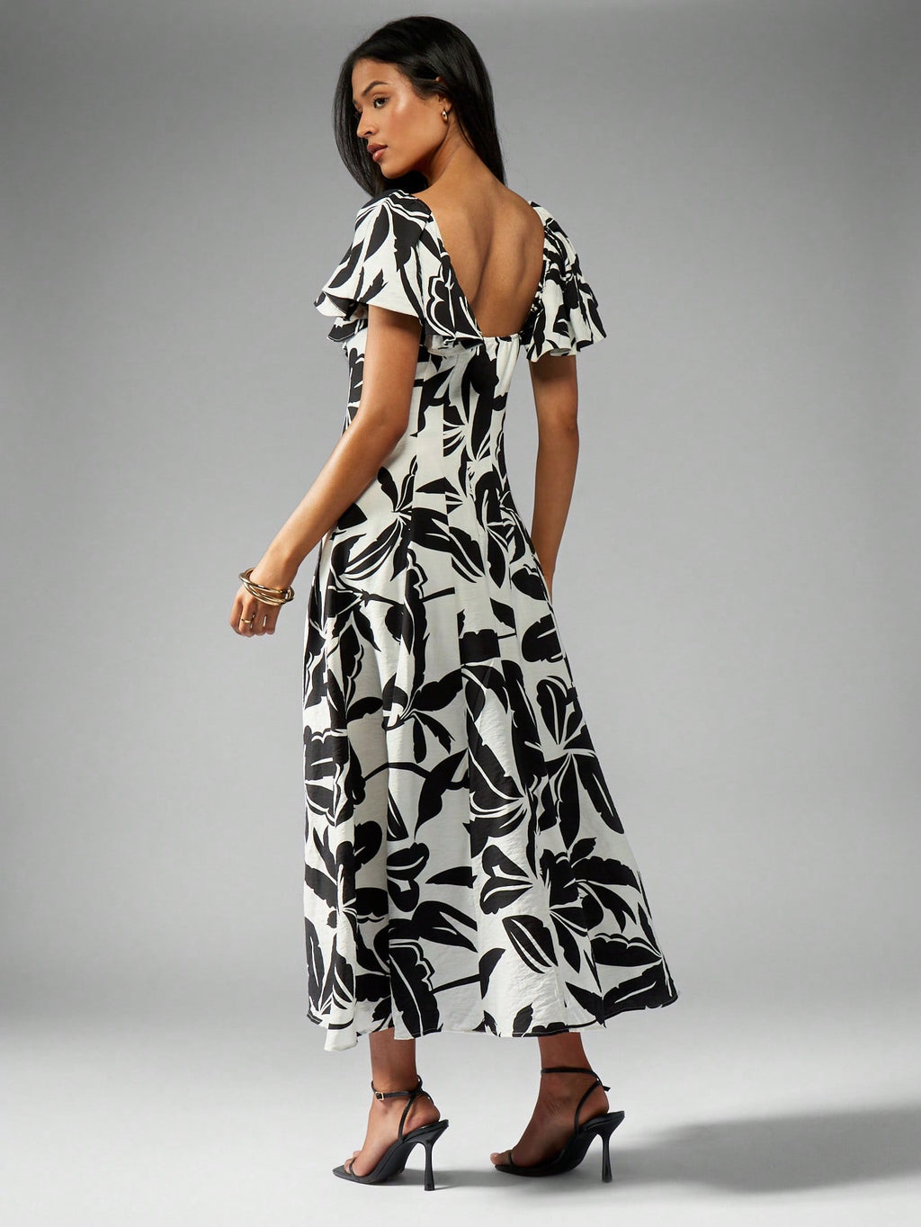 BELLAVOG Leaf Print Linen Ruffle And Seam Detail Midi Dress