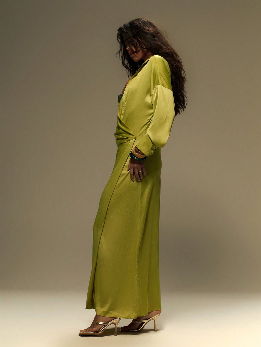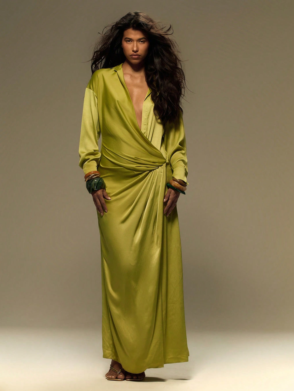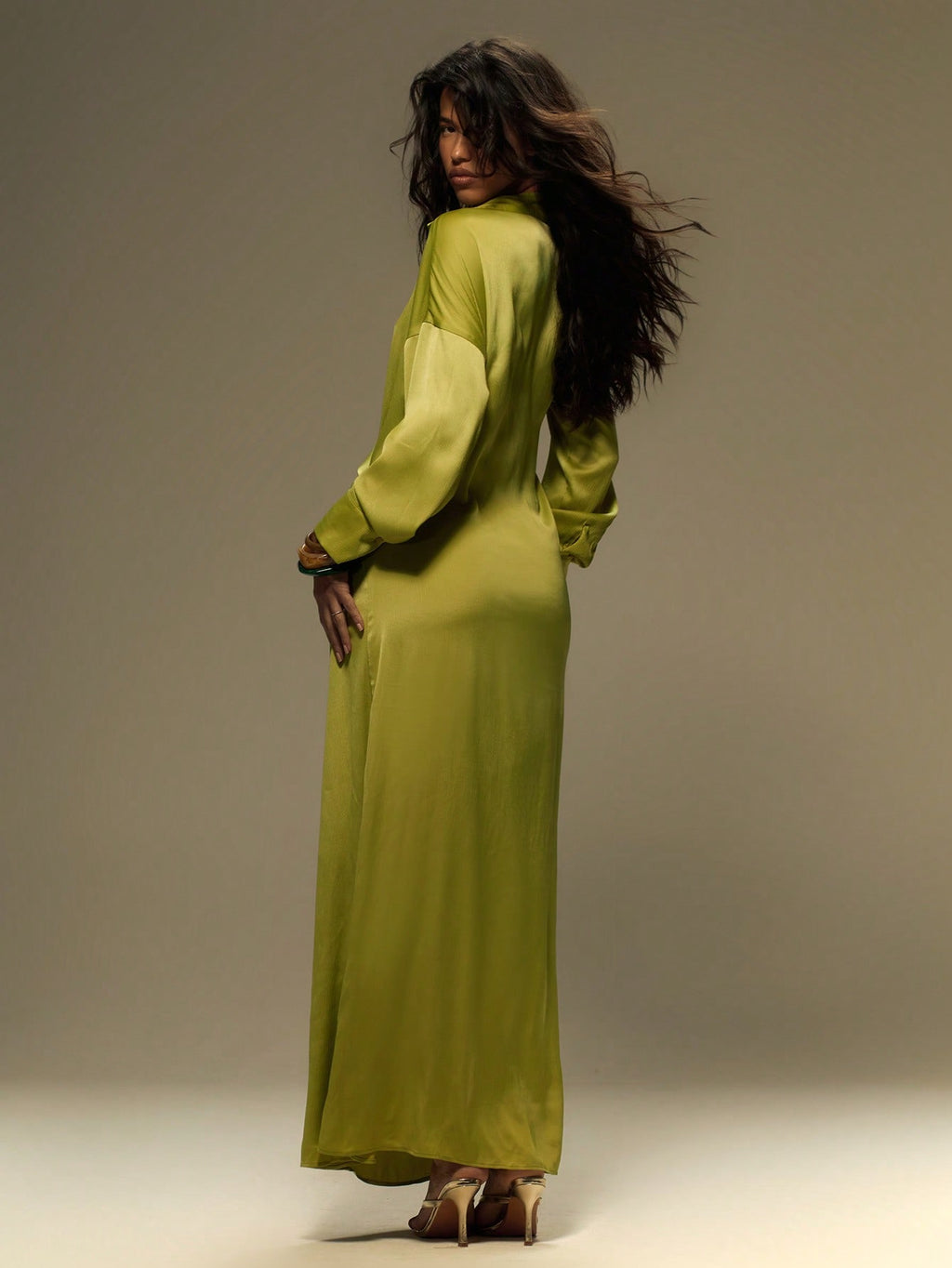 BELLAVOG Maxi Shirt Drape Button Up Long Sleeve Knot Split Dress For Summer, Vacation Wilden Out