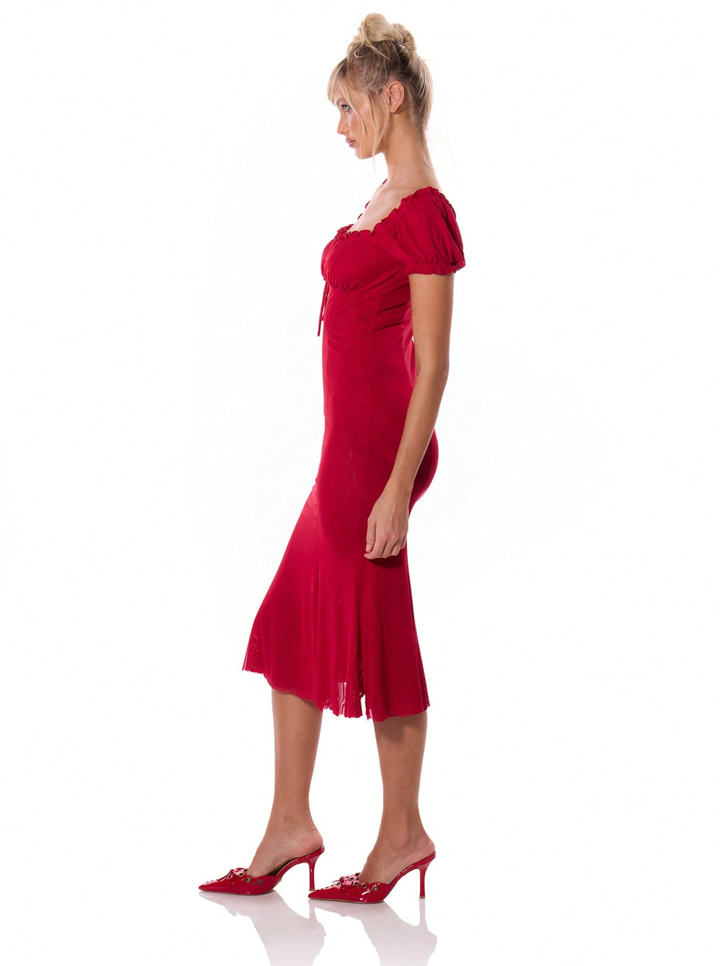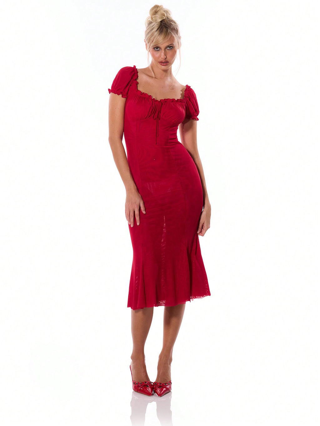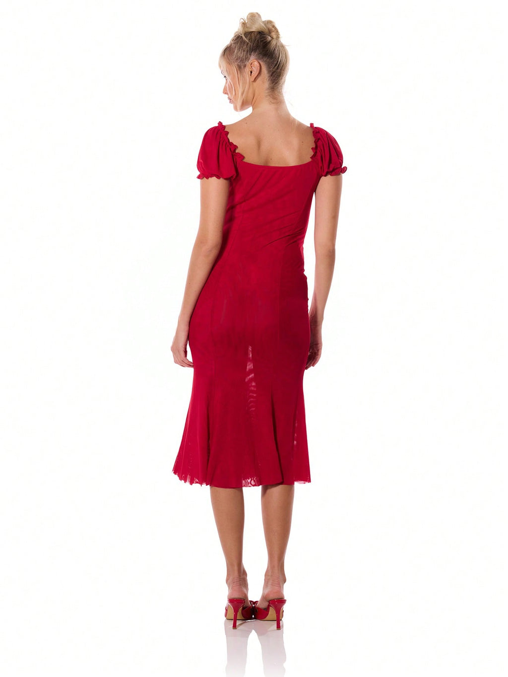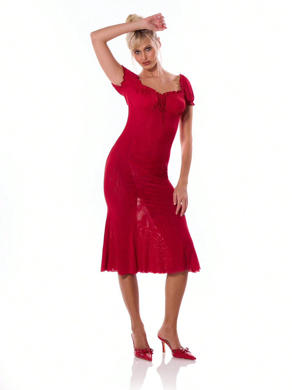 BELLAVOG Mesh Puff Sleeve Midi Shift Dress Elegant Spring Summer Vacation Prom Sheer