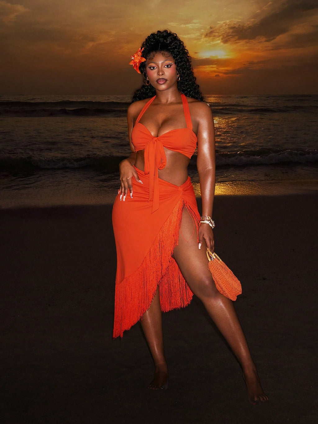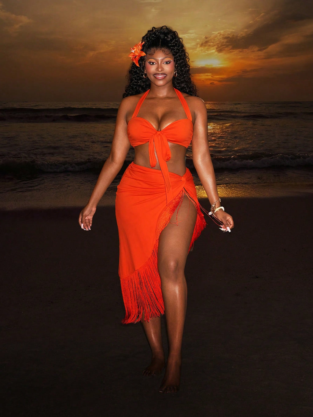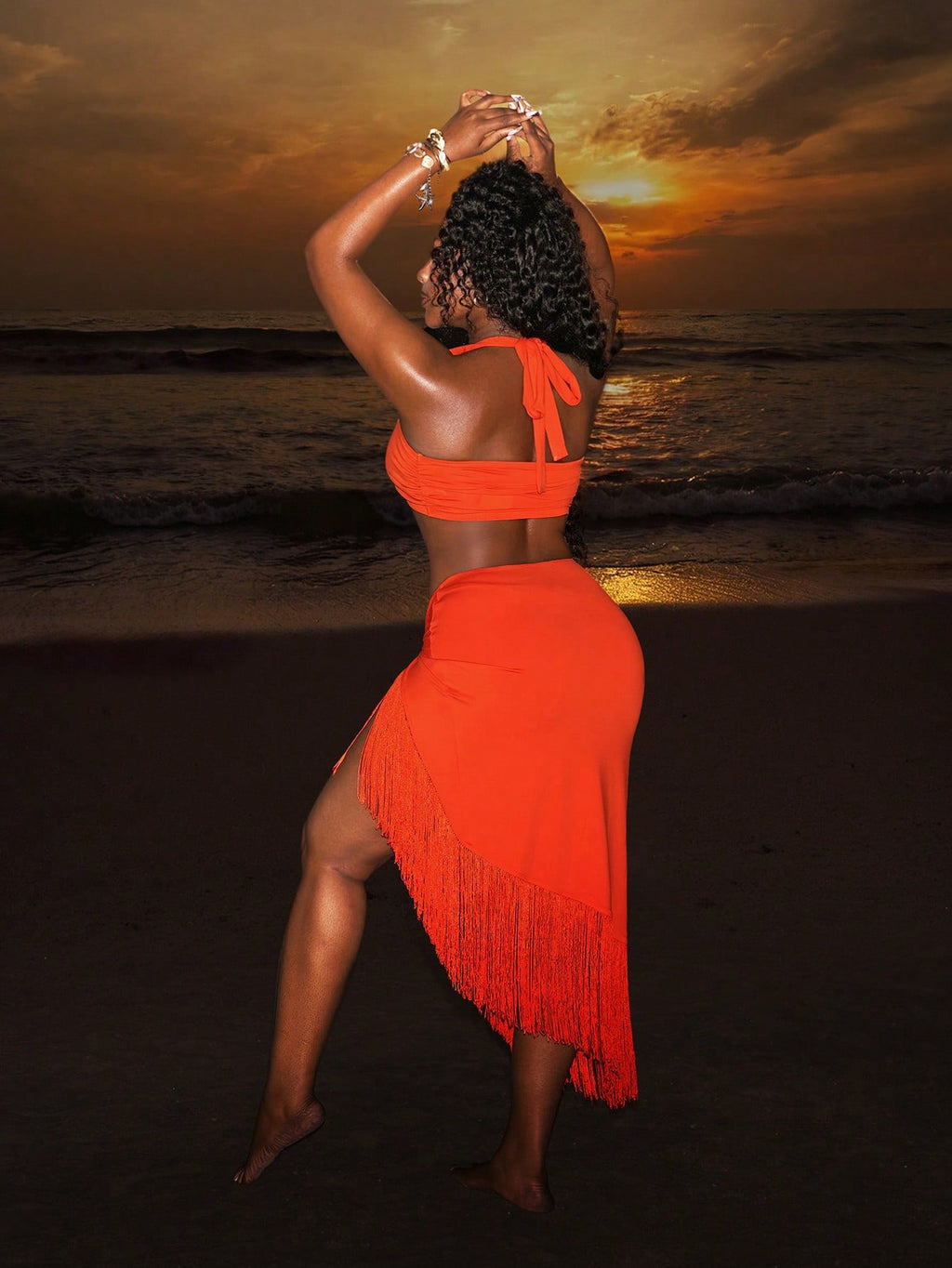 BELLAVOG Novi proljetno/ljetni set od 2 komada: Narandžasti top s vezanjem, visoki prorez, uvijeni rub, ležerno, za odmor, krstarenje, plažu, sunčanje, pogodno za muzičke festivale, rođendane, svakodnevno nošenje
