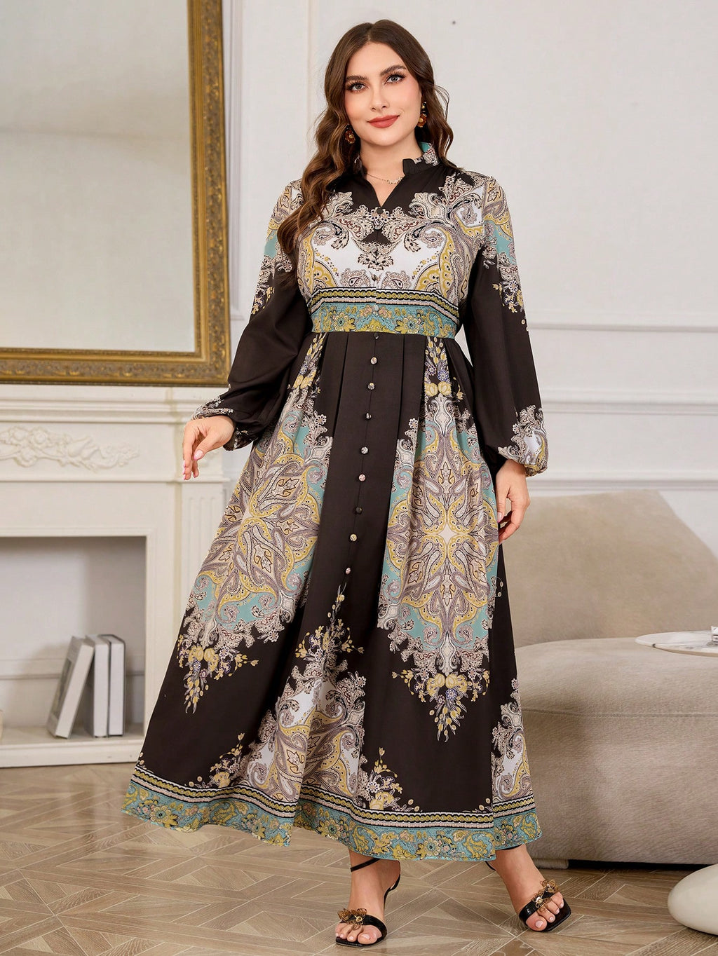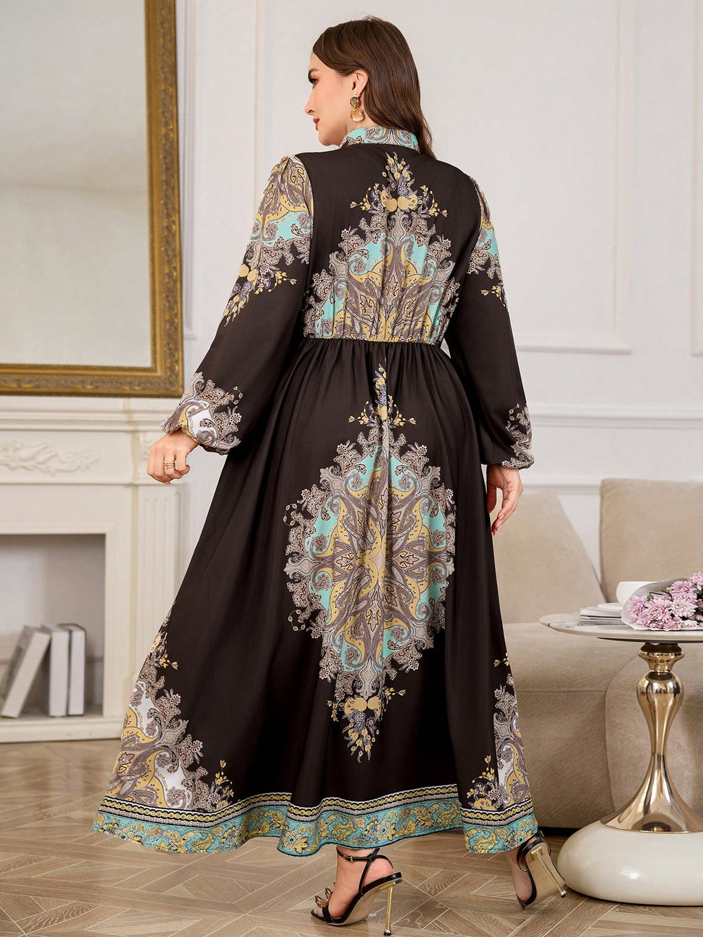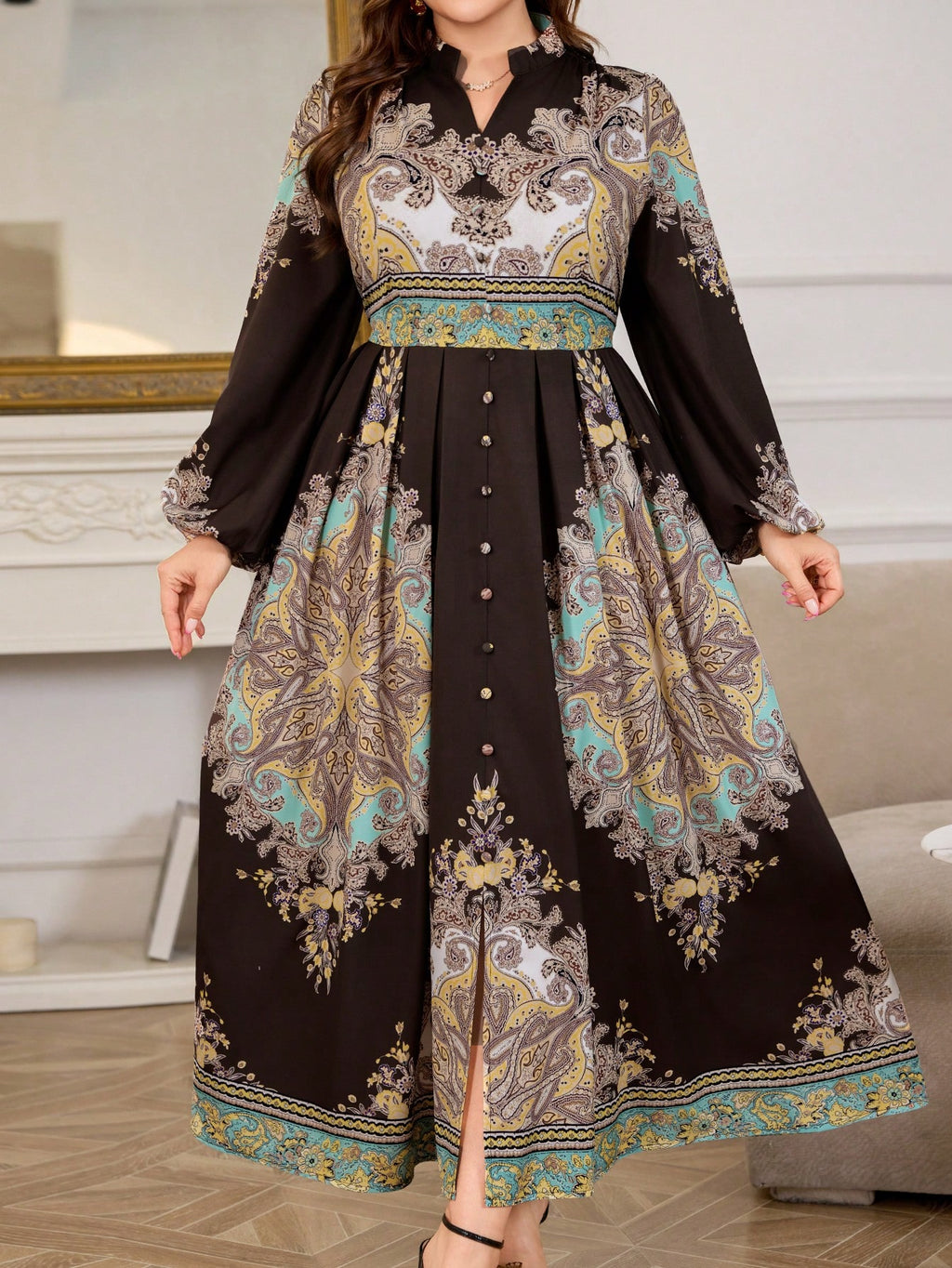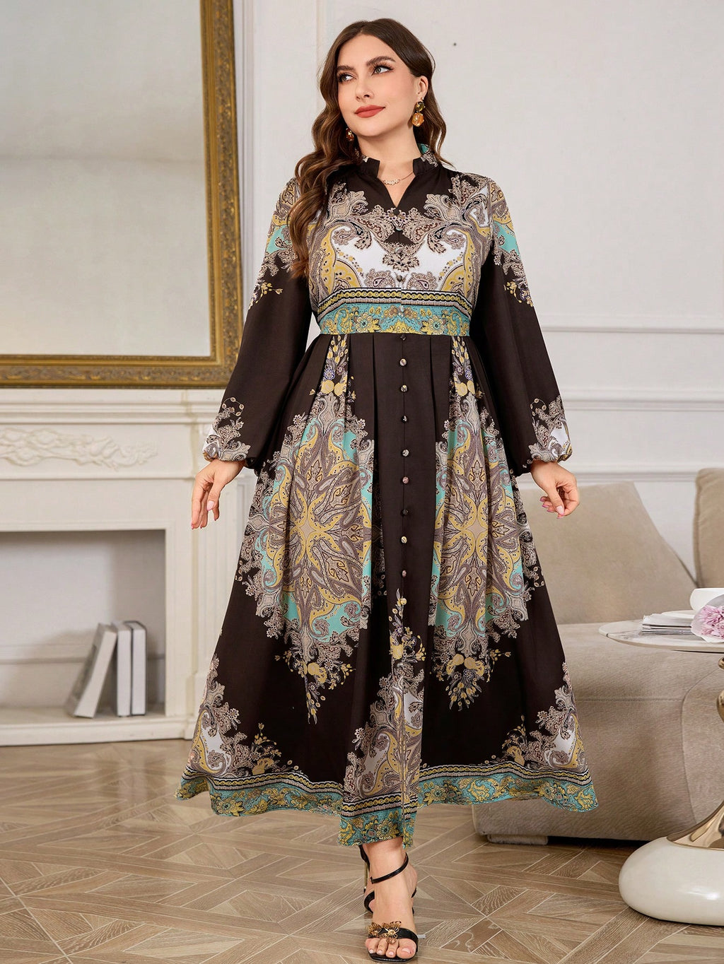 BELLAVOG Plus Size haljina s retro cvjetnim printom i rukavima s lampionom
