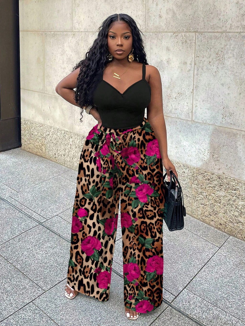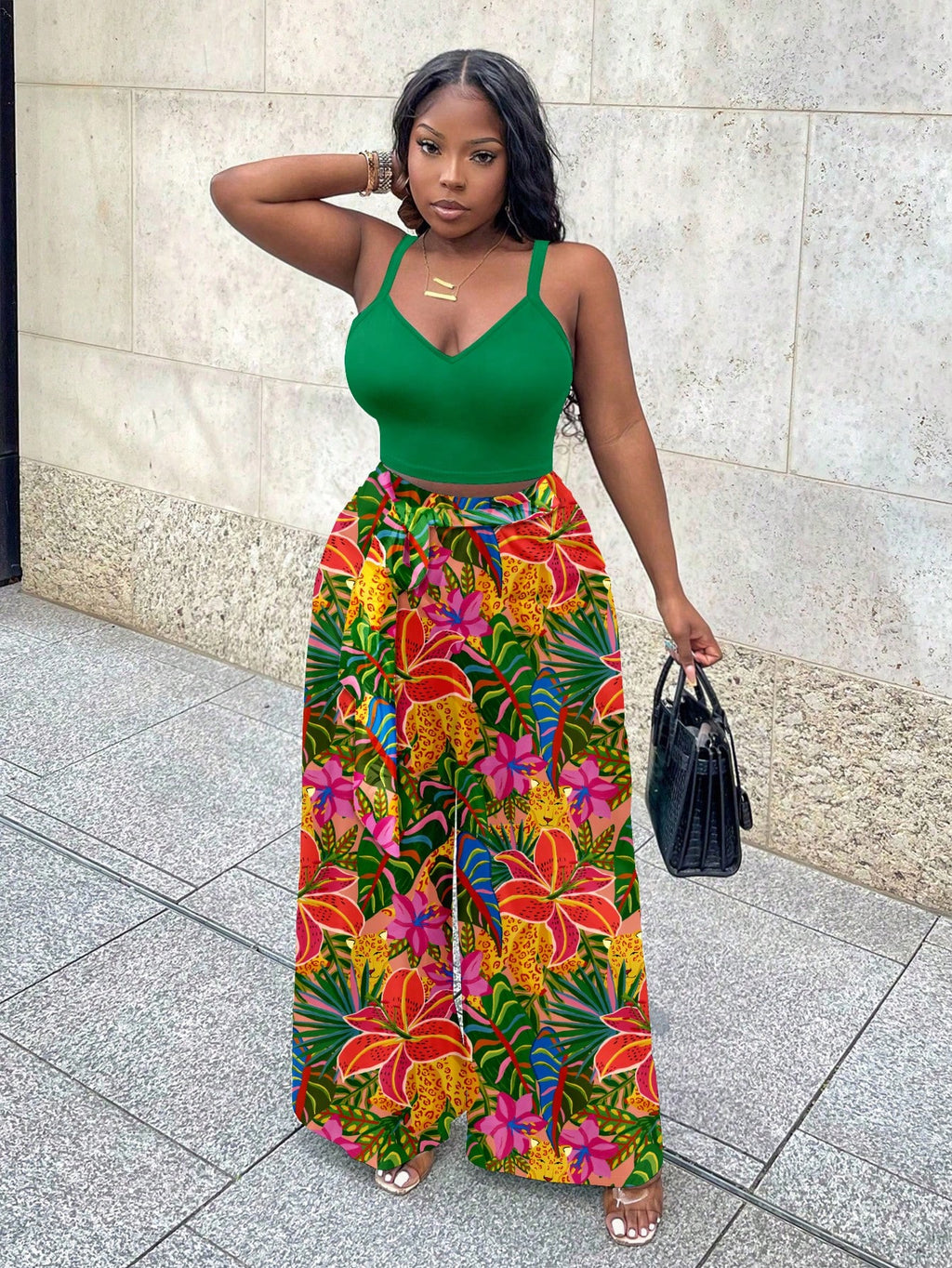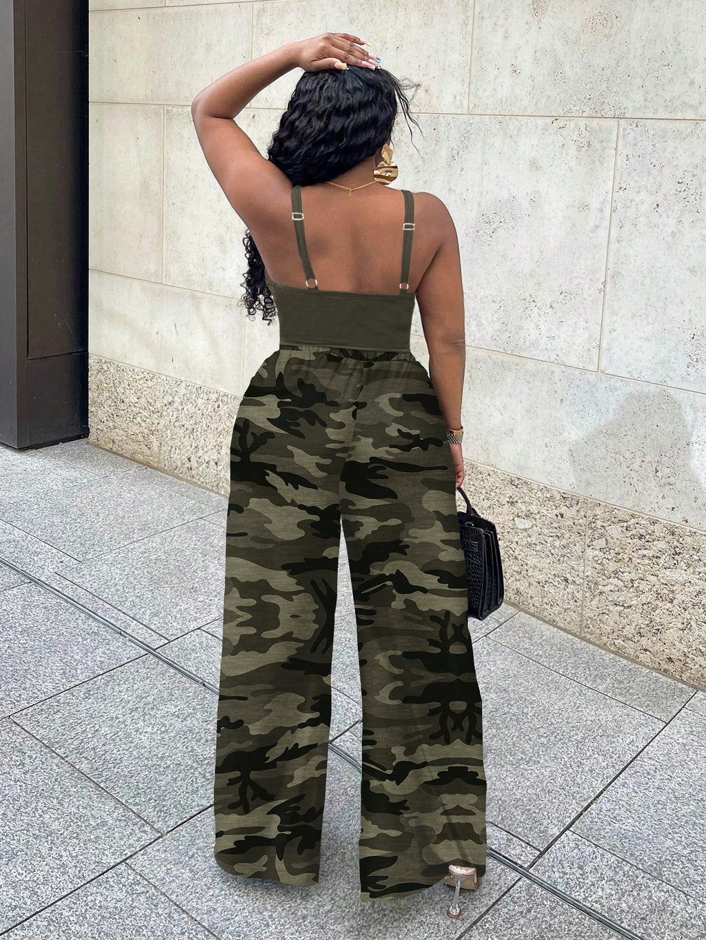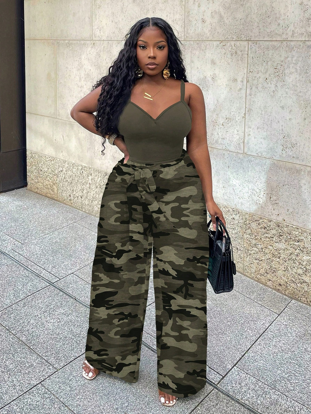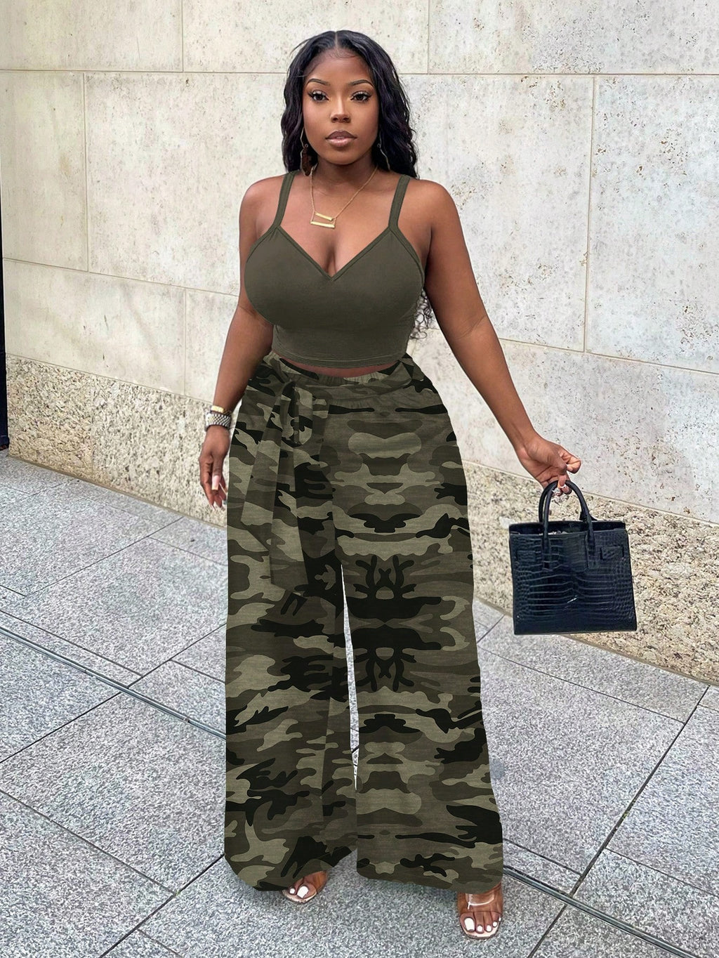 BELLAVOG Ljetna sportska odjeća za odmarališta većih veličina, vojnički zeleni uski top bez rukava i široke hlače s tropskim kamuflažnim printom, dvodijelni set pogodan za muzičke festivale u odmaralištu