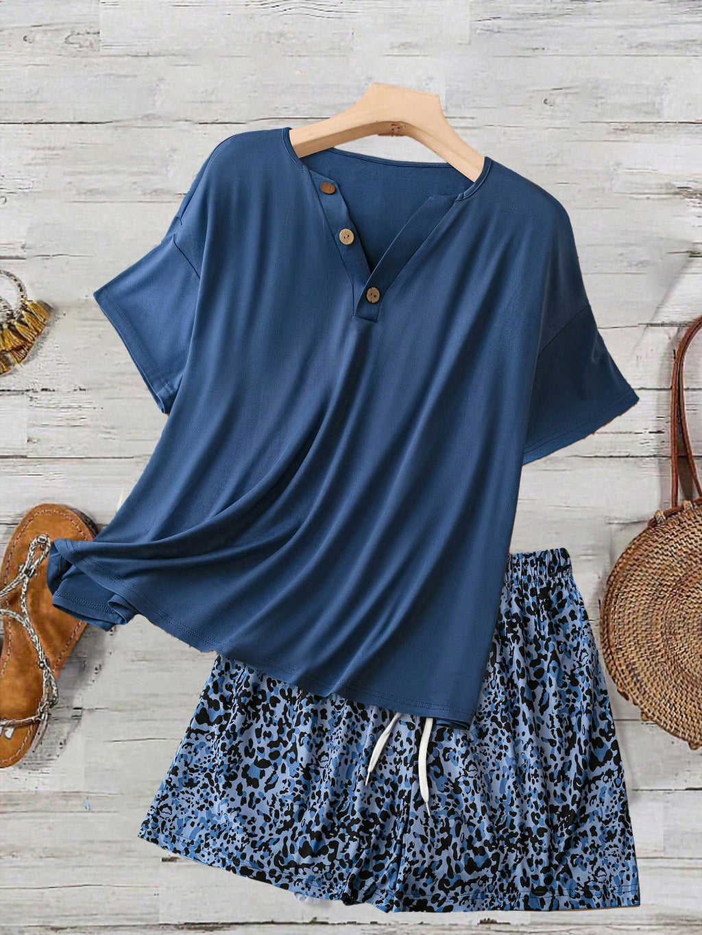 BELLAVOG Ženski komplet odijela za veće veličine s leopard printom i V-izrezom, kratkim rukavima, ležerni, 2 dijela, ljeto