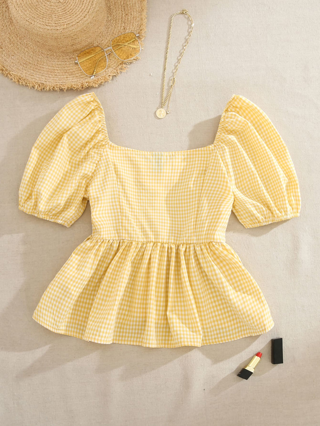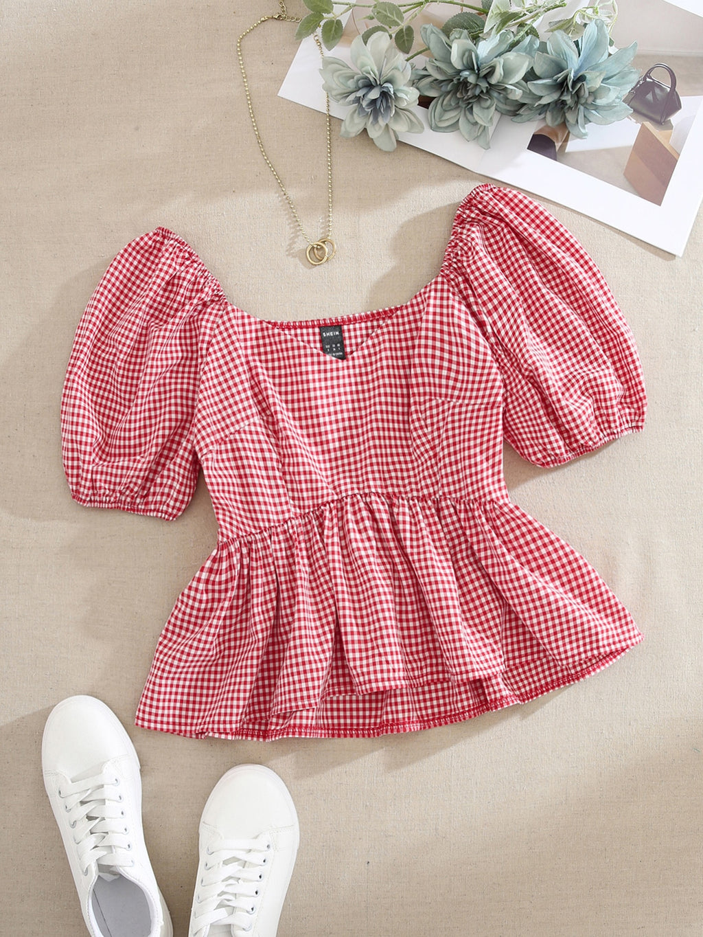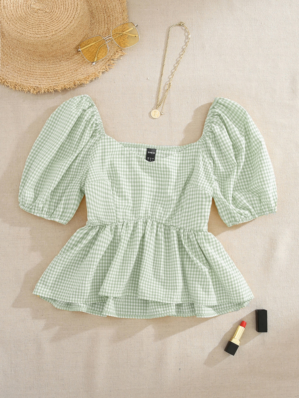 BELLAVOG Bluza s naboranim rukavima i volanima, karirani rub, peplum top
