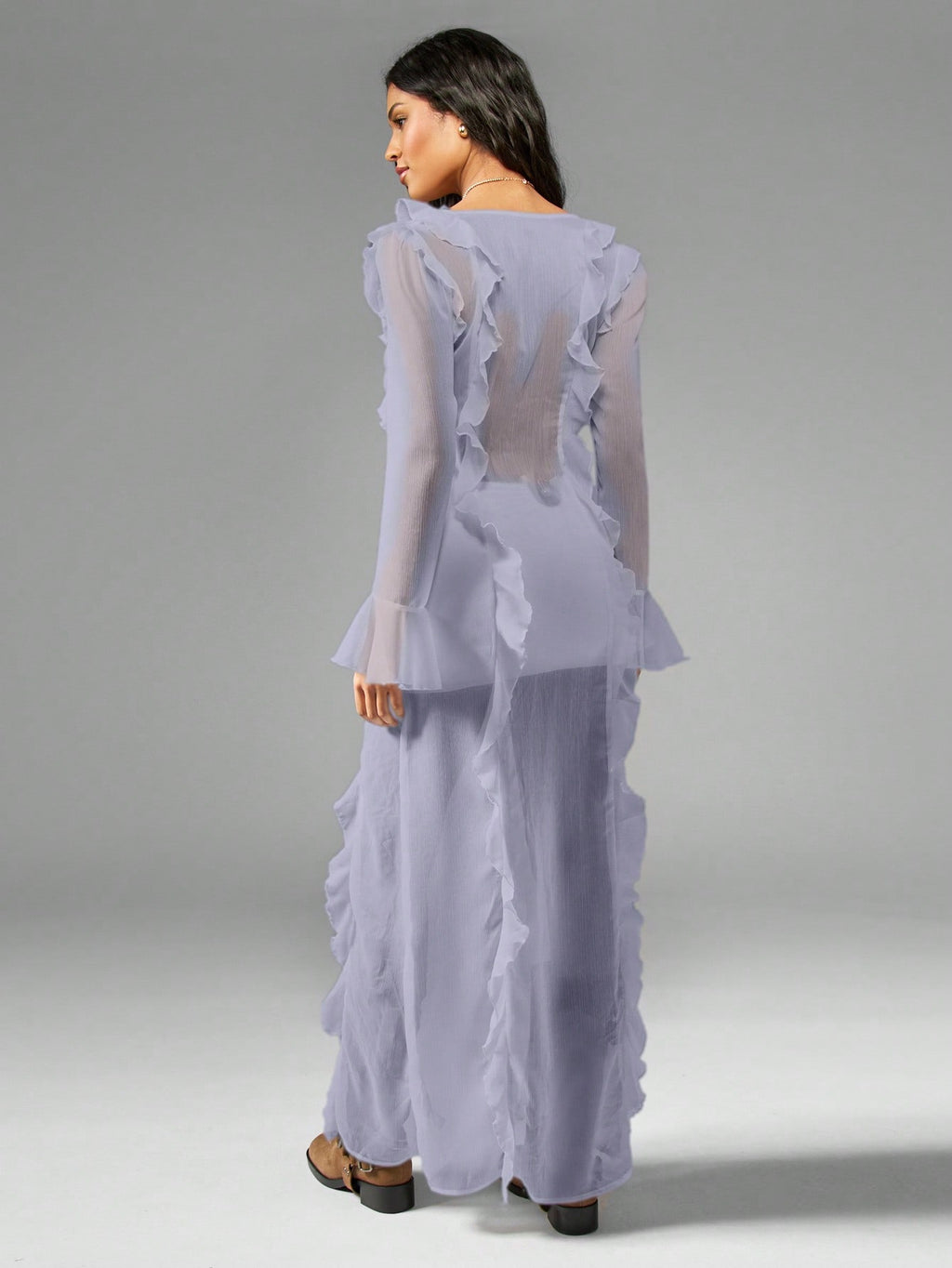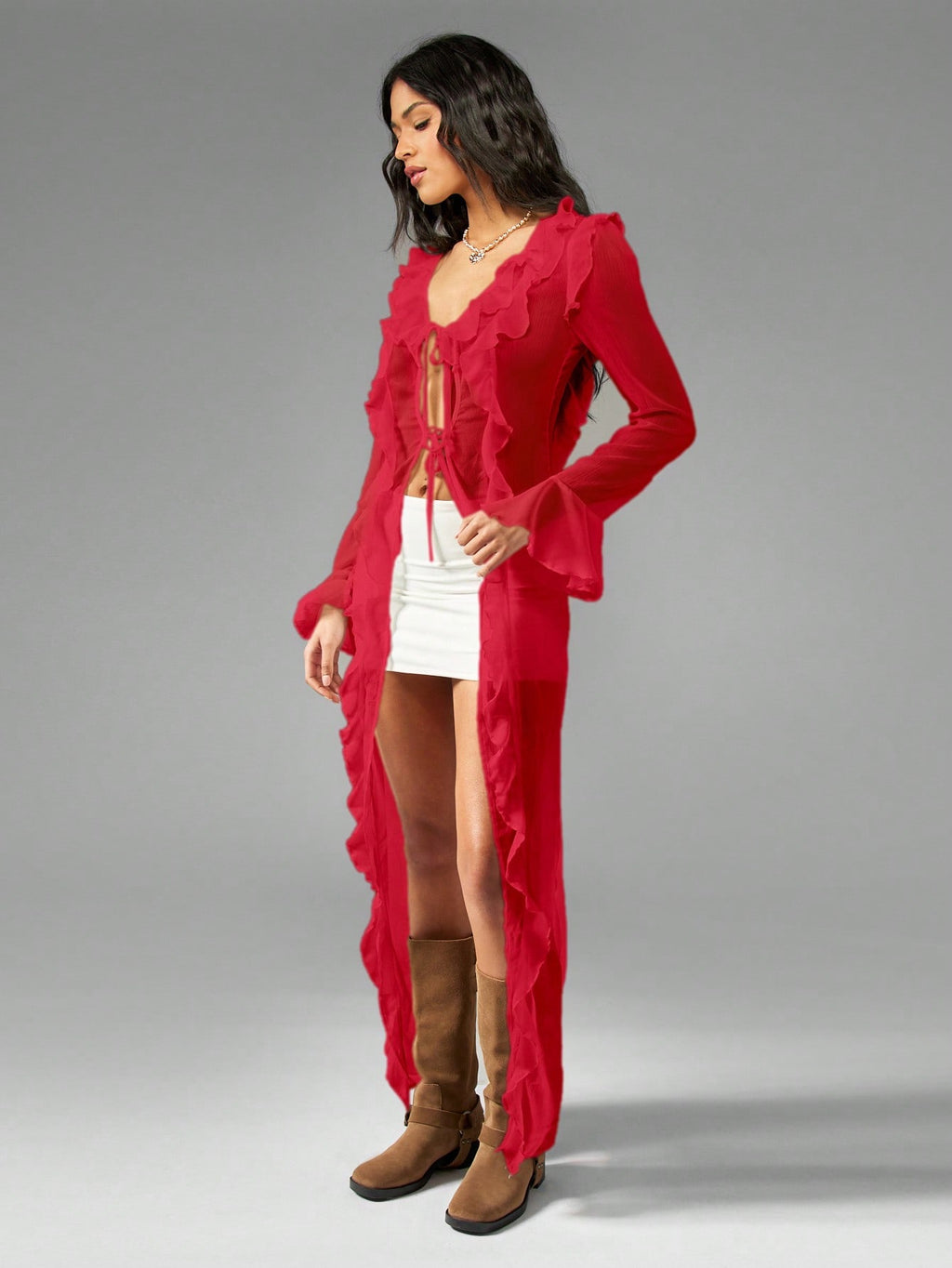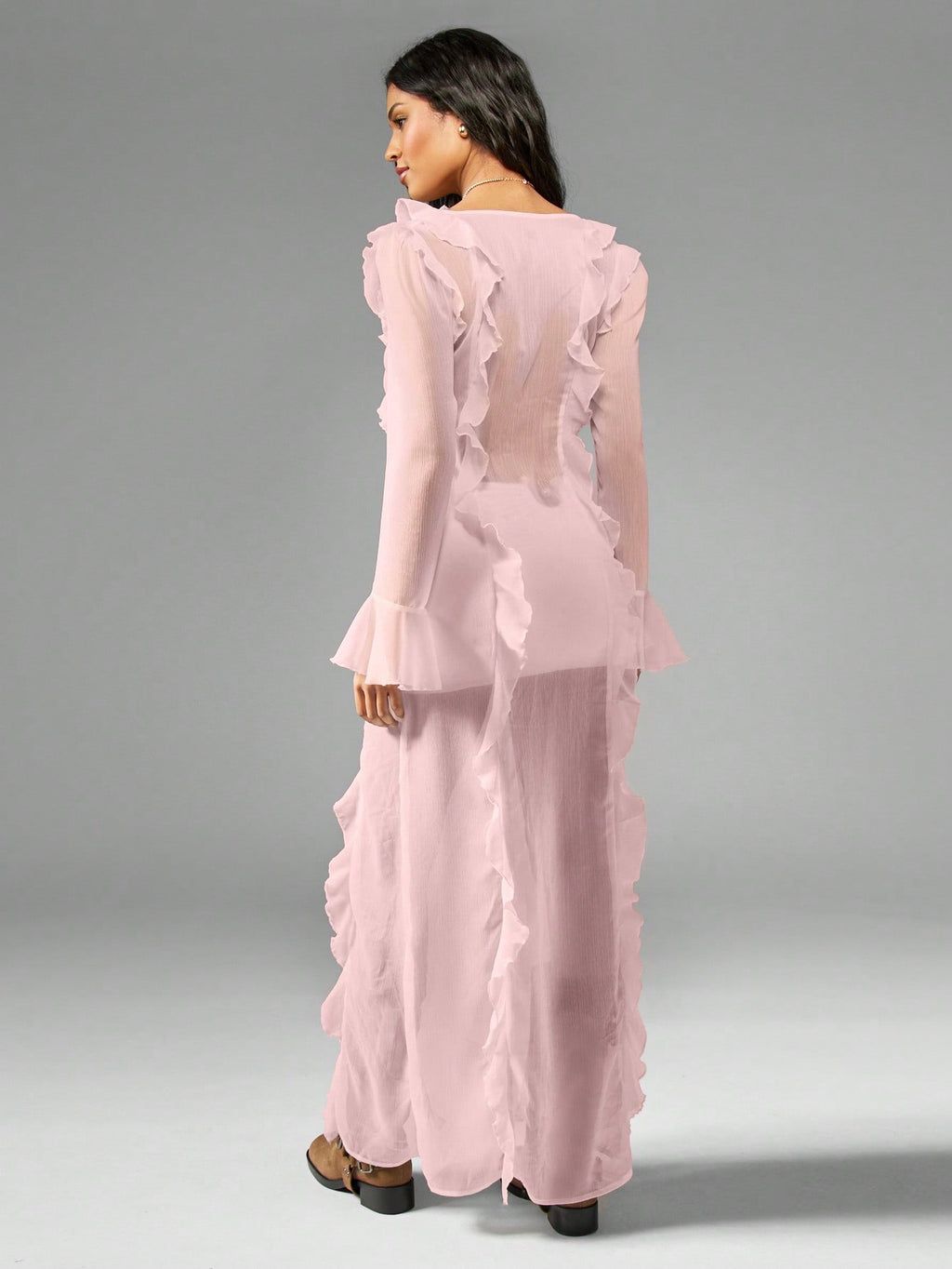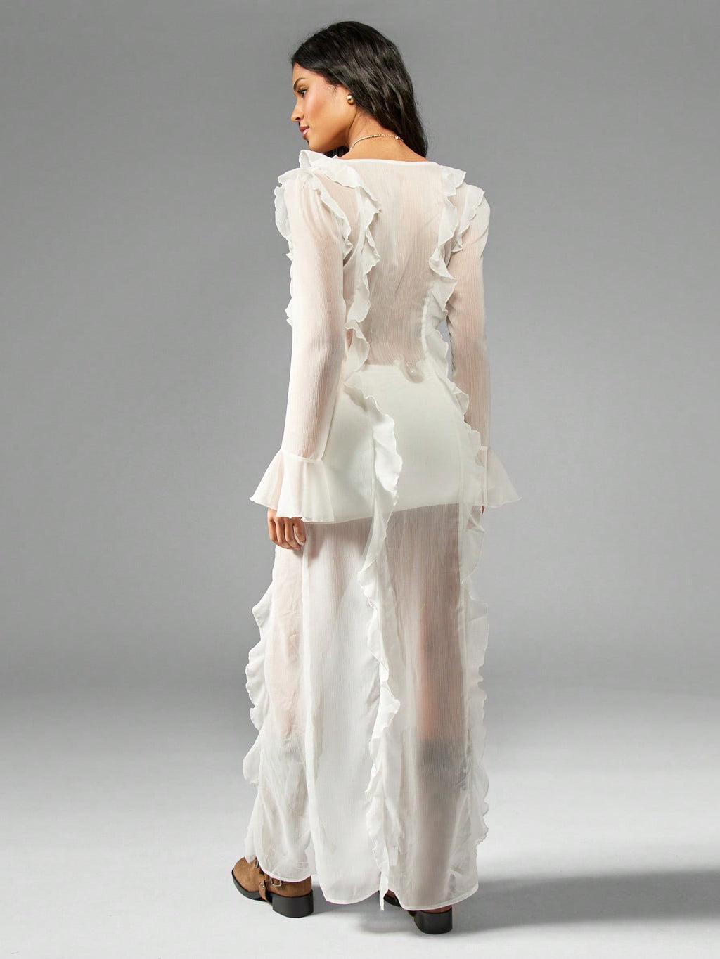 BELLAVOG Sheer Chiffon Frill Detail Open Front Long Bell Sleeves Maxi Top