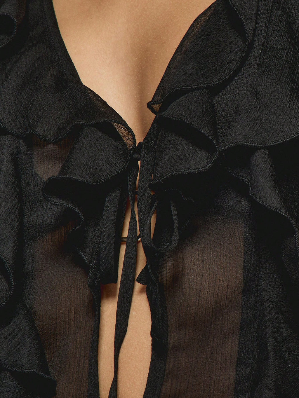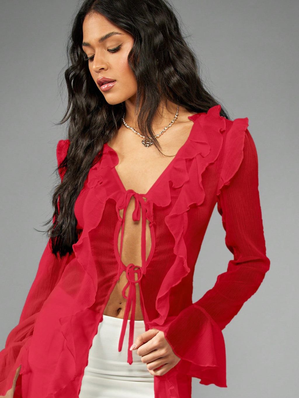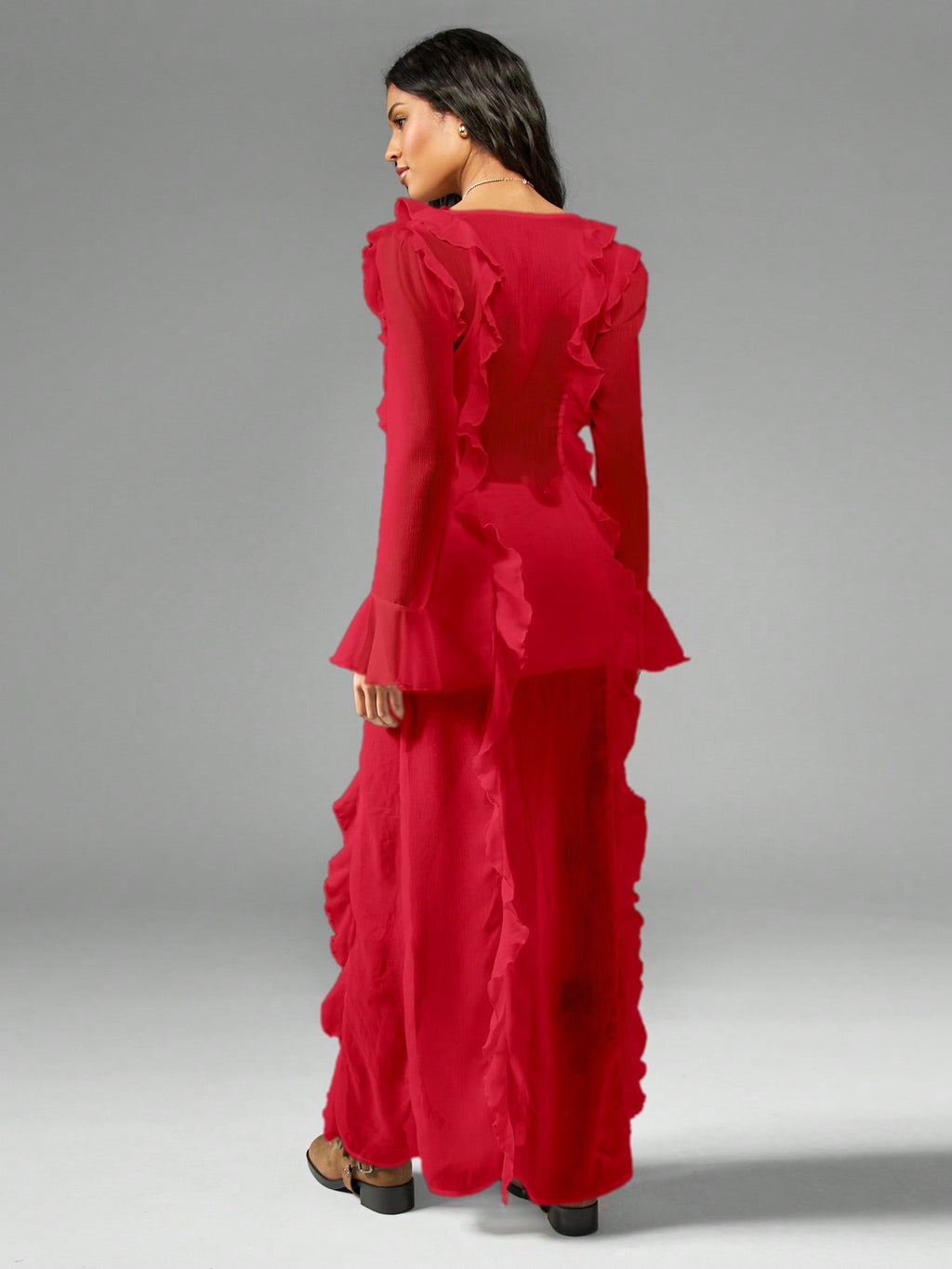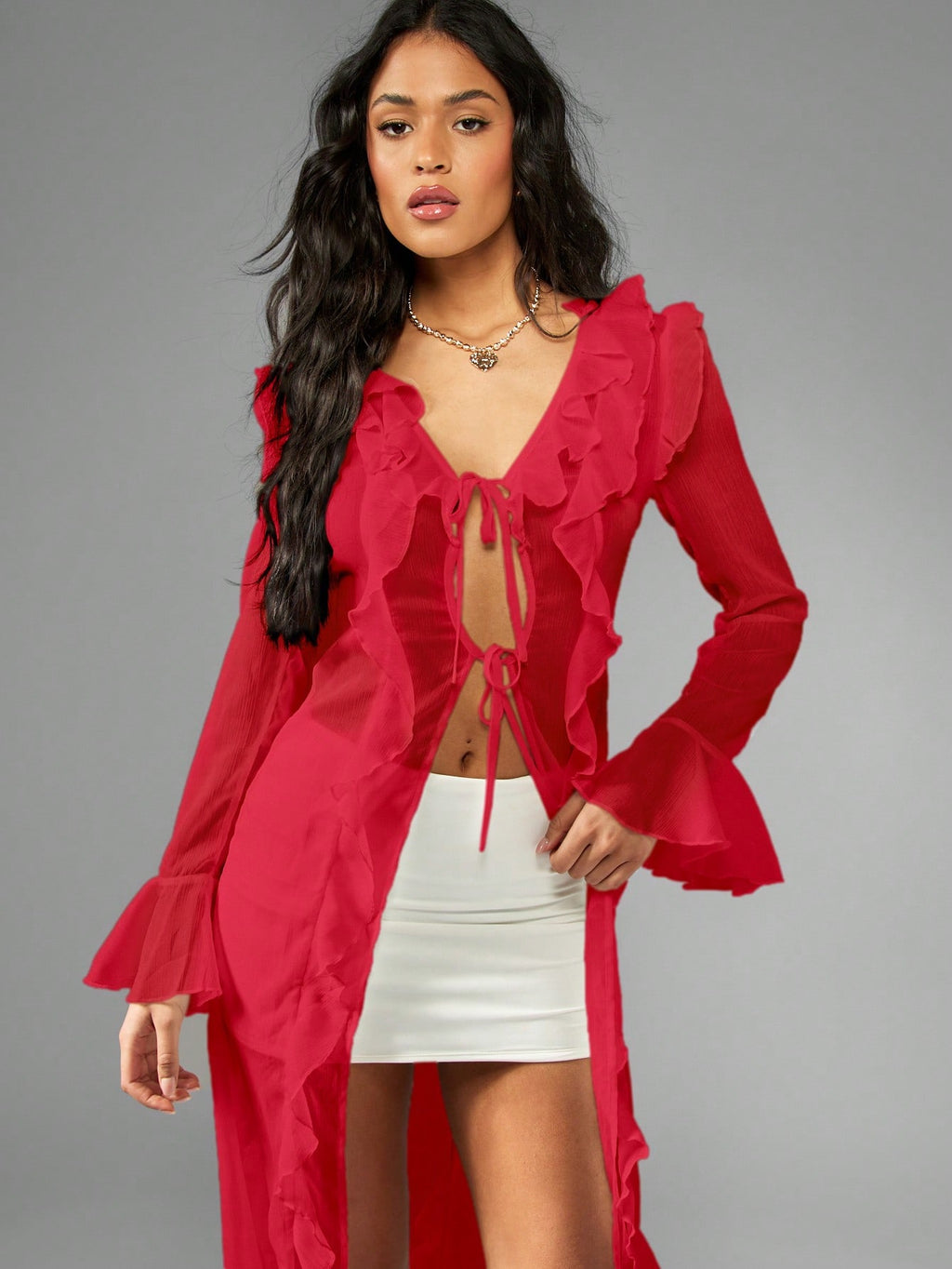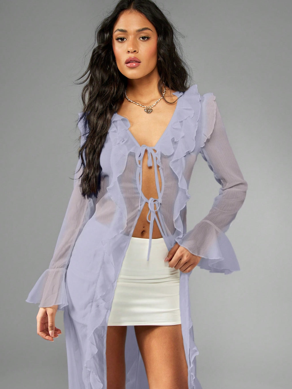 BELLAVOG Sheer Chiffon Frill Detail Open Front Long Bell Sleeves Maxi Top