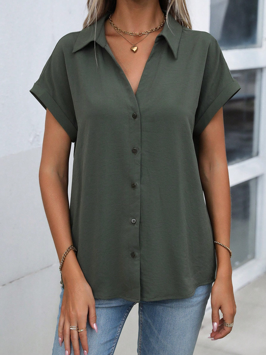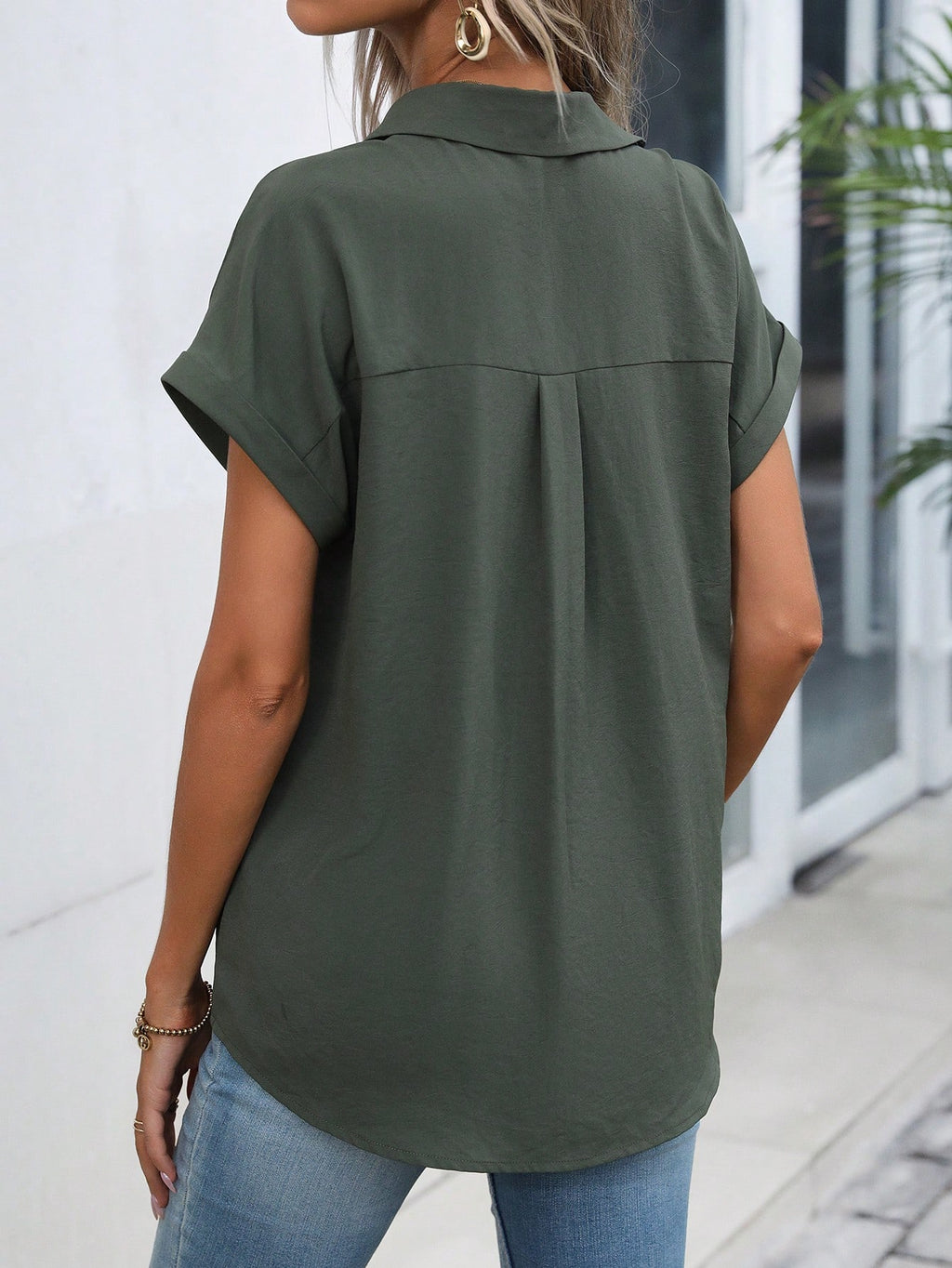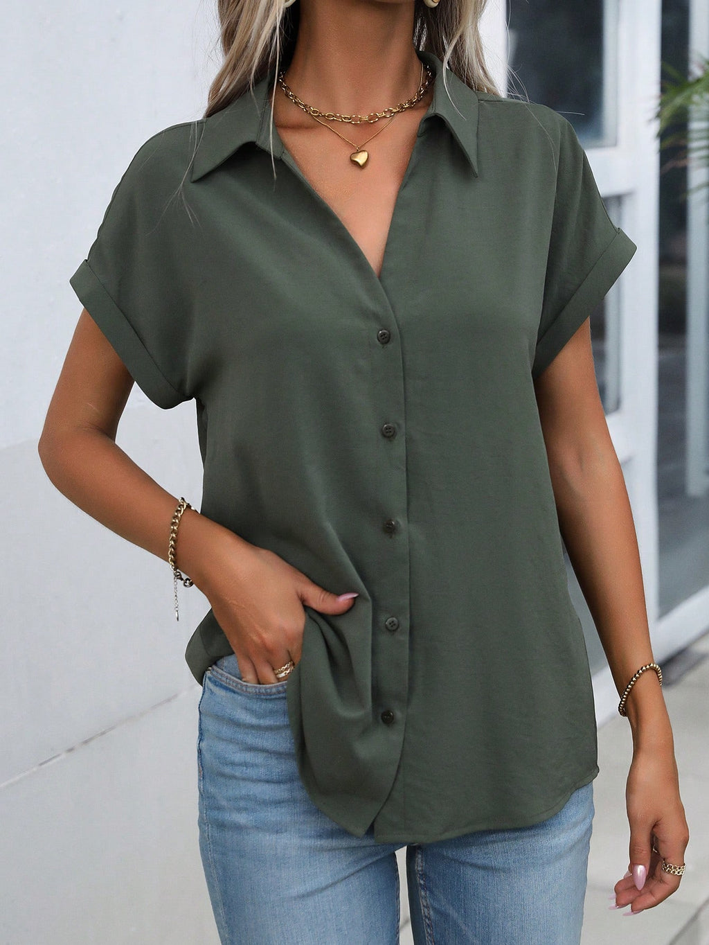 BELLAVOG Jednobojna košulja s rukavima i kopčama na kopčama, majica kratkih rukava
