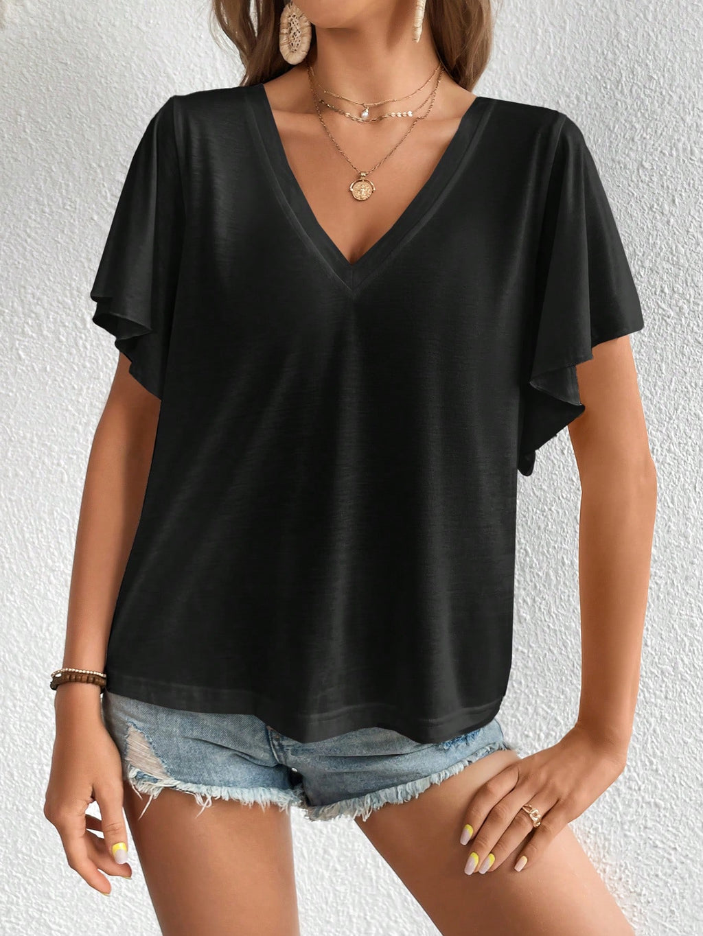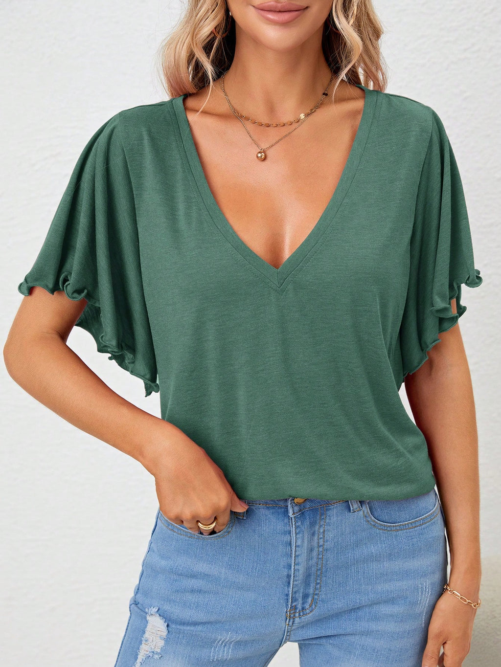 BELLAVOG majica s V-izrezom i jednobojnim leptir rukavima