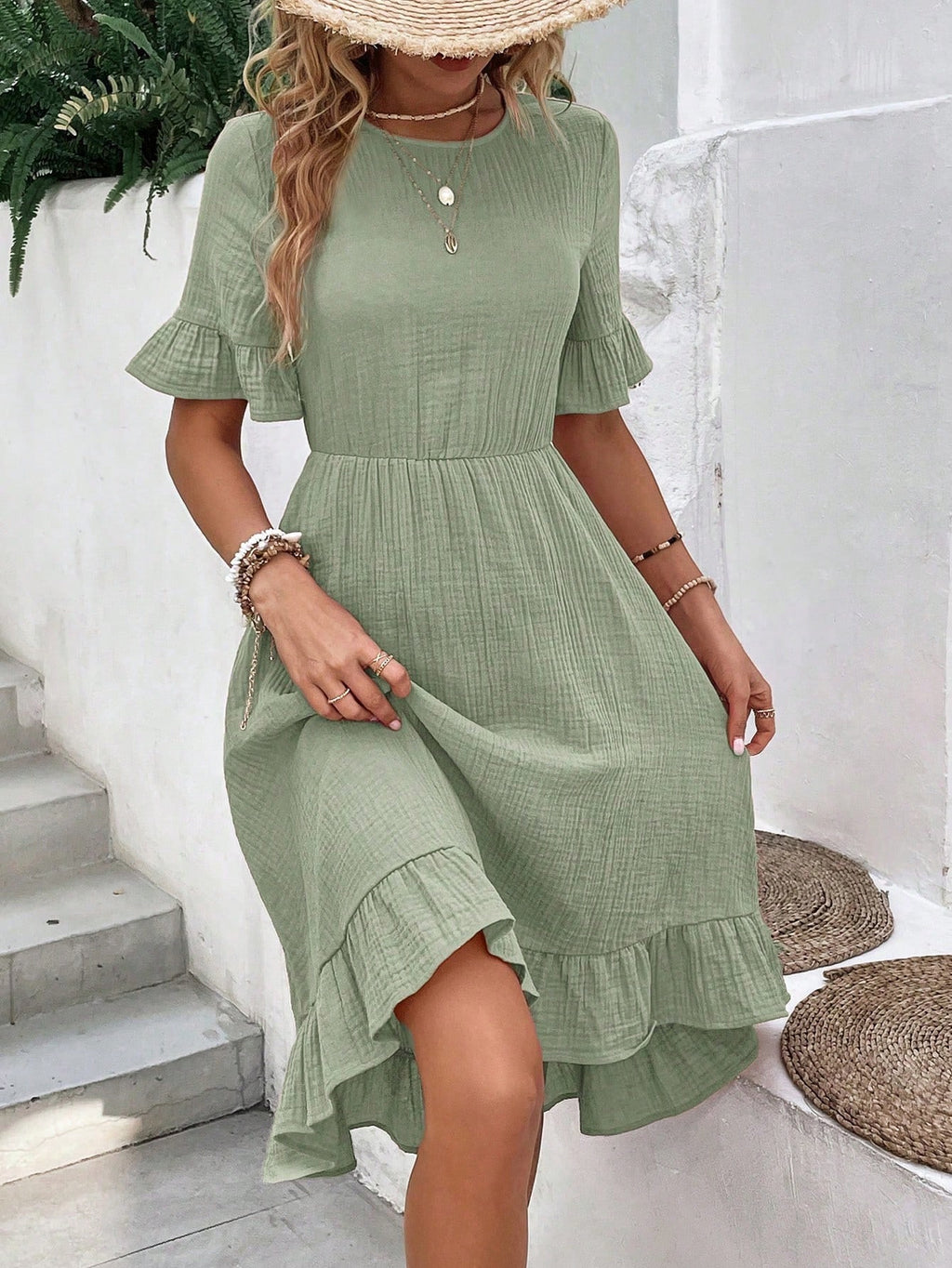 BELLAVOG Jednobojna haljina s volanima i rukavima, bez pojasa, haljina boje žalfije, pastelne haljine za žene