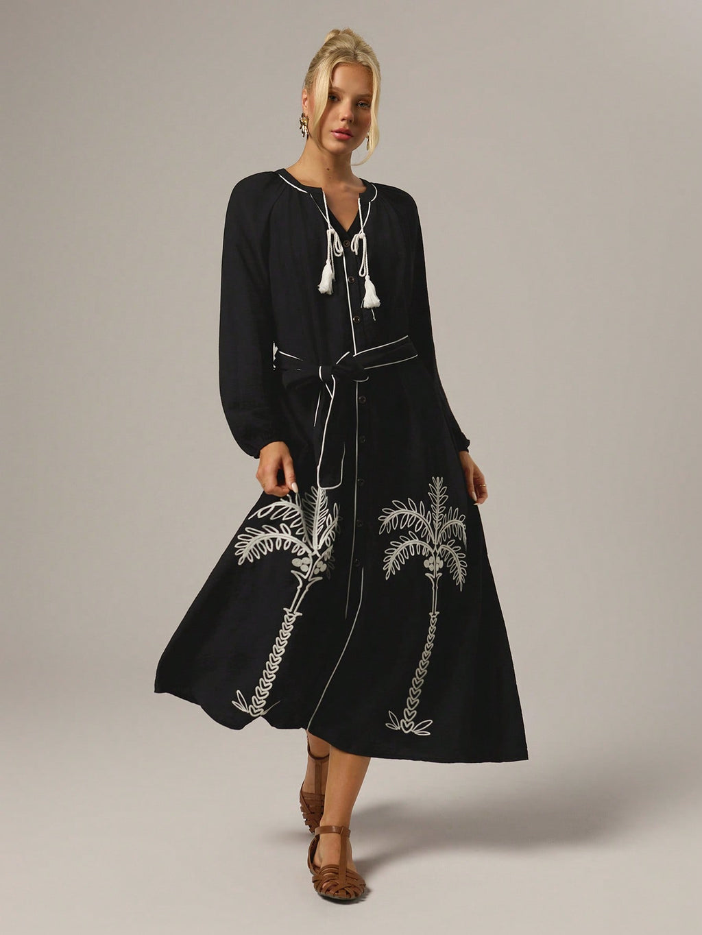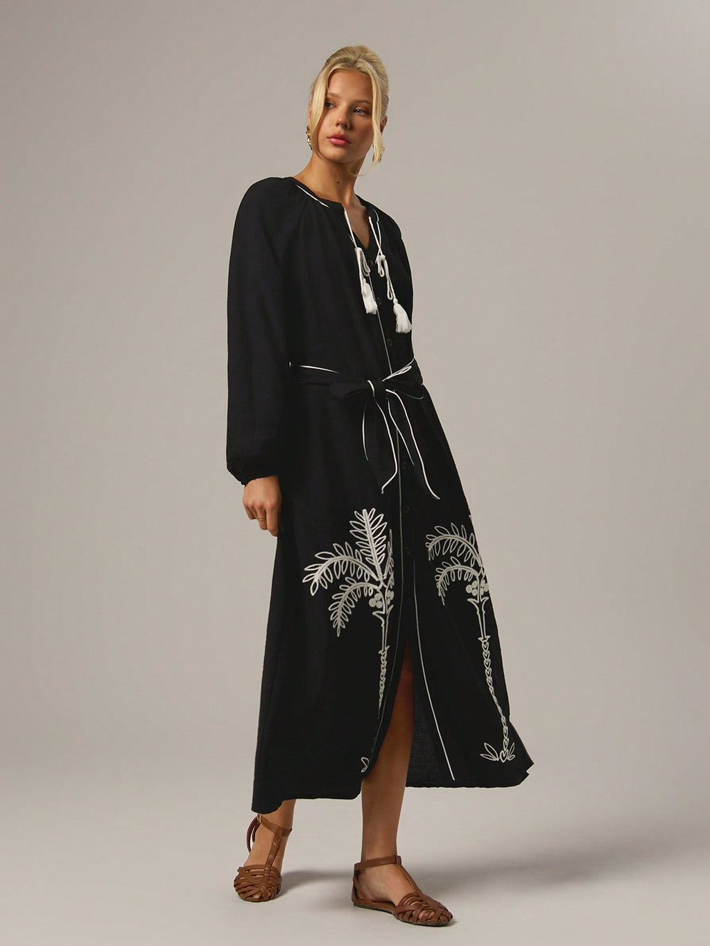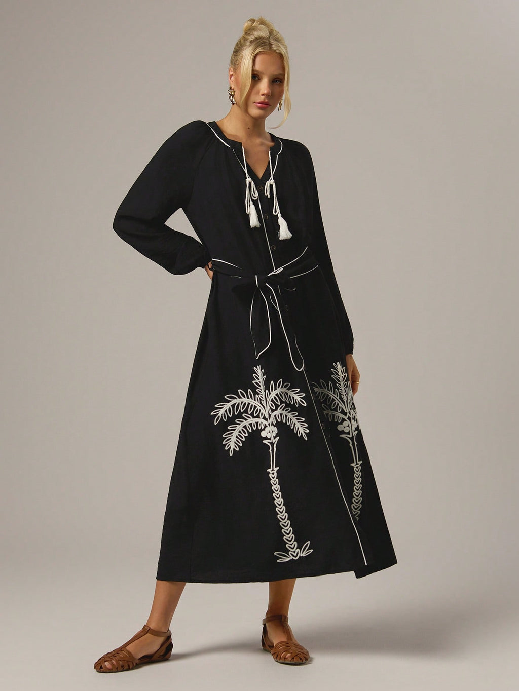 BELLAVOG Spring Seaside Romantic Vacation Palm Tree Embroidery V-Neck Lantern Sleeve Tie Waist Black Linen Dress For Women