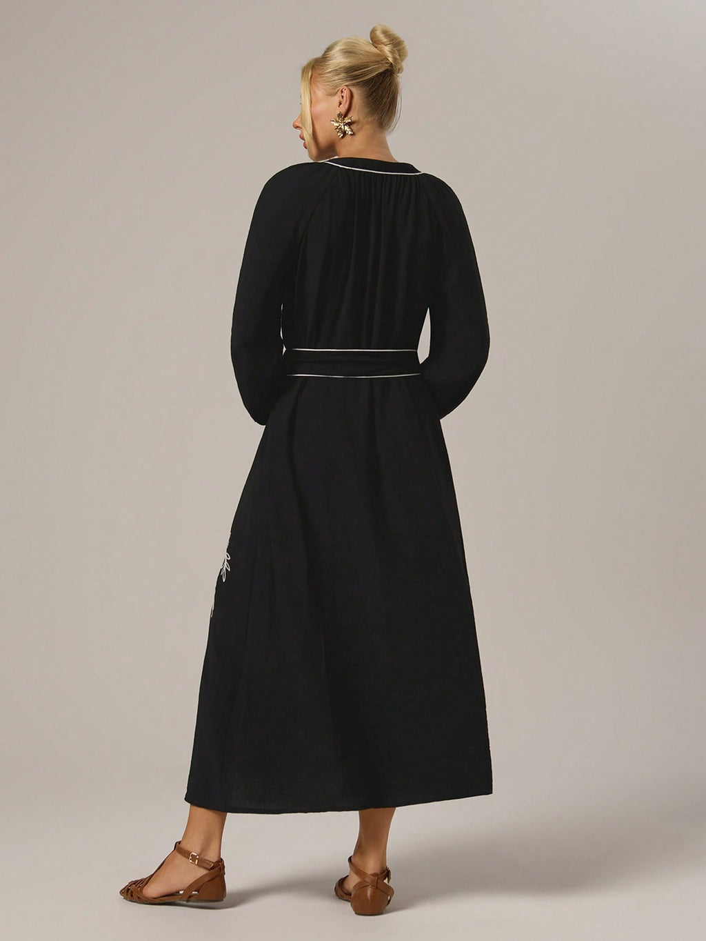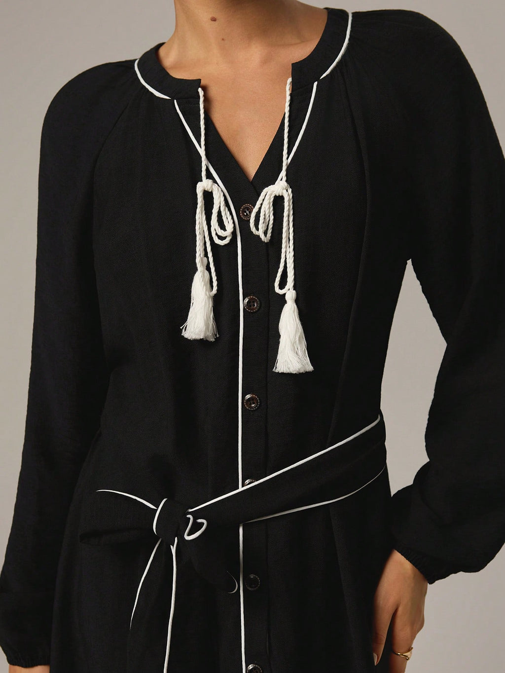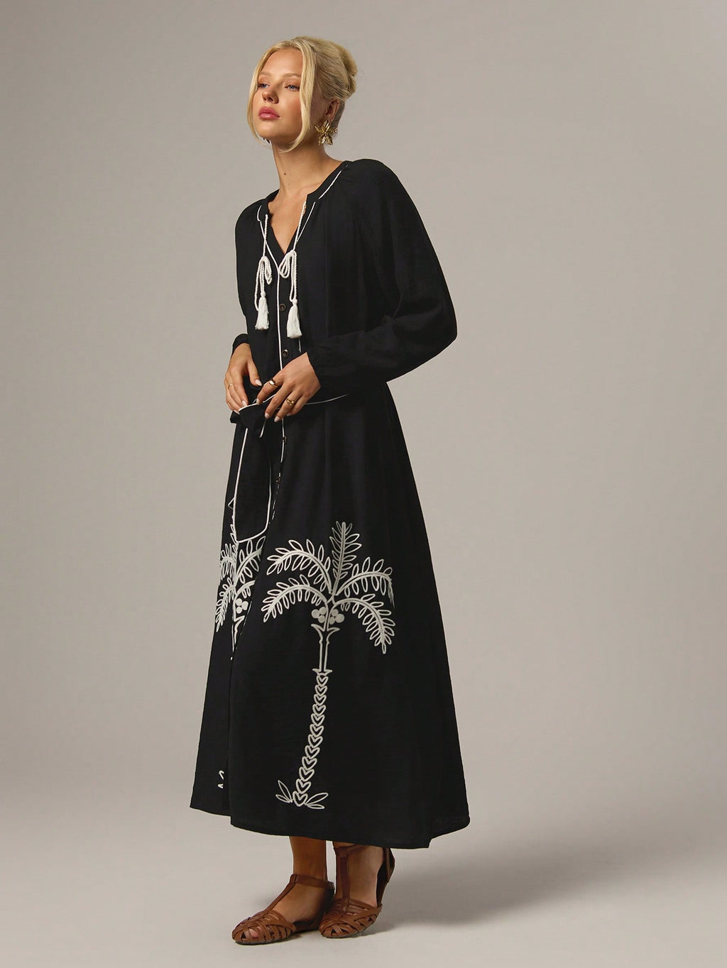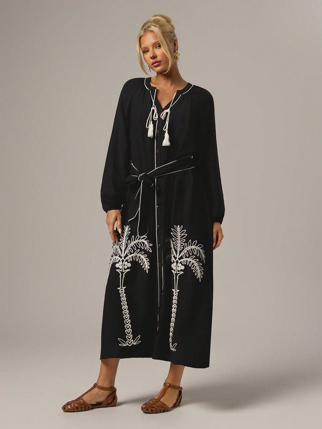 BELLAVOG Spring Seaside Romantic Vacation Palm Tree Embroidery V-Neck Lantern Sleeve Tie Waist Black Linen Dress For Women