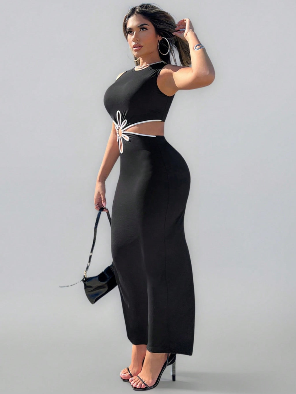 BELLAVOG Proljetne/ljetne kombinacije Boho Odmor Elegantna Ležerna Zapadnjačka Odjeća Muzički Festival Za Žene Crna Visoko rastezljiva Pletena Okrugli Izrez Bez Rukavova Boja Struka Kontrastna Izdubljena Duga Haljina