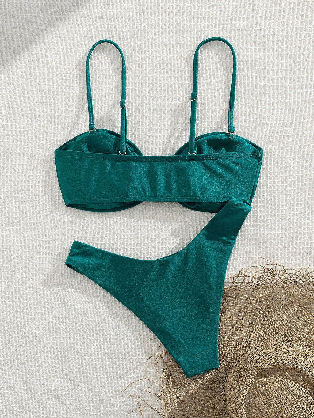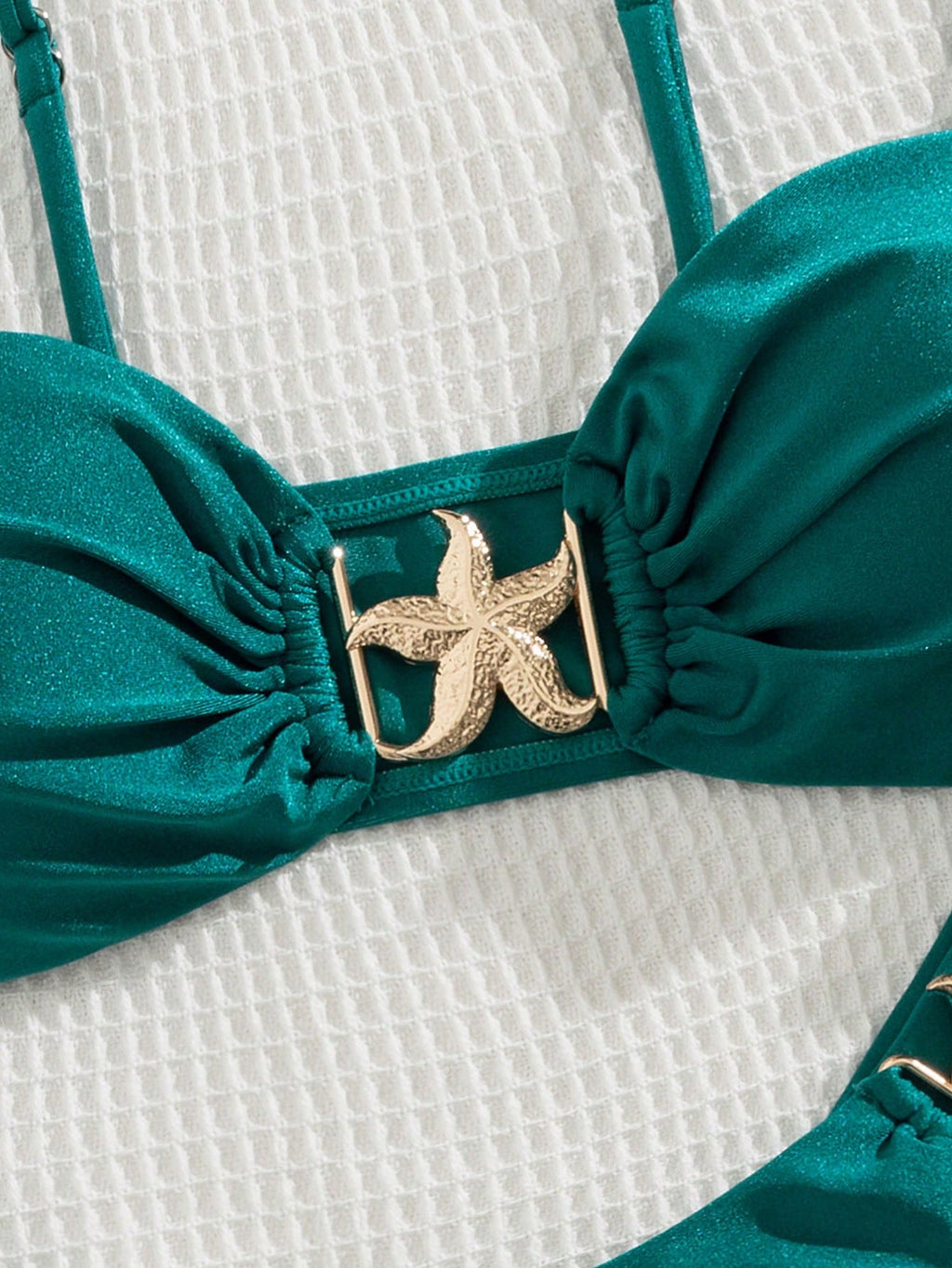 BELLAVOG Ljetni set od 2 komada/seta, vodeno plave boje, jednobojni metalik zvjezdani dekor, vezivanje, dvostrani bandeau bikini set za žene, odmor