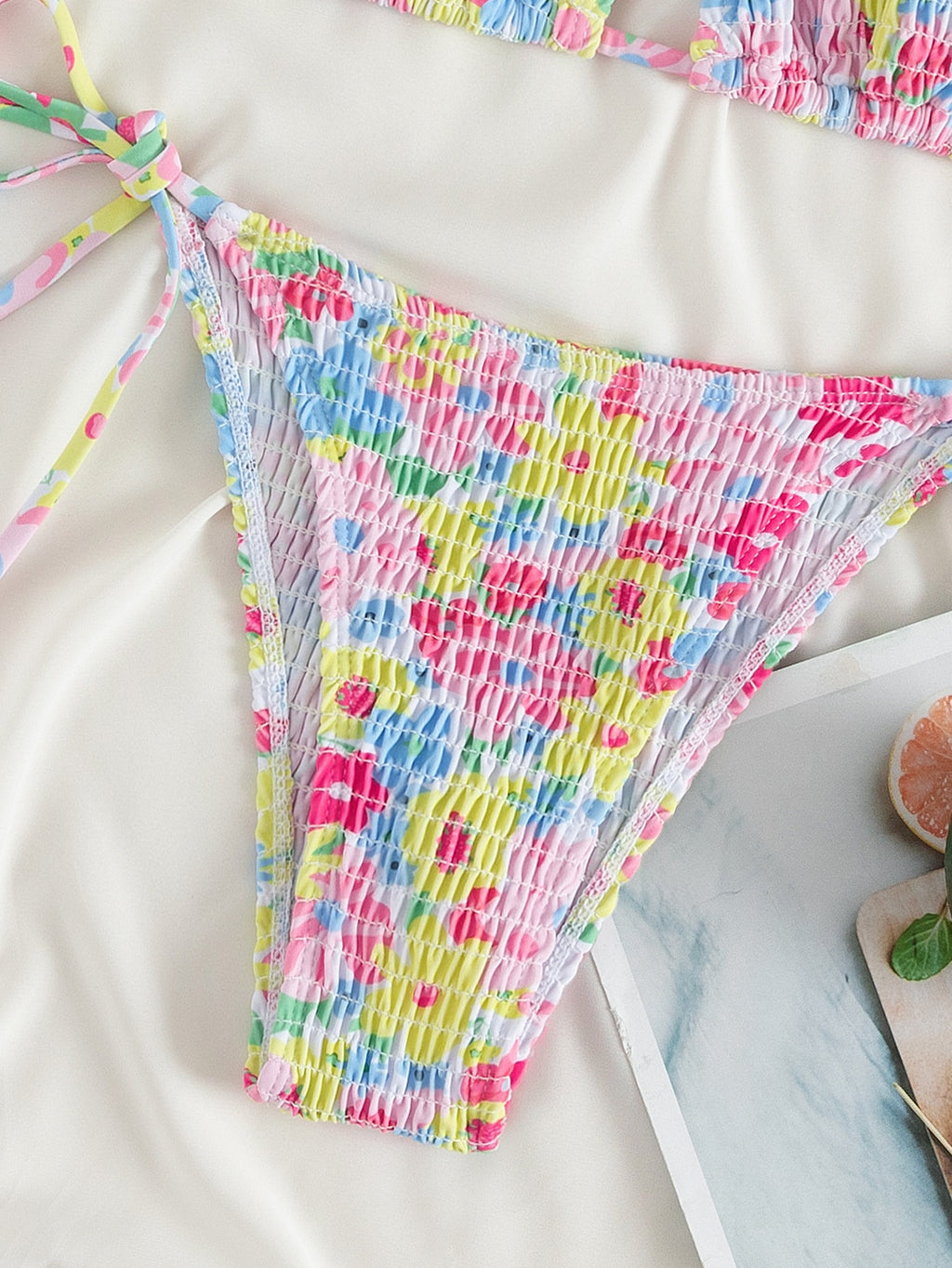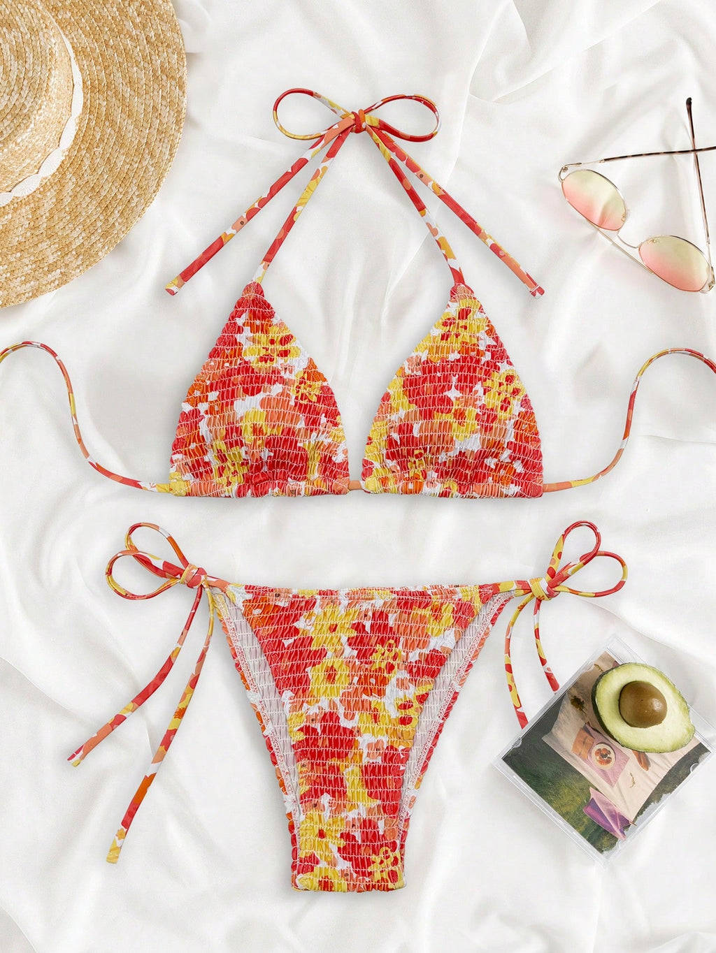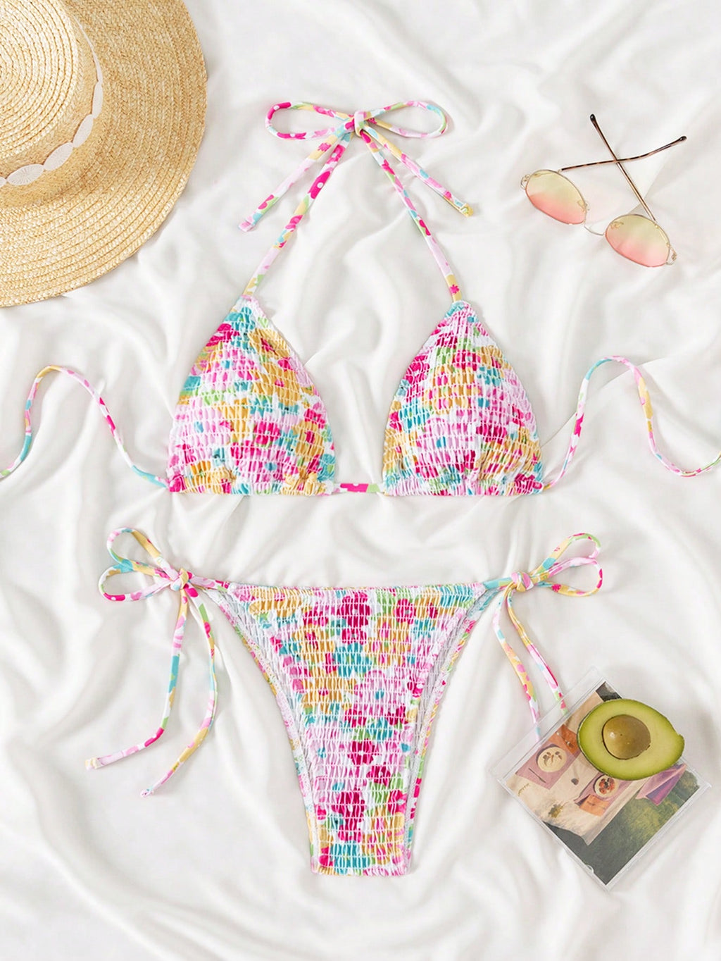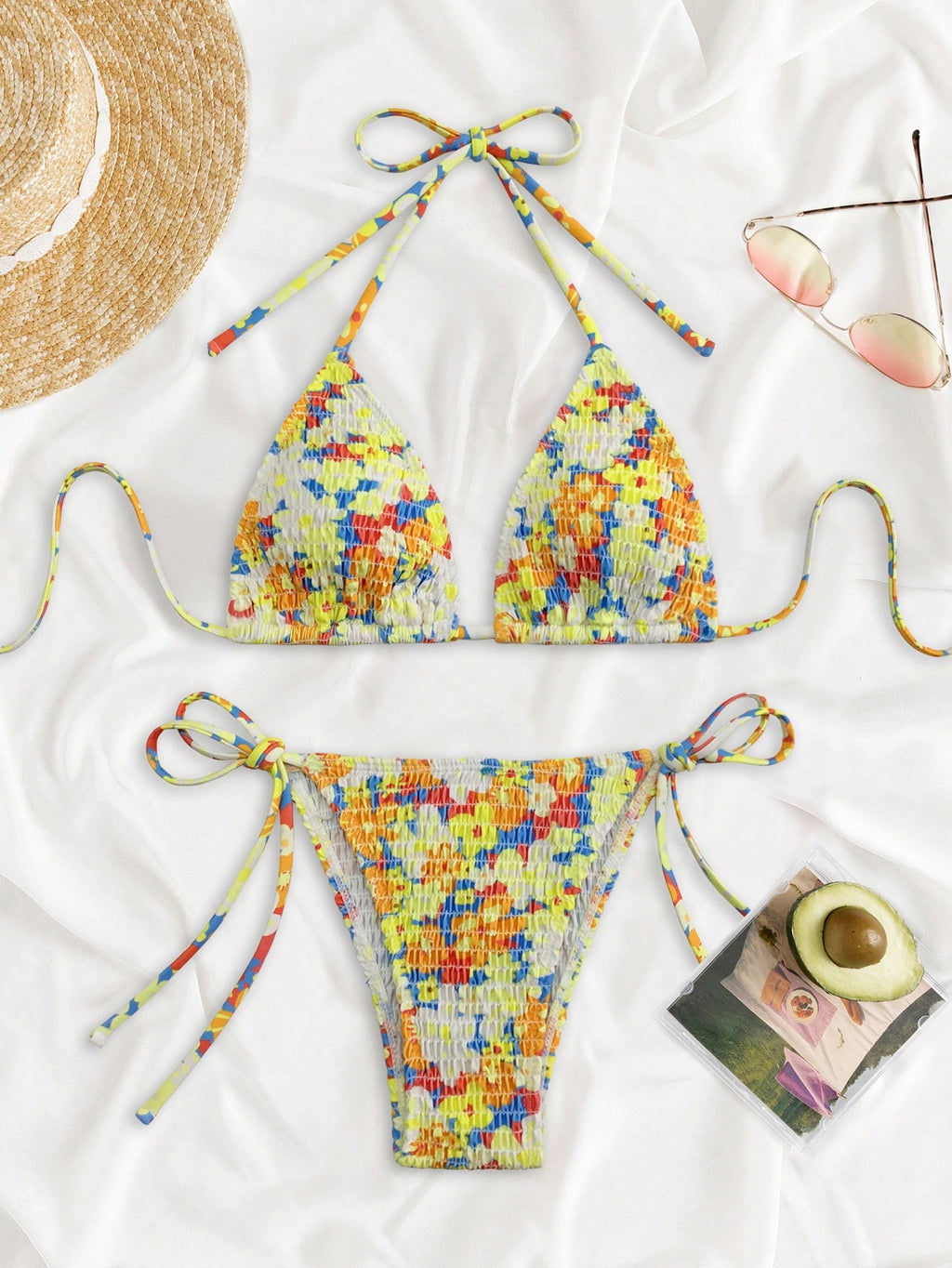 BELLAVOG Ljetni bikini set s cvjetnim printom i nasumičnim uzorkom za plažu, trokutasti grudnjak s naborima