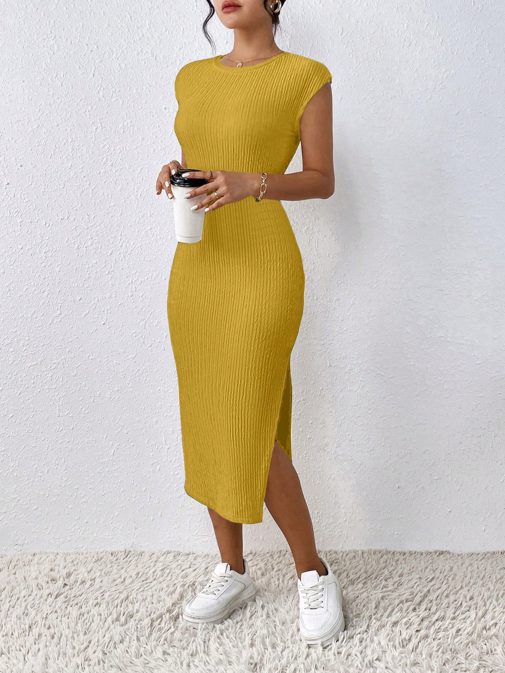 BELLAVOG Ljetna haljina za slobodno vrijeme s bočnom podjelom, uska uska haljina, pletena rebrasta ležerna ljetna haljina, haljina za učiteljicu s kratkim rukavima