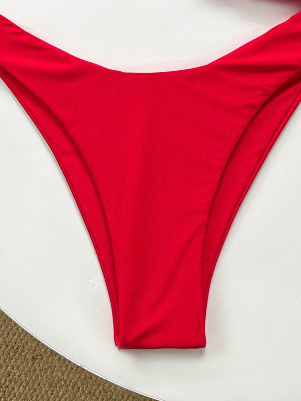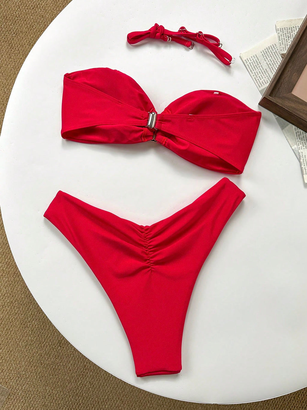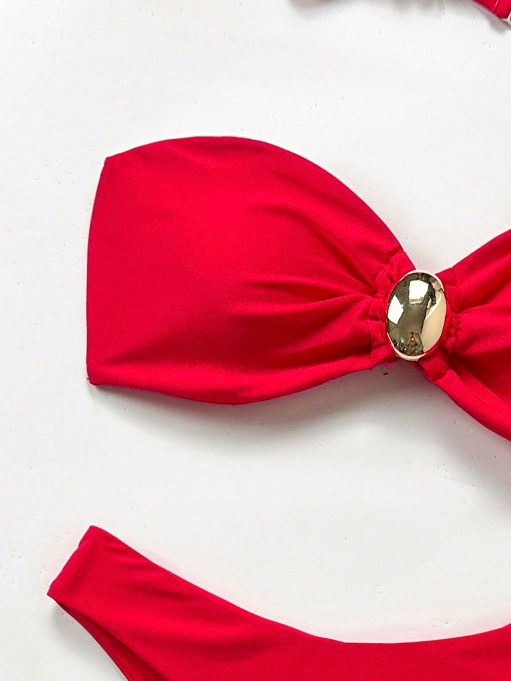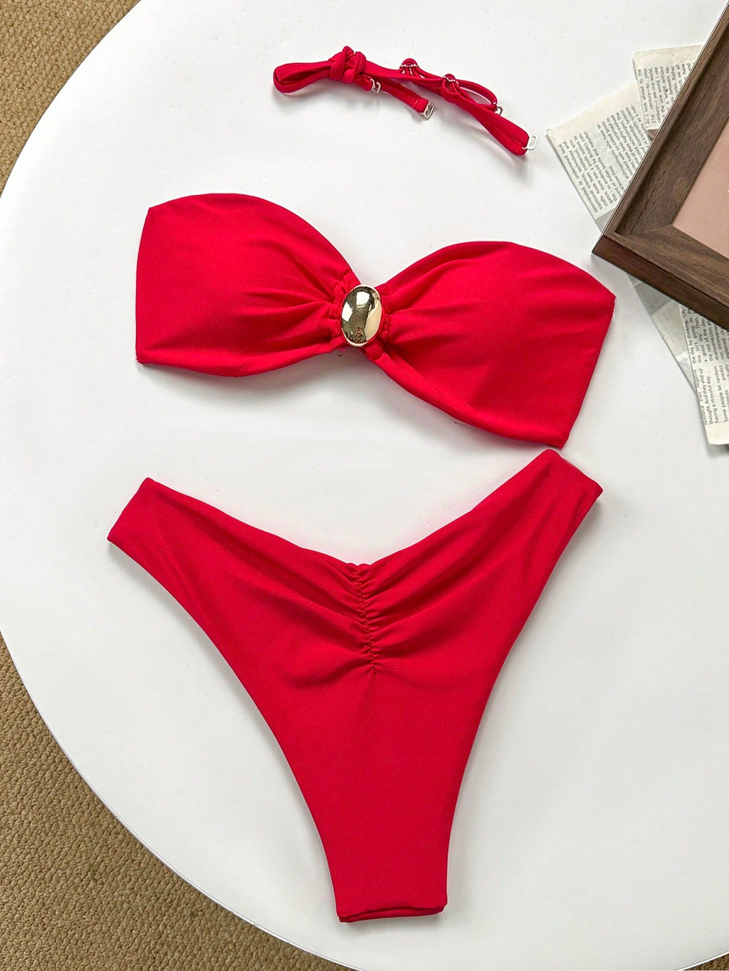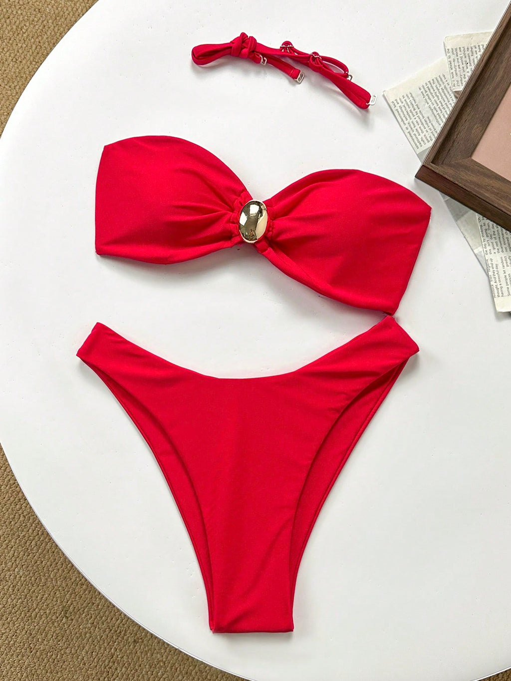 BELLAVOG Summer Women's Solid Color Bustier Bikini Set With Metal Decor, Spaghetti Strap, Sexy