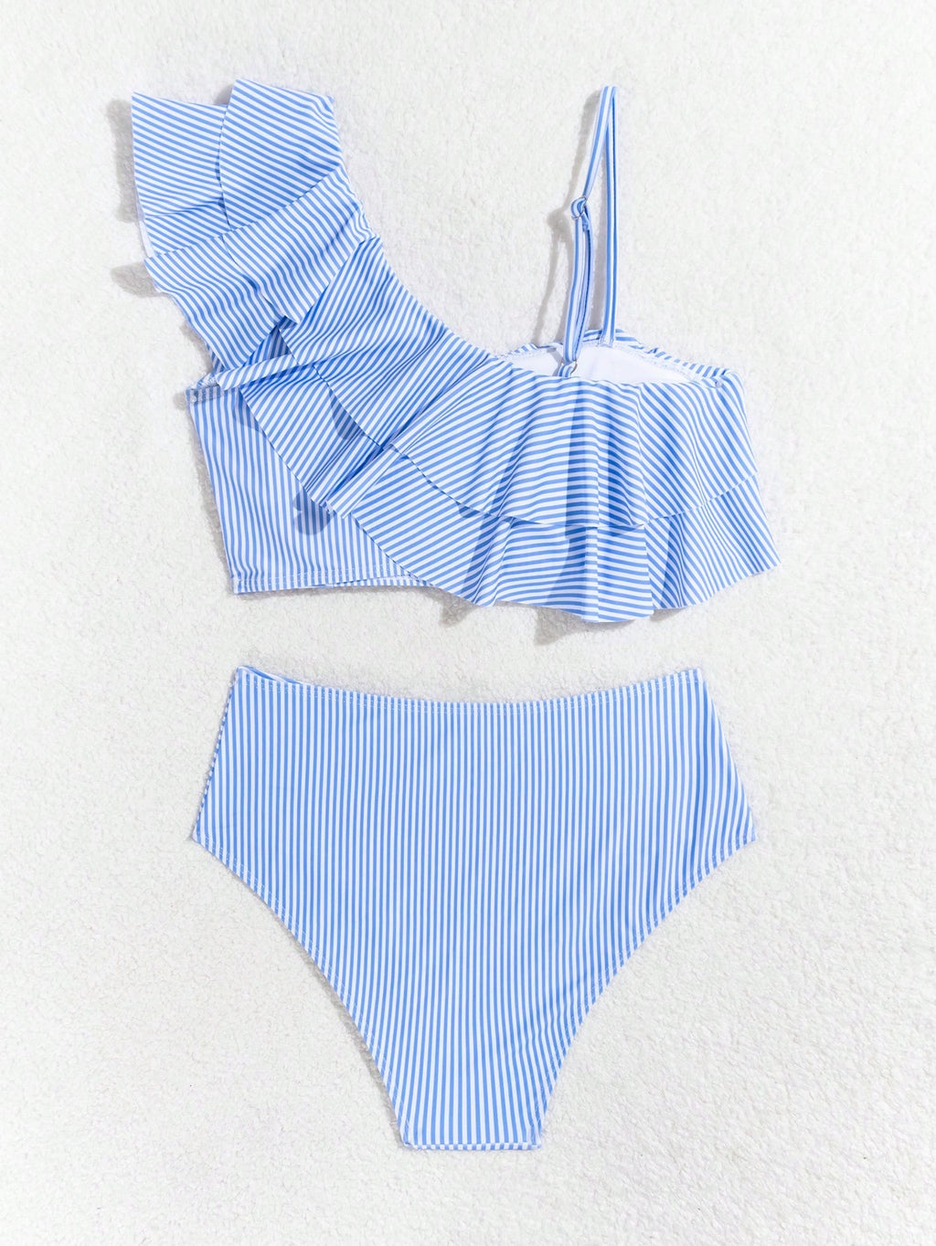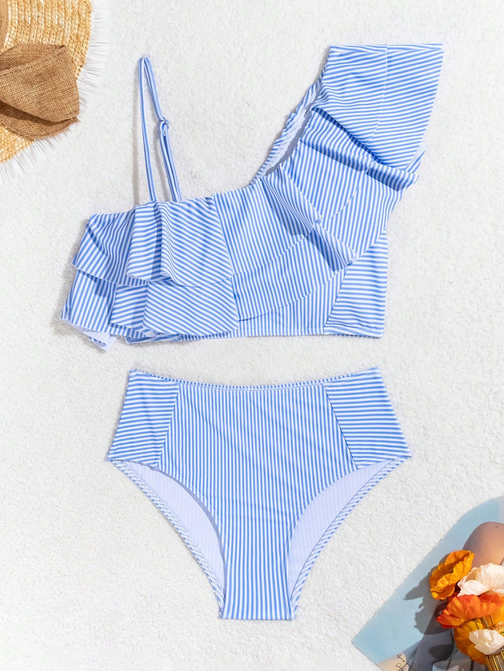 BELLAVOG Ženski ljetni set kupaćih kostima s prugastim volanima, asimetričnim gornjim dijelom i donjim dijelom bikinija