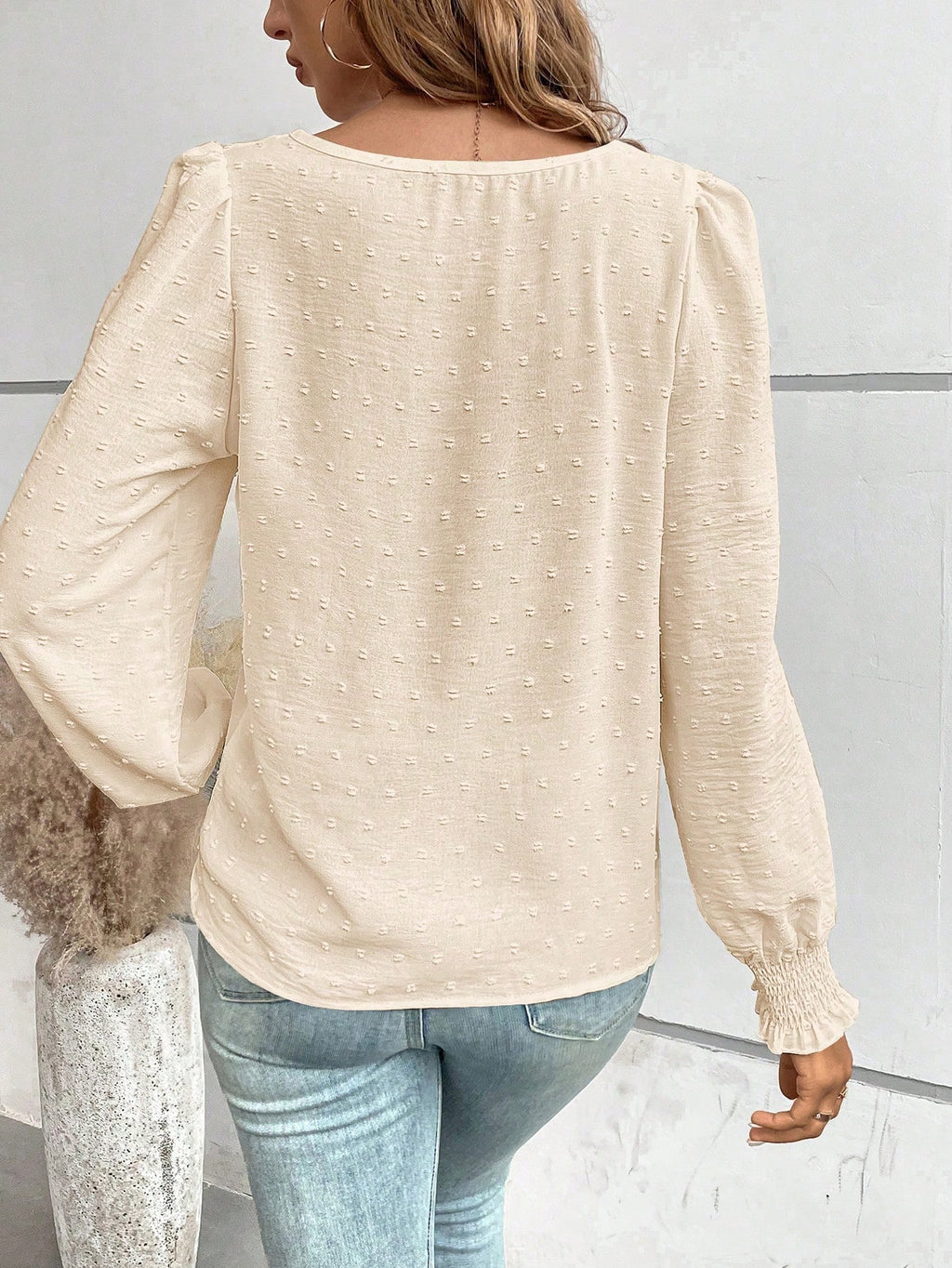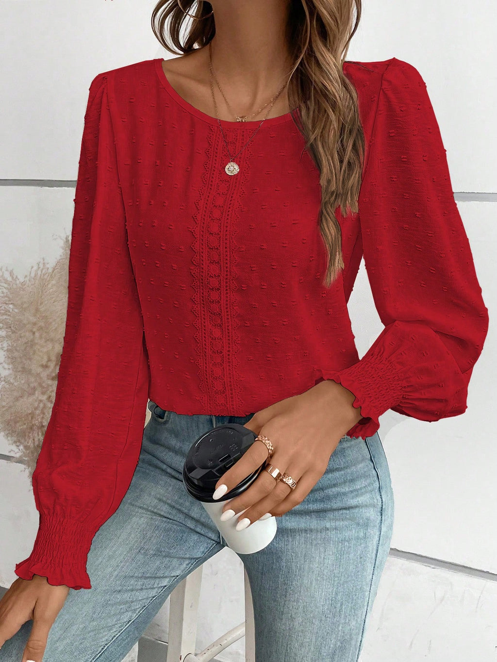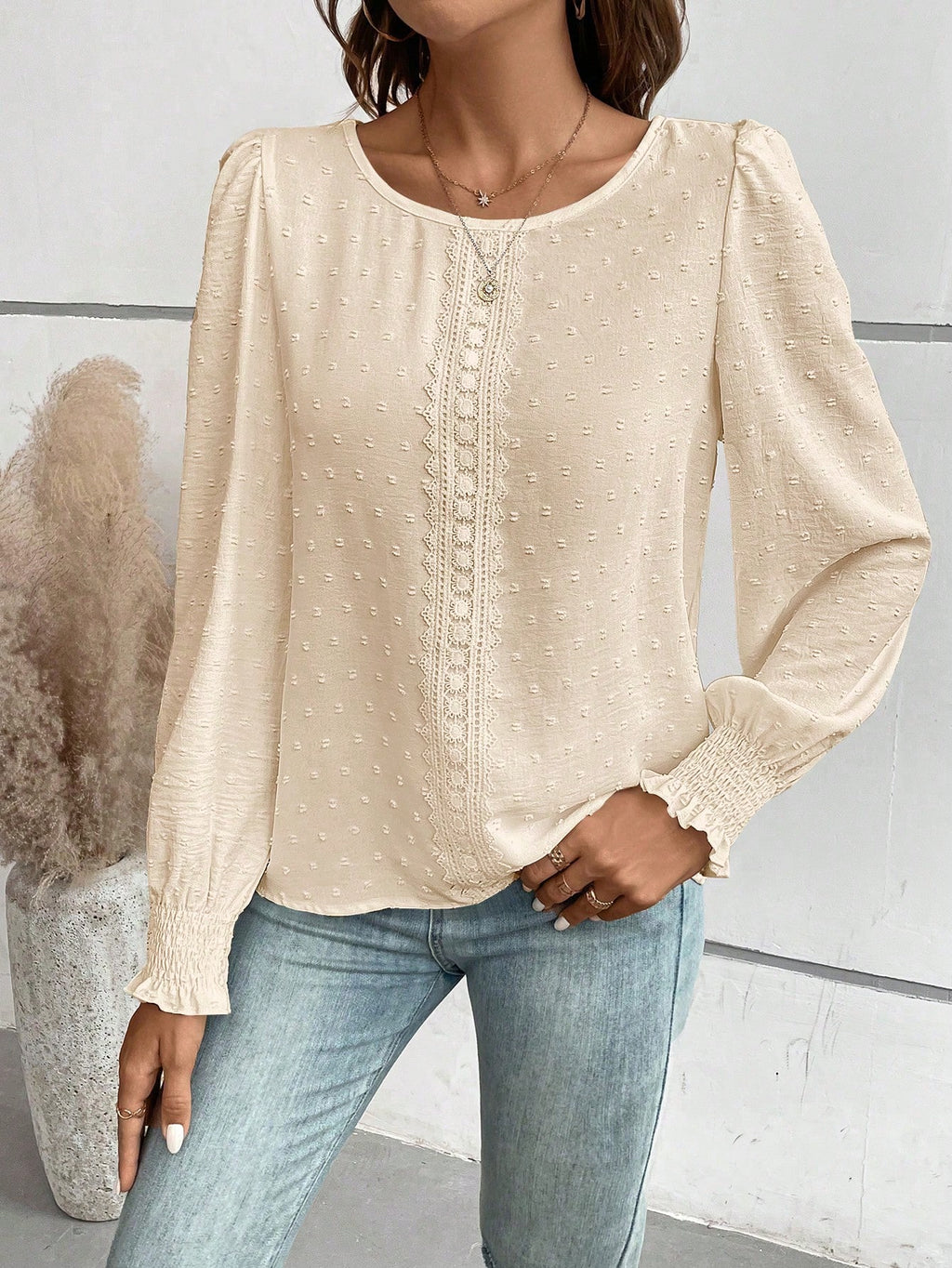 BELLAVOG Swiss Dot Guipure Lace Insert Lantern Sleeve Blouse,Ladies Casual Contrast Lace,Frill,Shirred Long Sleeve Round Neck Regular Fit Regular Apricot Bishop Sleeve Top Women Blouses,Spring/Fall ,Casual Daily Wear