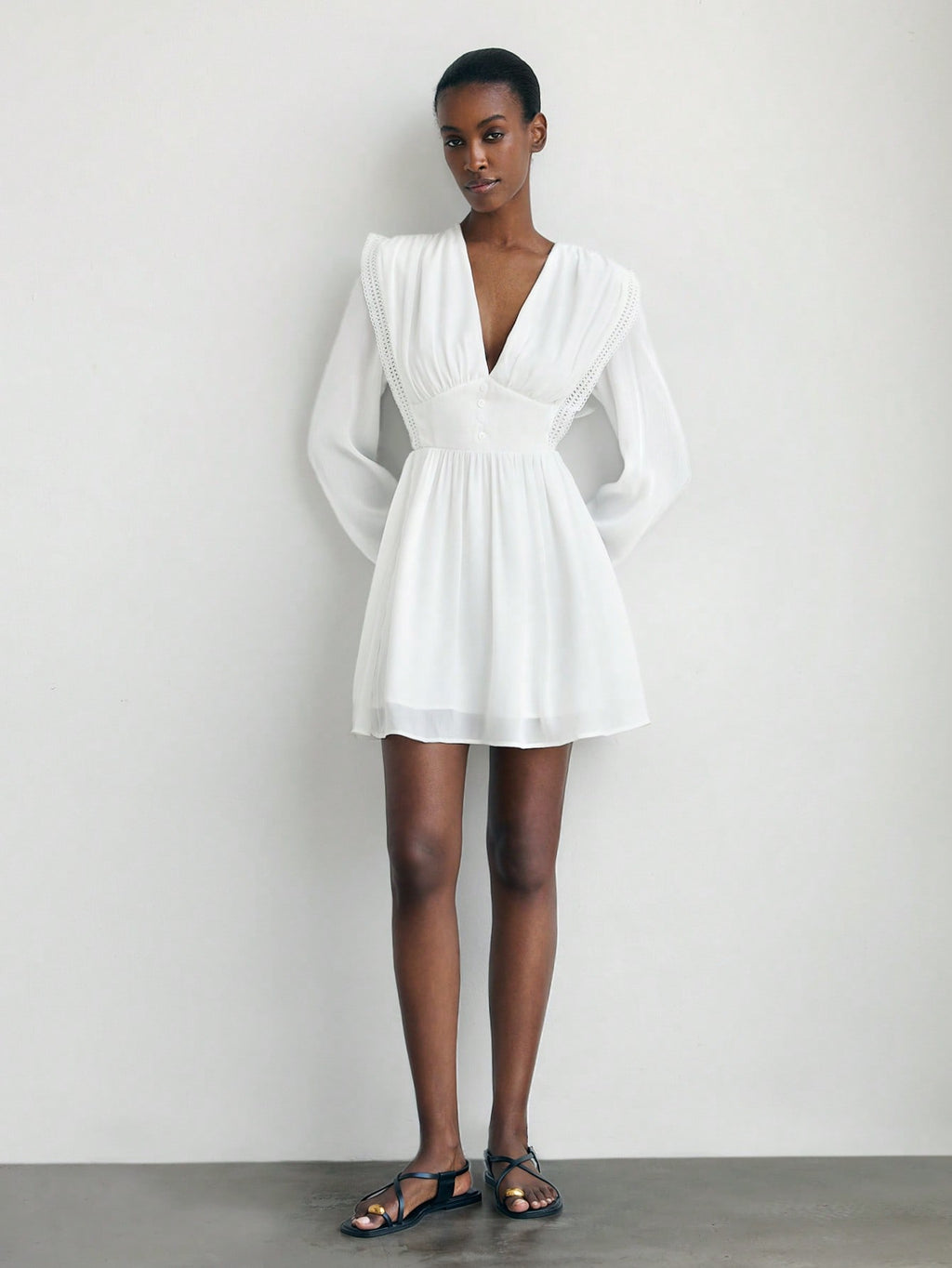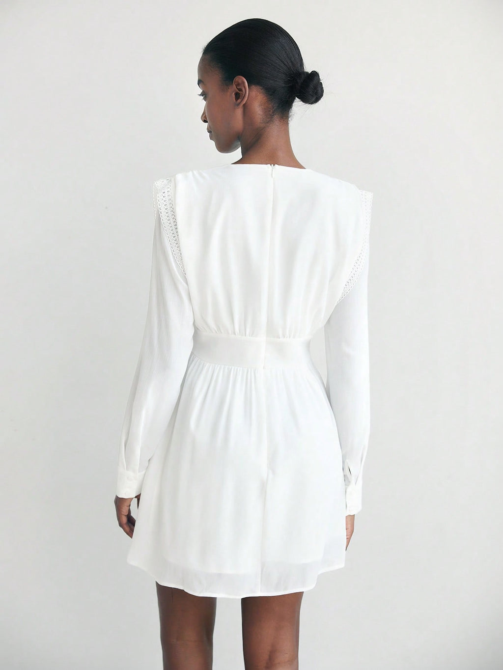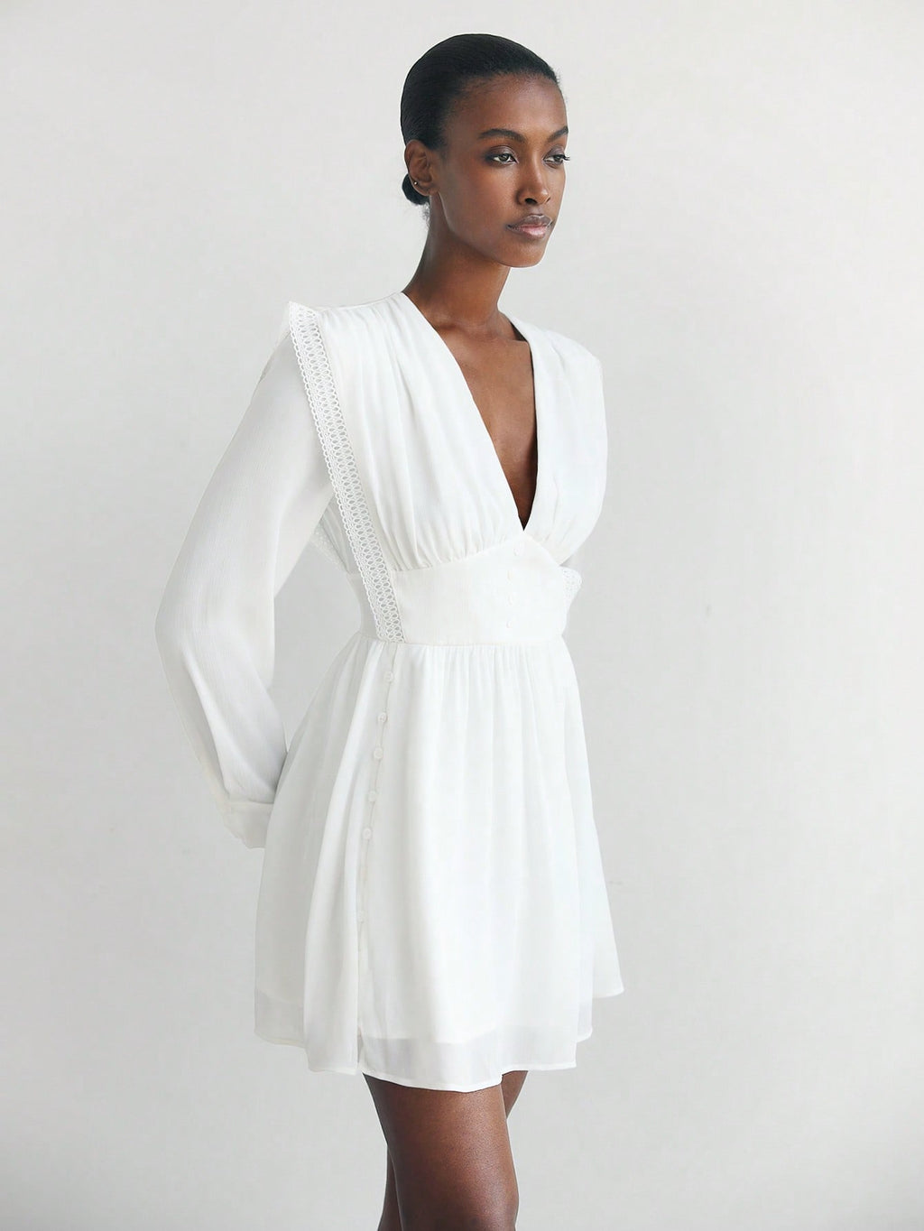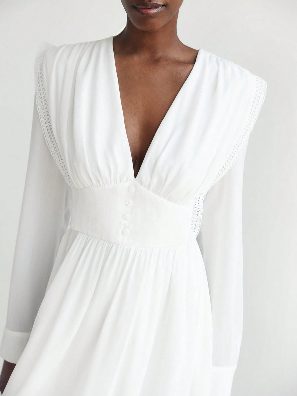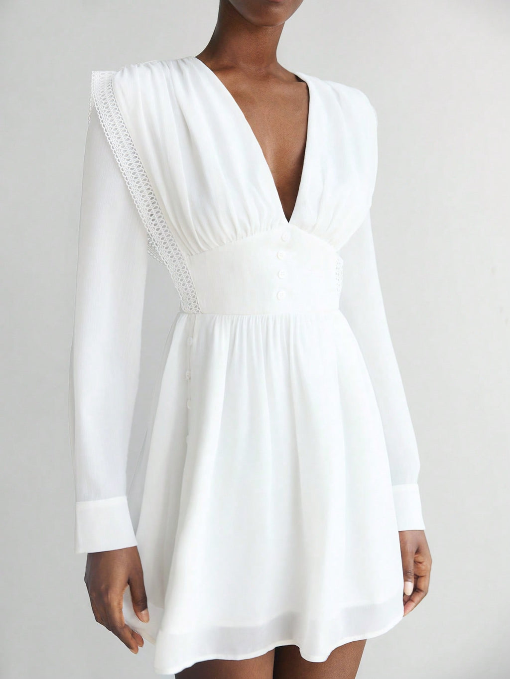 BELLAVOG Vacation Style Lace Patchwork V-Neck White Women Short Dress, Music Festival