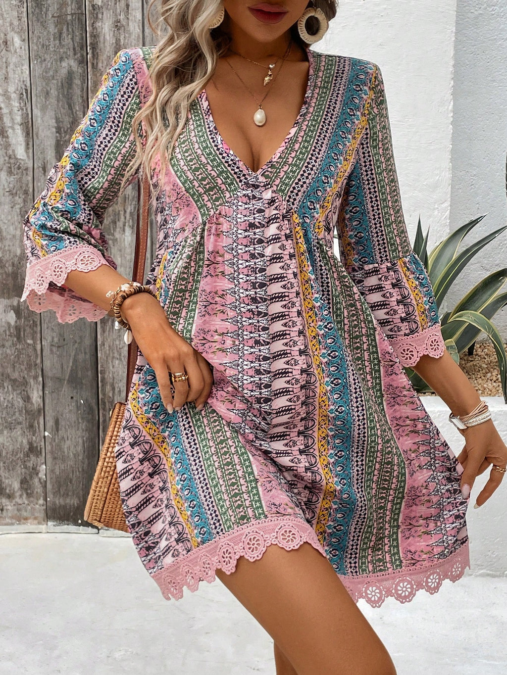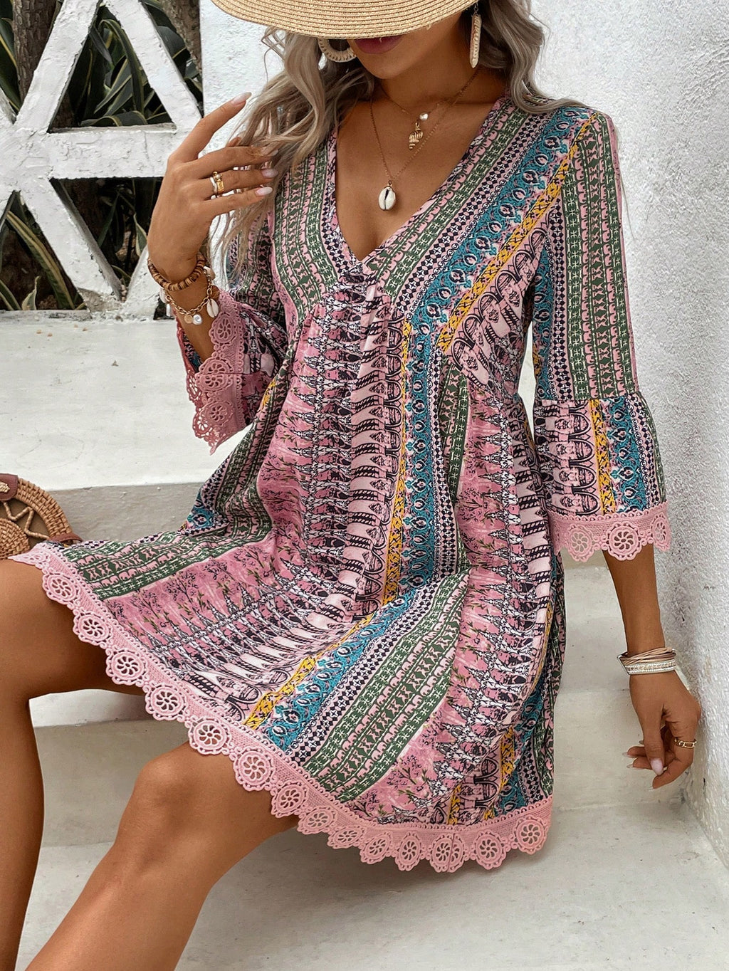 BELLAVOG Vintage haljina za odmor s dubokim V-izrezom, čipkom i cvjetnim printom