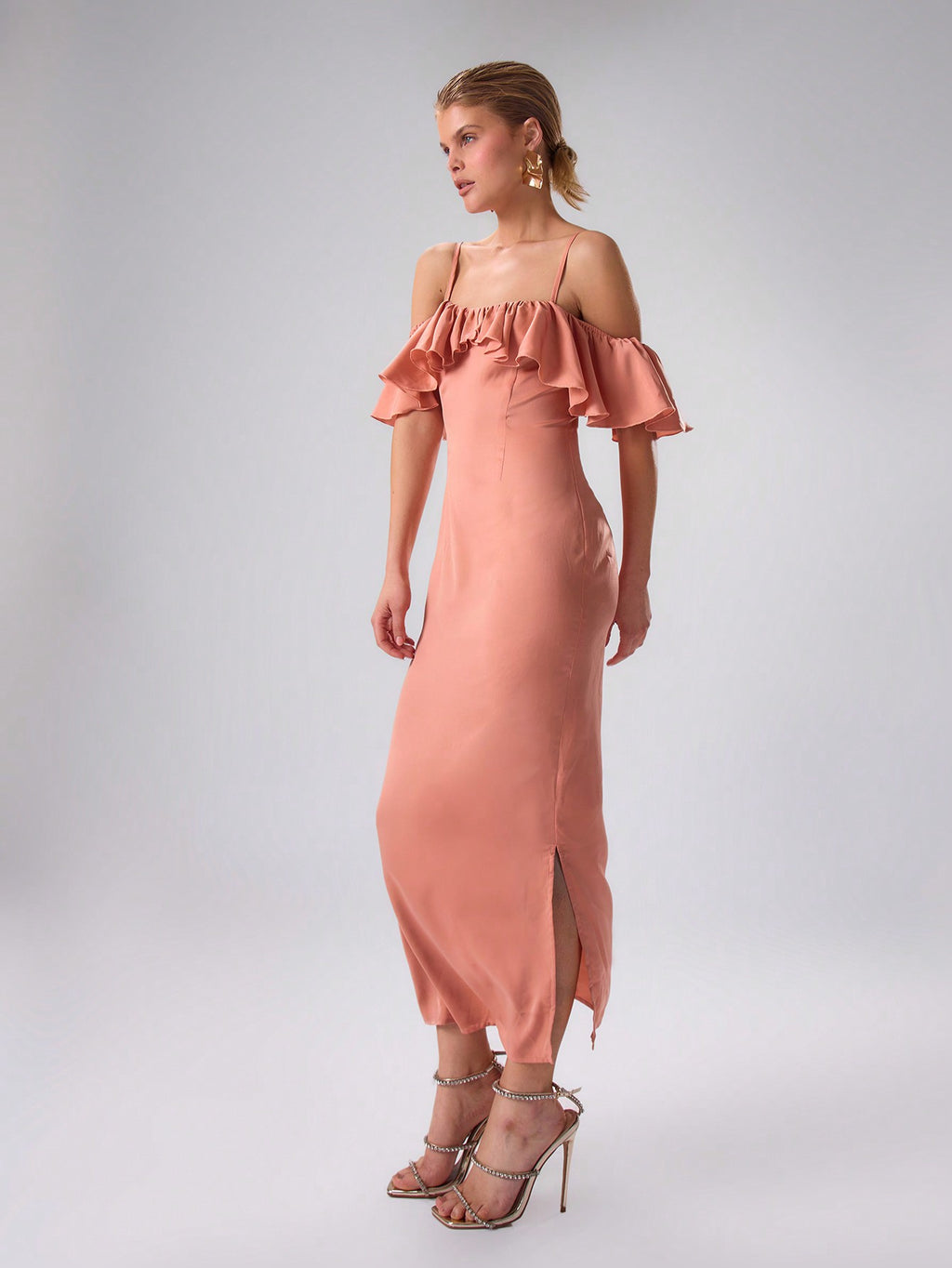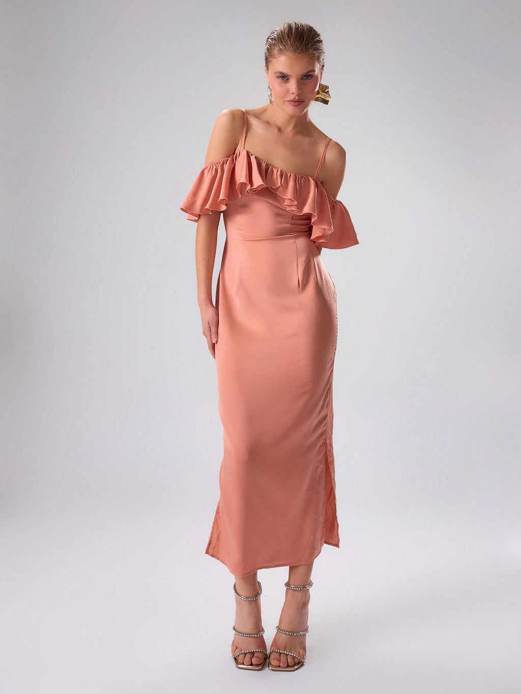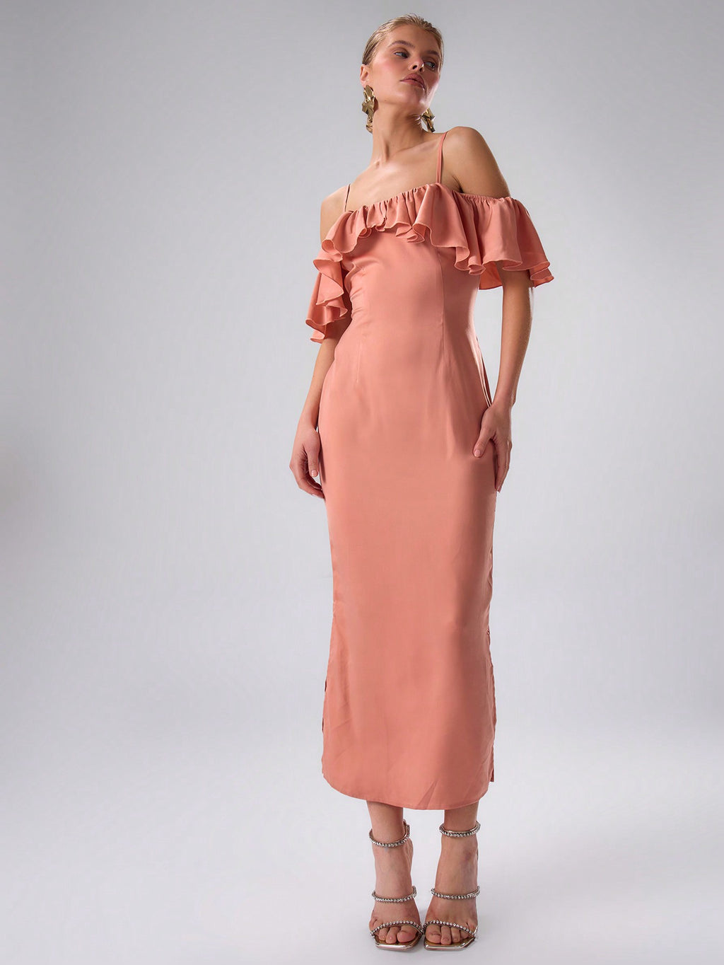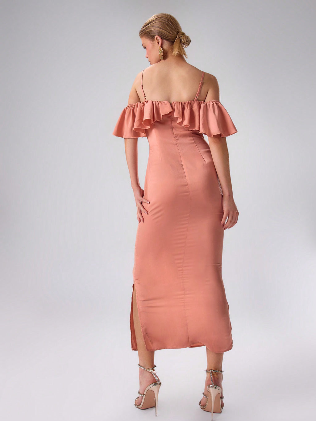 MIU ženska duga ljetna haljina jednobojna s volanima i otvorenim ramenima — elegantna, idealna za proljetne i ljetne zabave, odmor i svečane prilike.