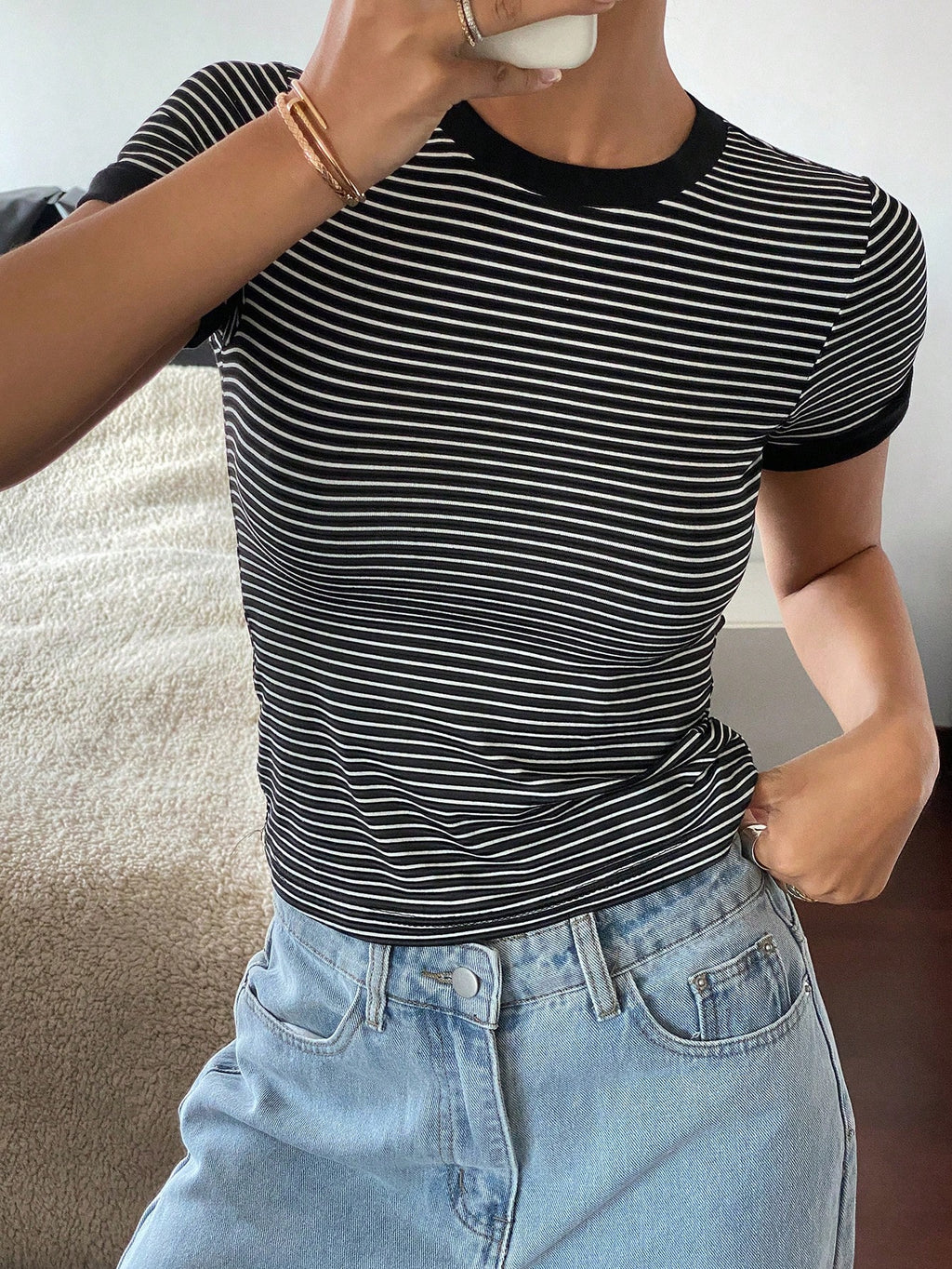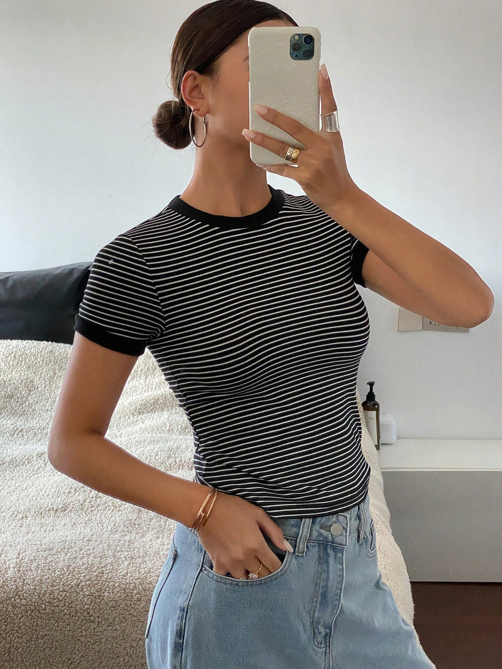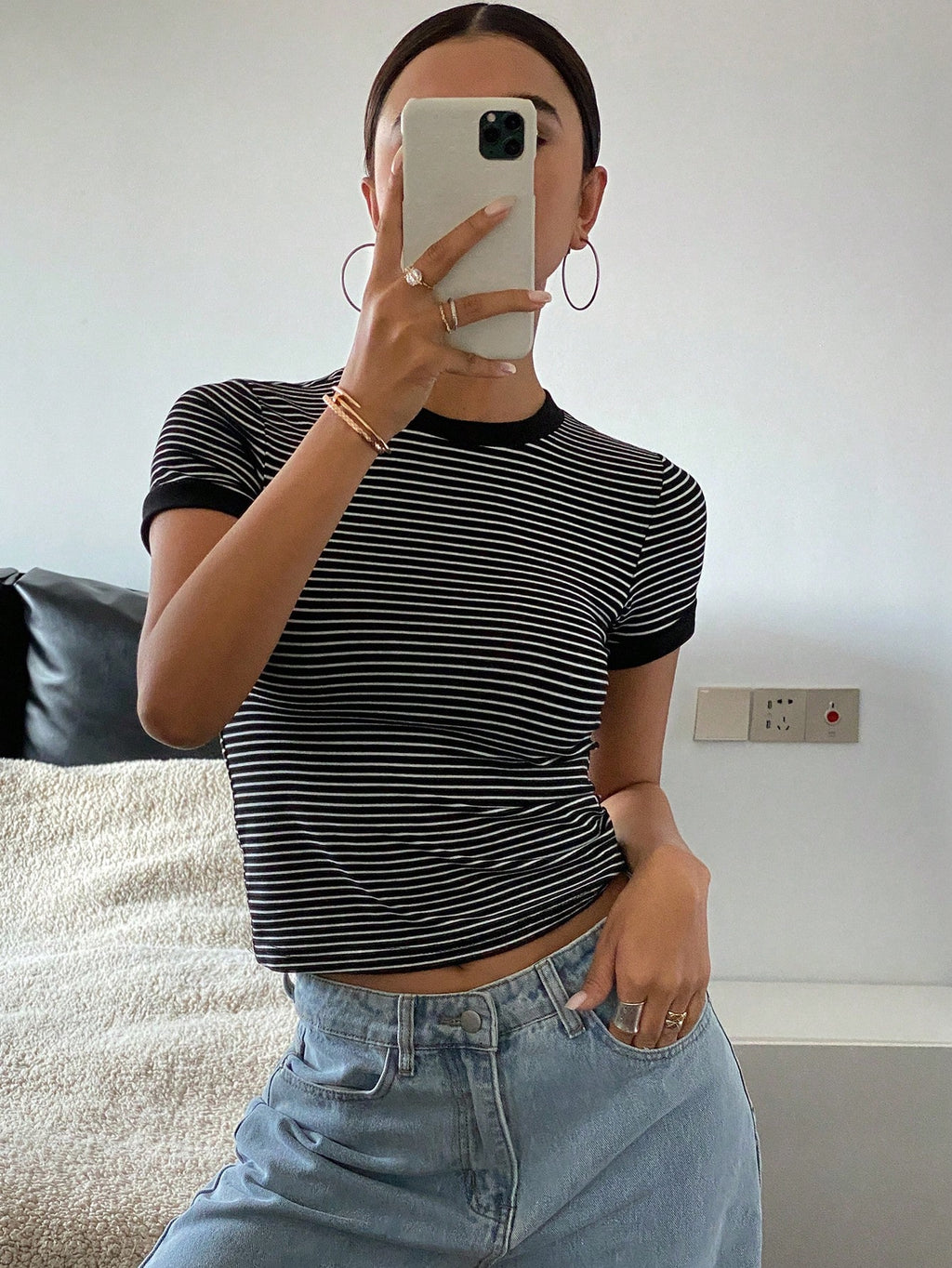 BELLAVOG Ženska prugasta majica kratkih rukava uskog kroja, minimalistički stil za ležerno svakodnevno nošenje