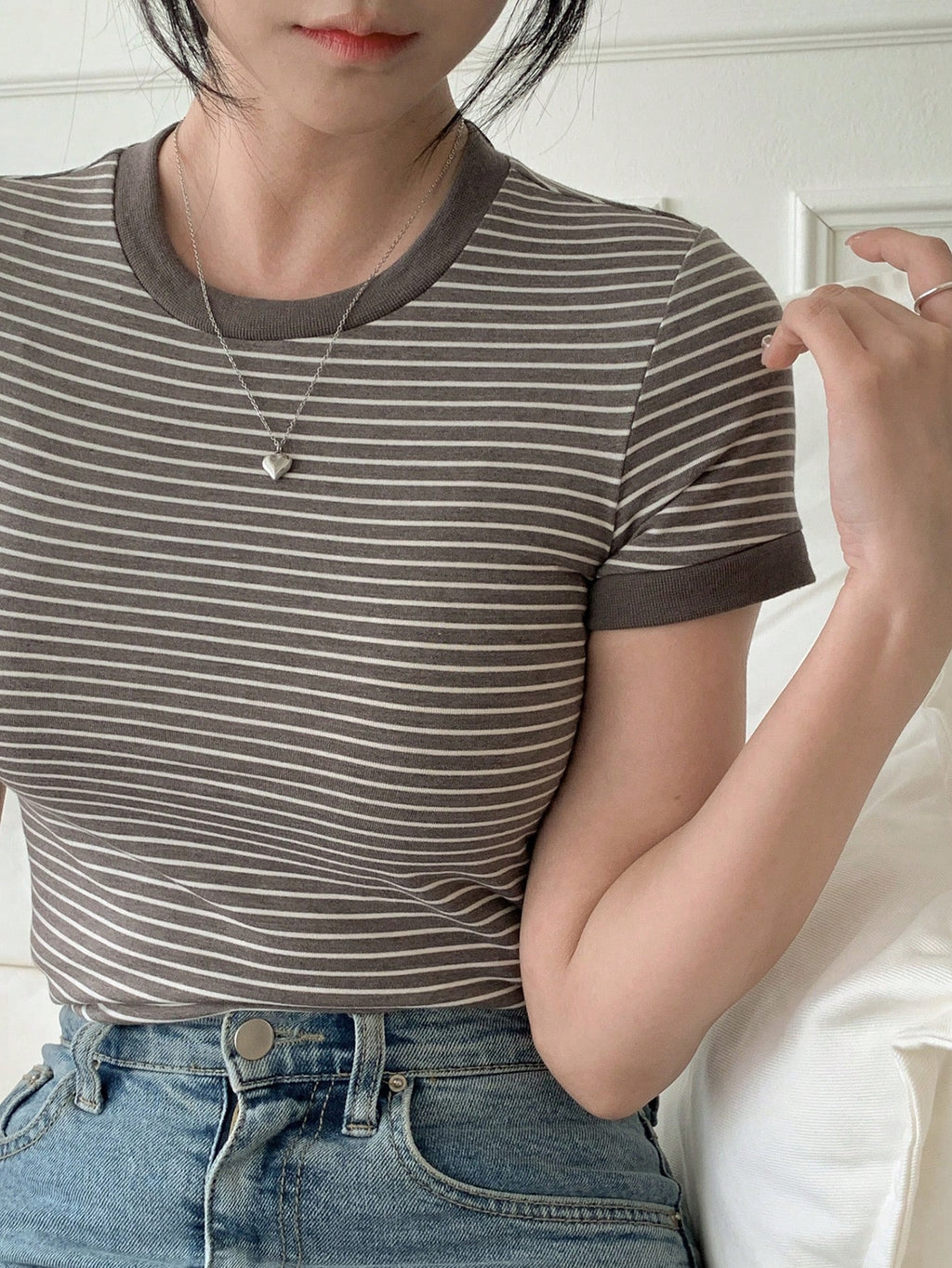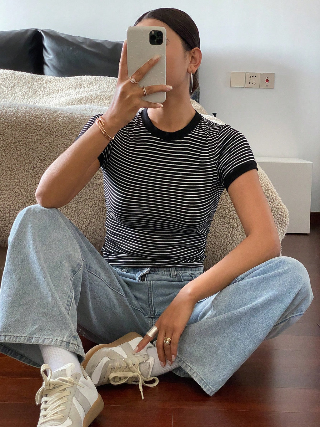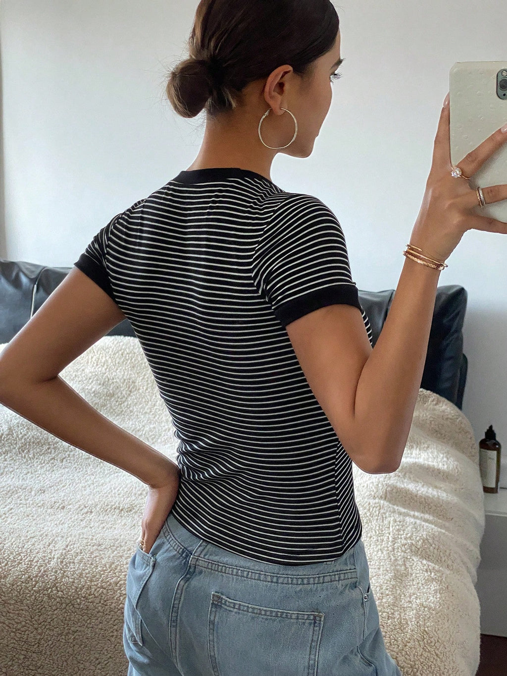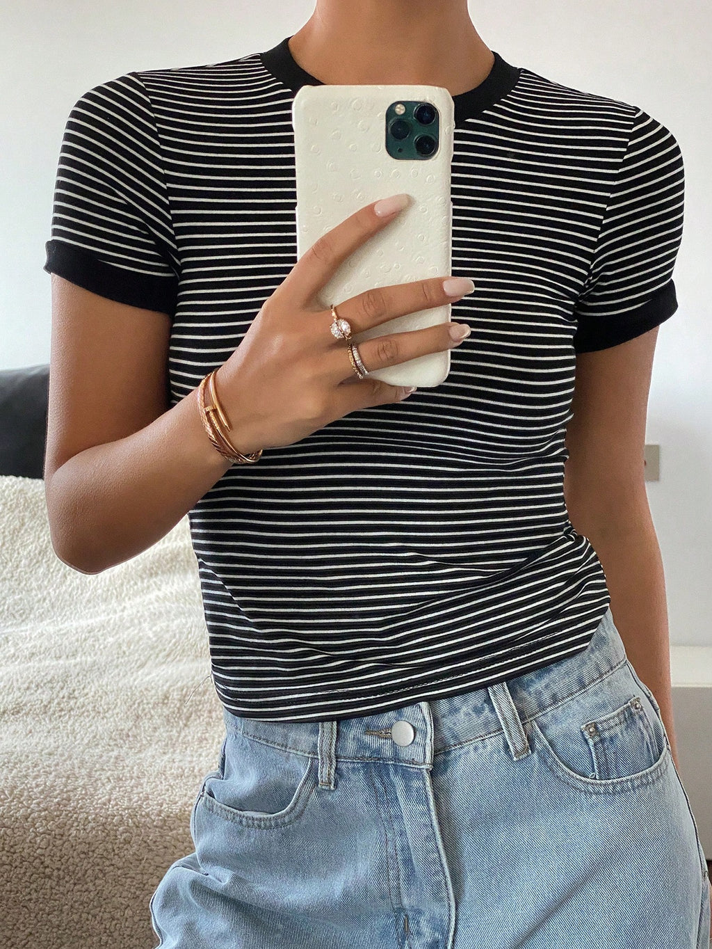 BELLAVOG Ženska prugasta majica kratkih rukava uskog kroja, minimalistički stil za ležerno svakodnevno nošenje