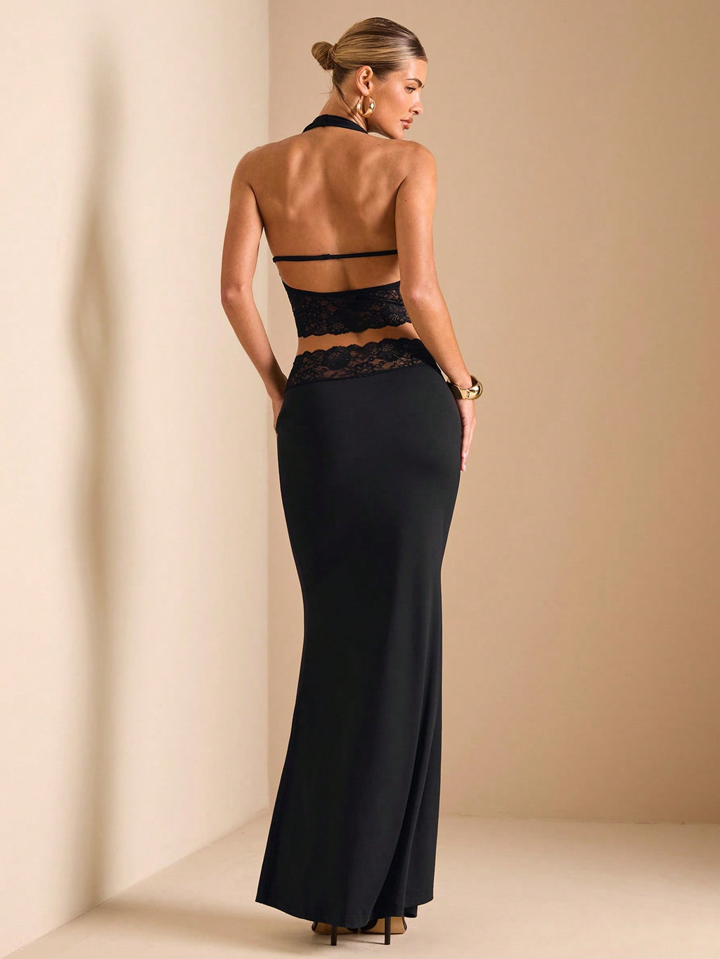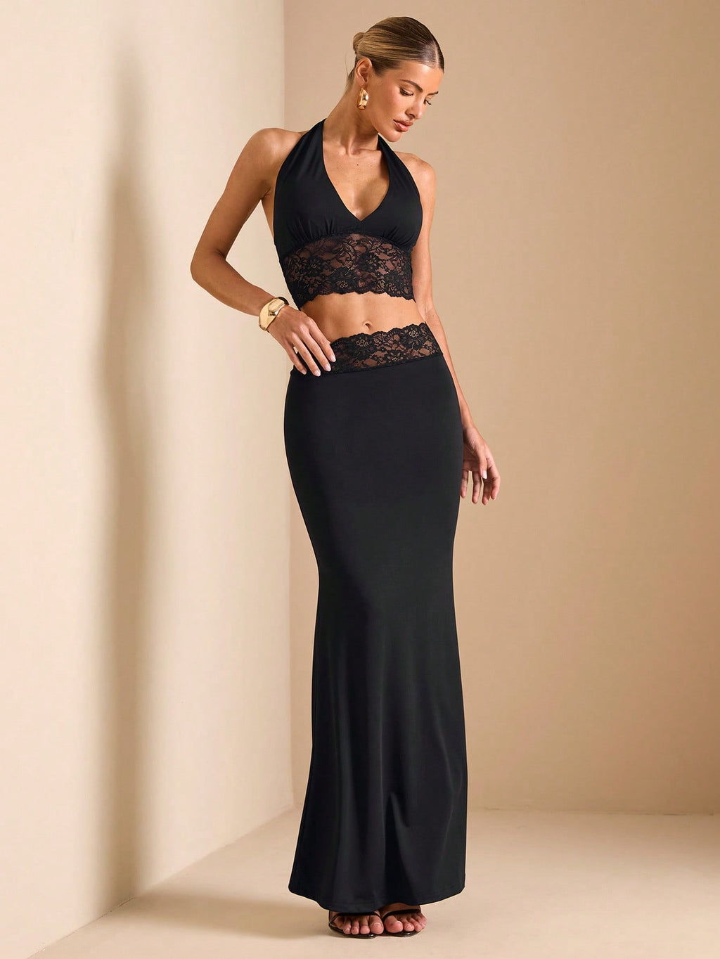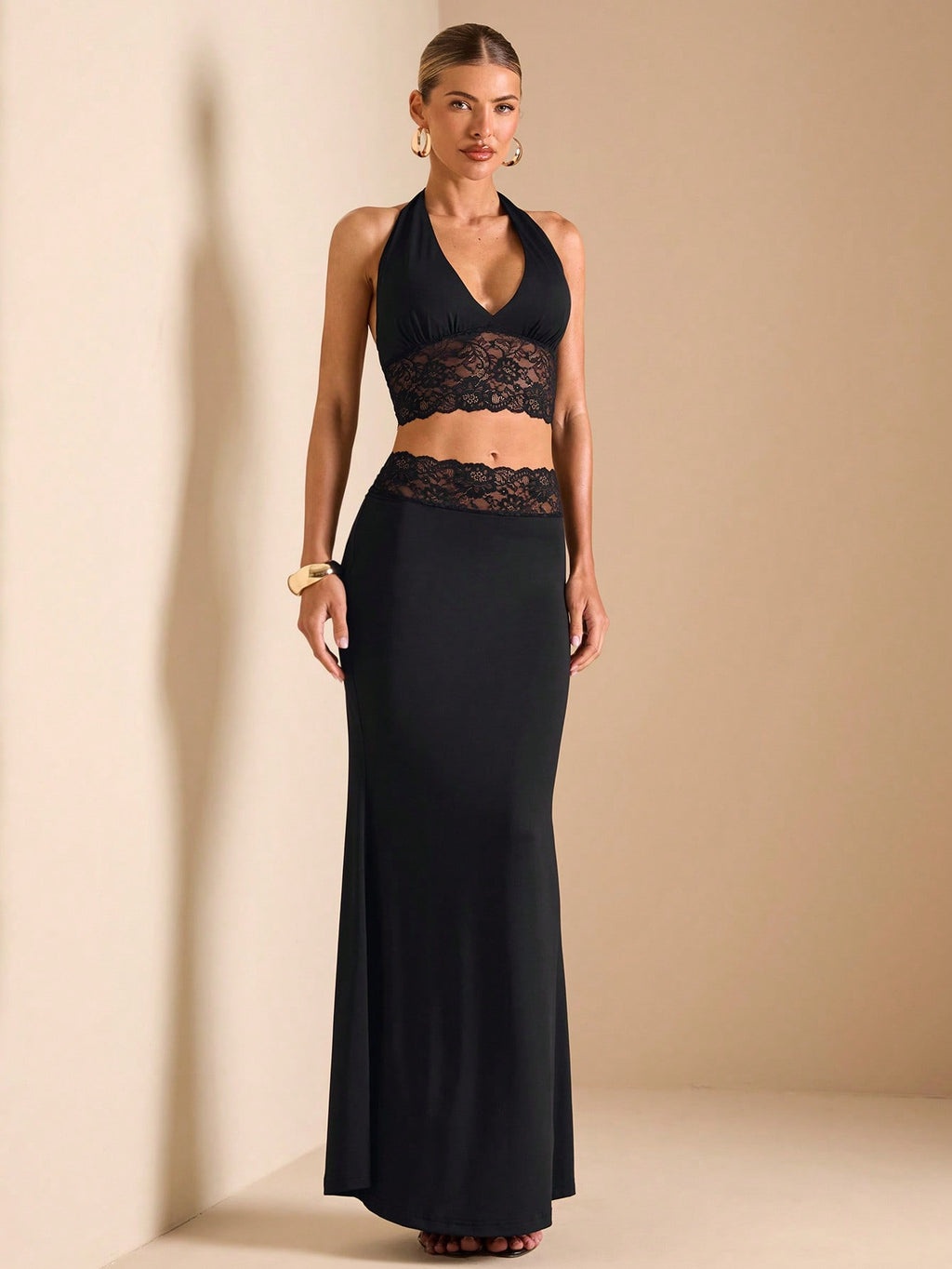 BELLAVOG Ženski set od 2 dijela s čipkastim panelima i uskim uzorkom, pletenje s motivom sirene, ležeran, za odmor, ljetni set/haljina za goste, za žene/matursko veče/uskrs/odmor