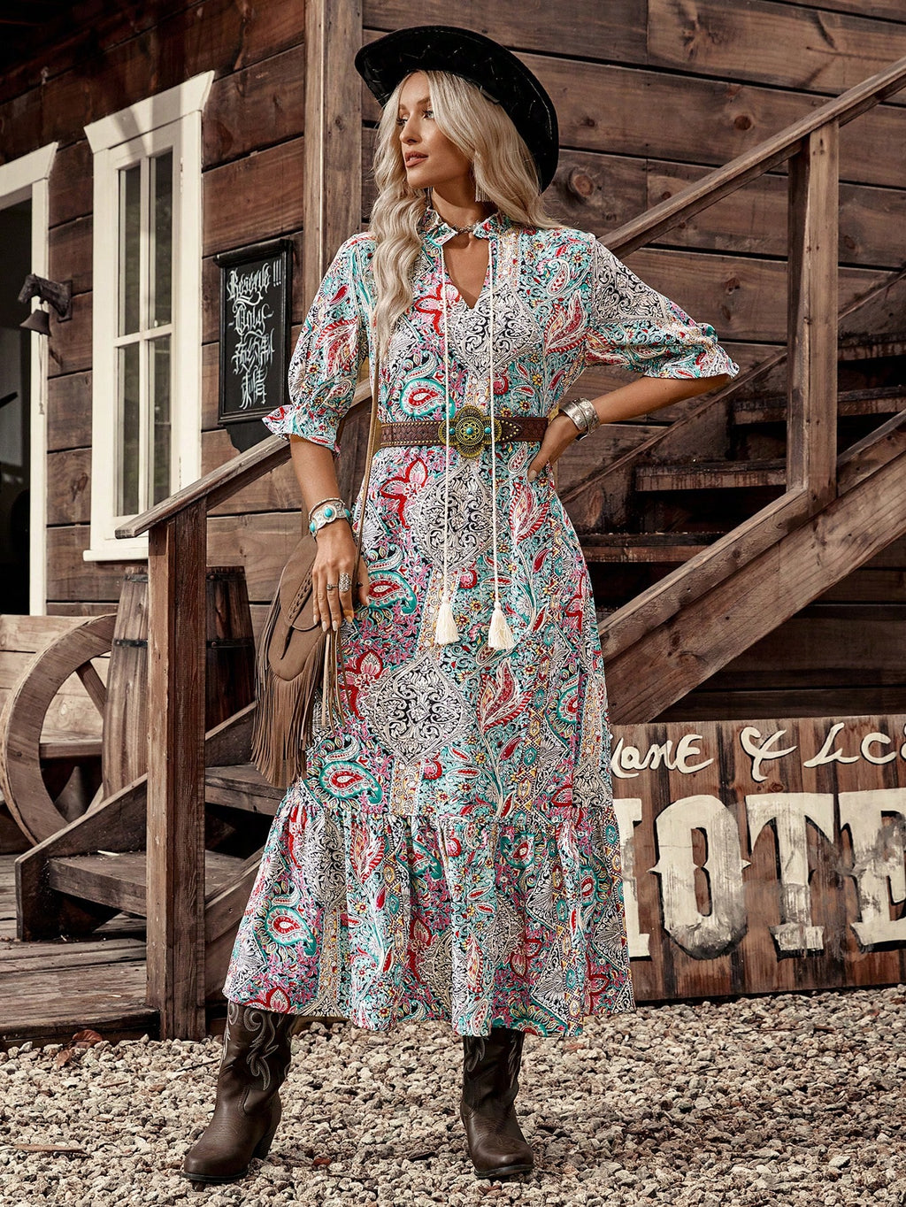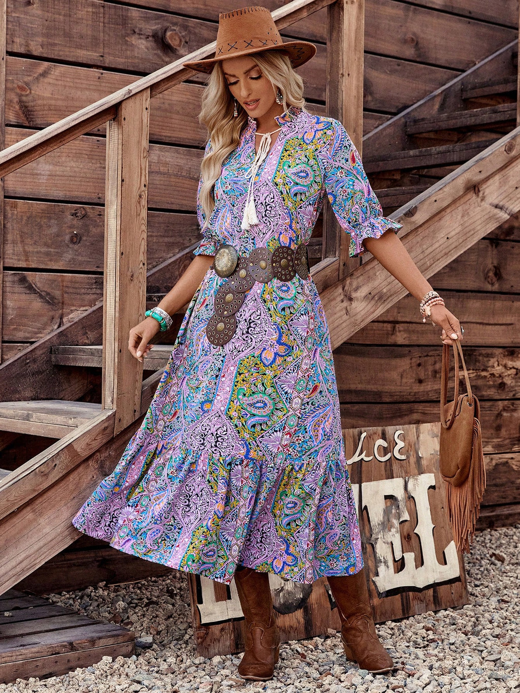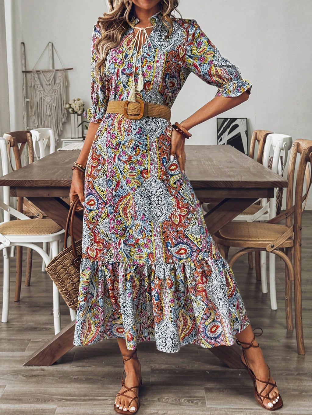 BELLAVOG Women's Bohemian Style Printed Mid-Sleeve Dress,Ladies Boho Fringe,Ruffle Hem Half Sleeve Tie Neck Loose Long Multicolor Flounce Sleeve All Over Print,Paisley Smock Women Long Dresses,Spring/Fall,Casual Daily Wear Maxi Women Outfit