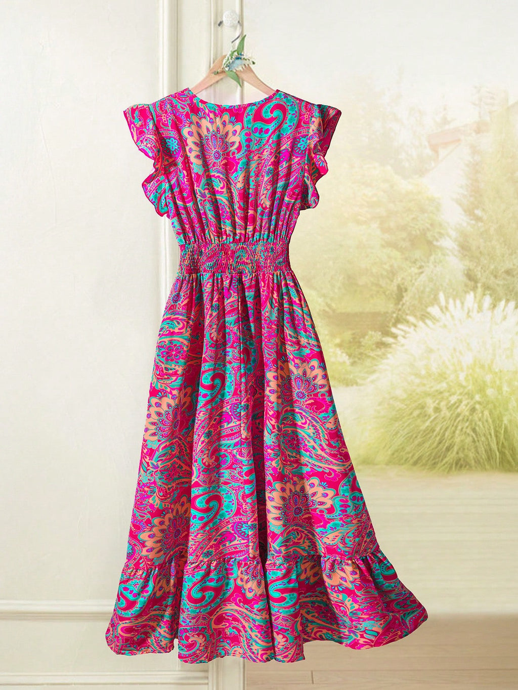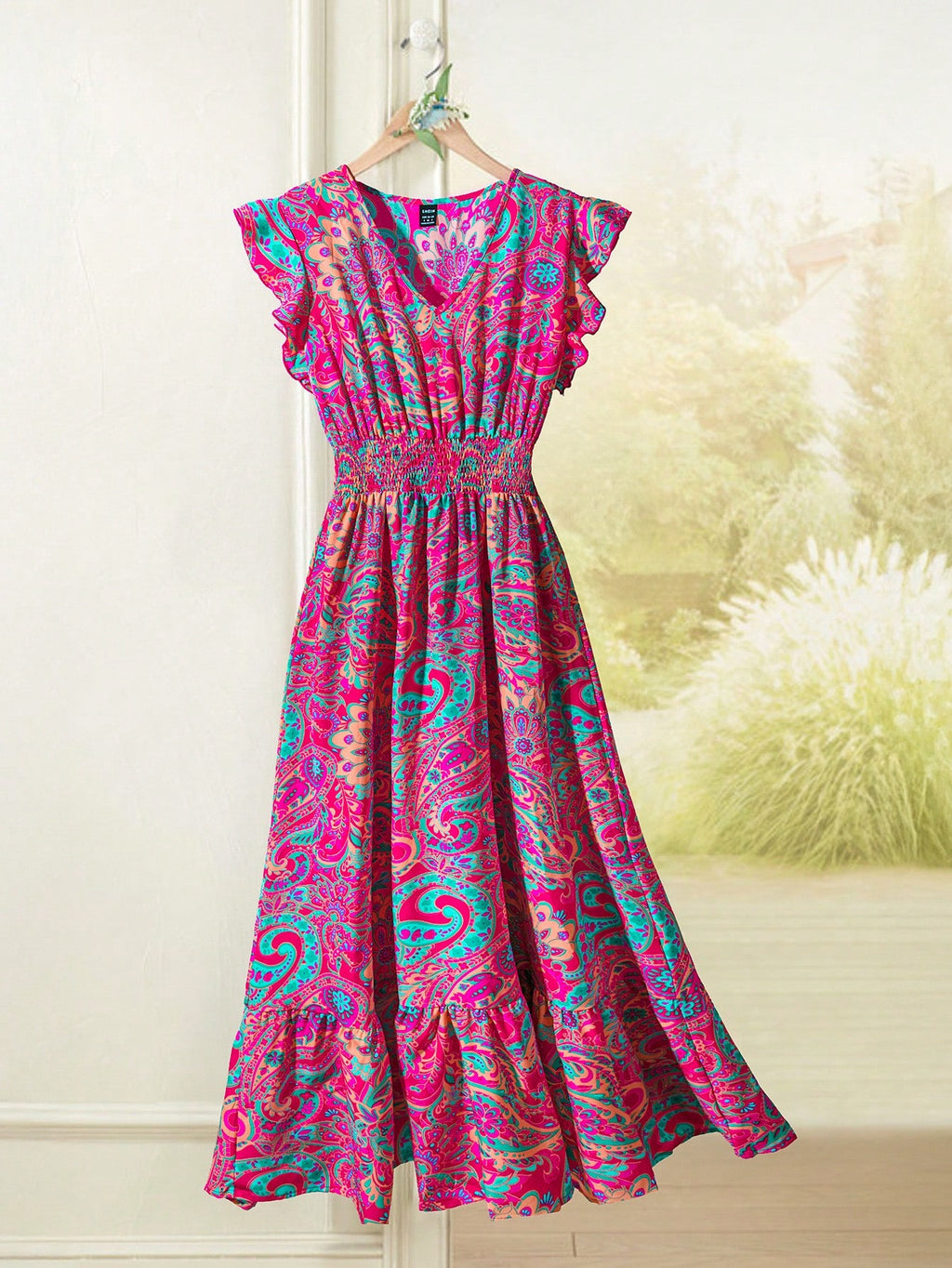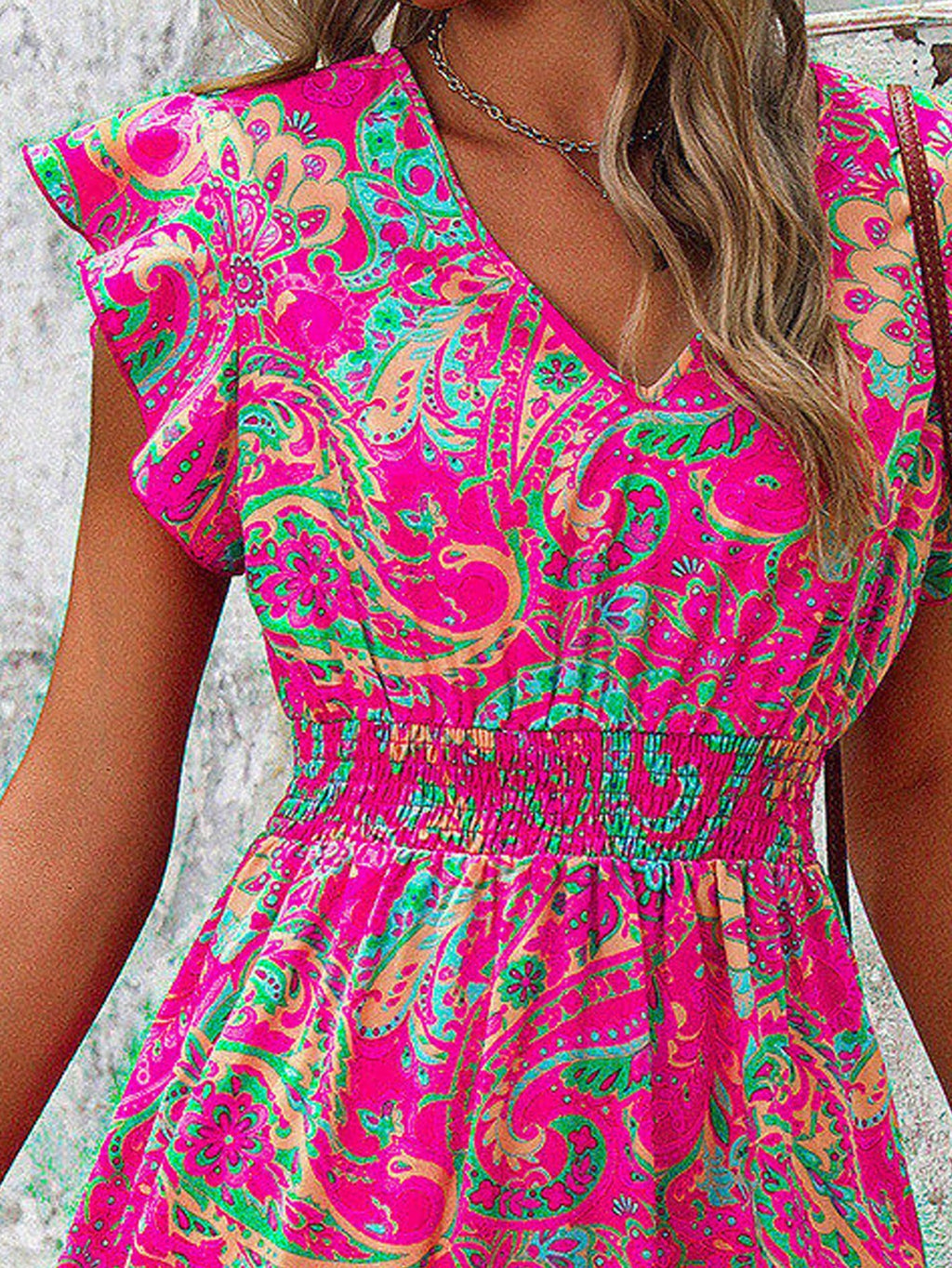 BELLAVOG Ženska ležerna ljetna haljina s V-izrezom i printom, lepršavim rukavima, plisiranim strukom i naboranim rubom, ljetne haljine za žene