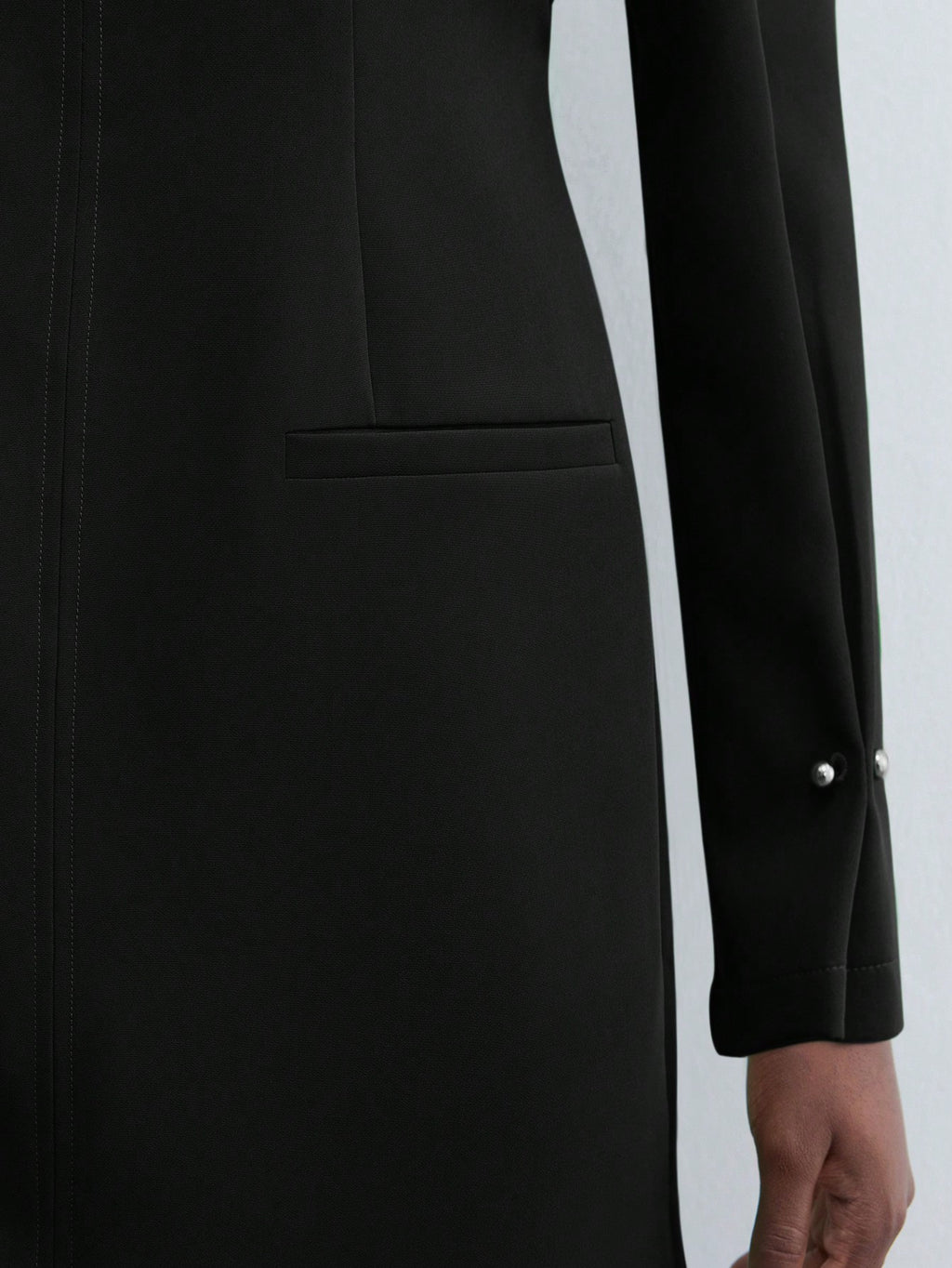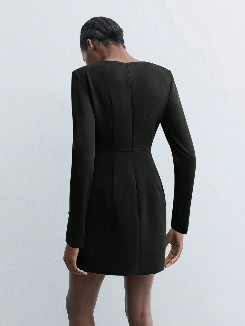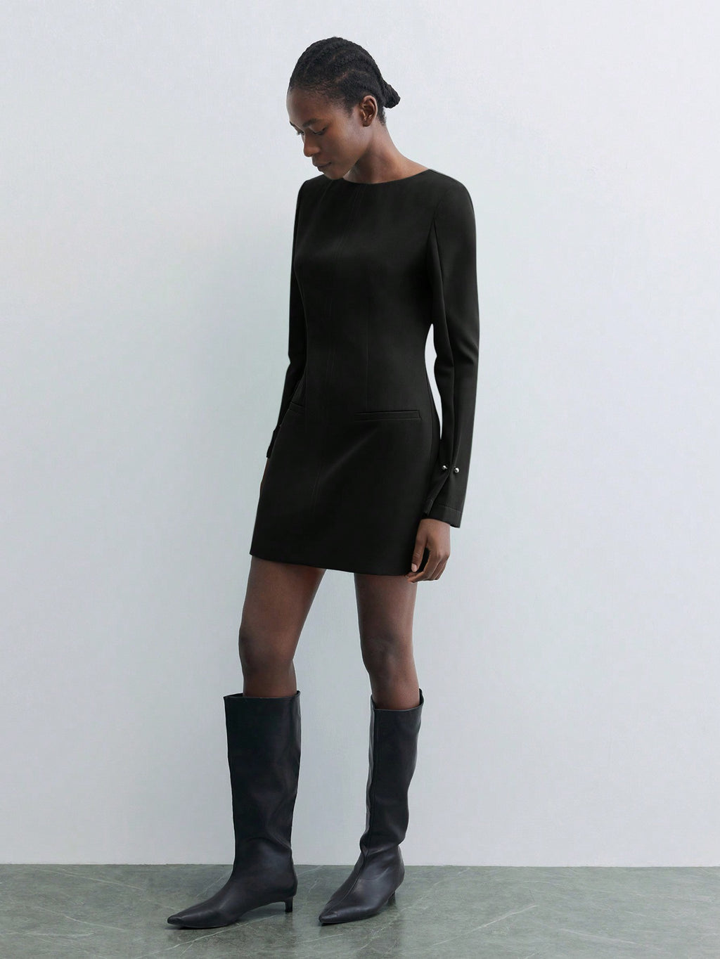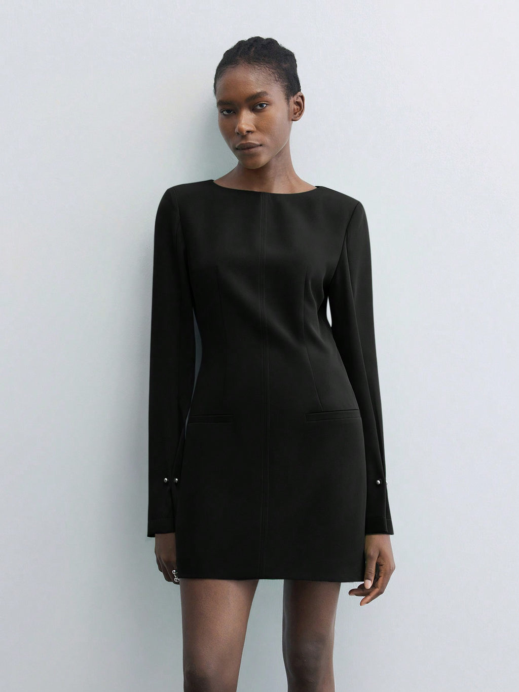 BELLAVOG Women's Elegant Solid Color Cinched Waist Long Sleeve Mini Dress With Metal Decor Epaulets, Black Boat Neck, Early Spring