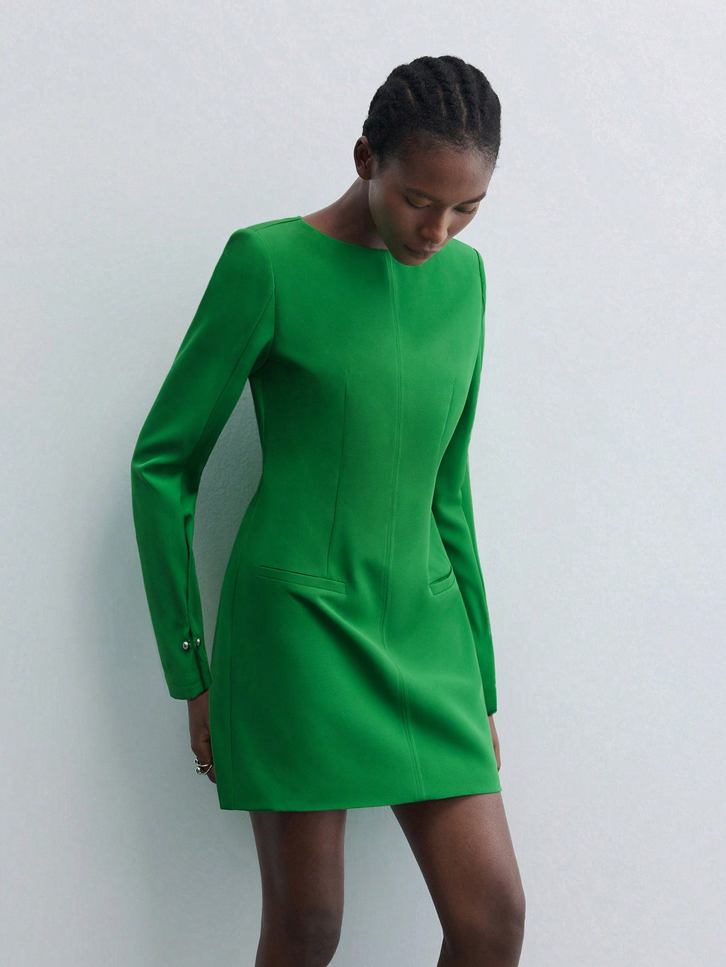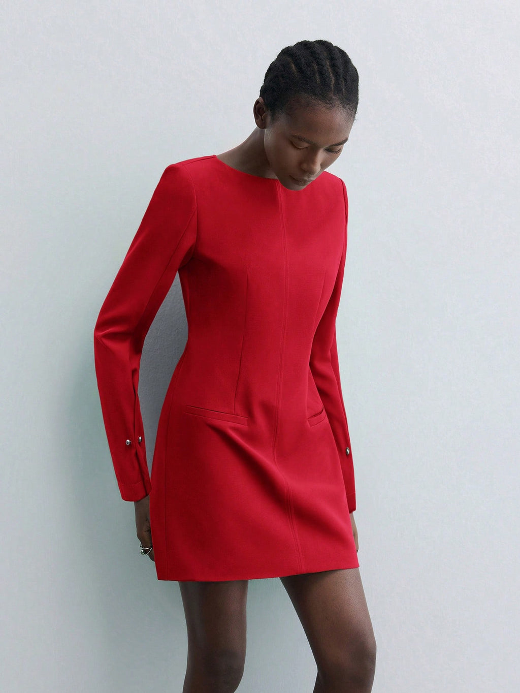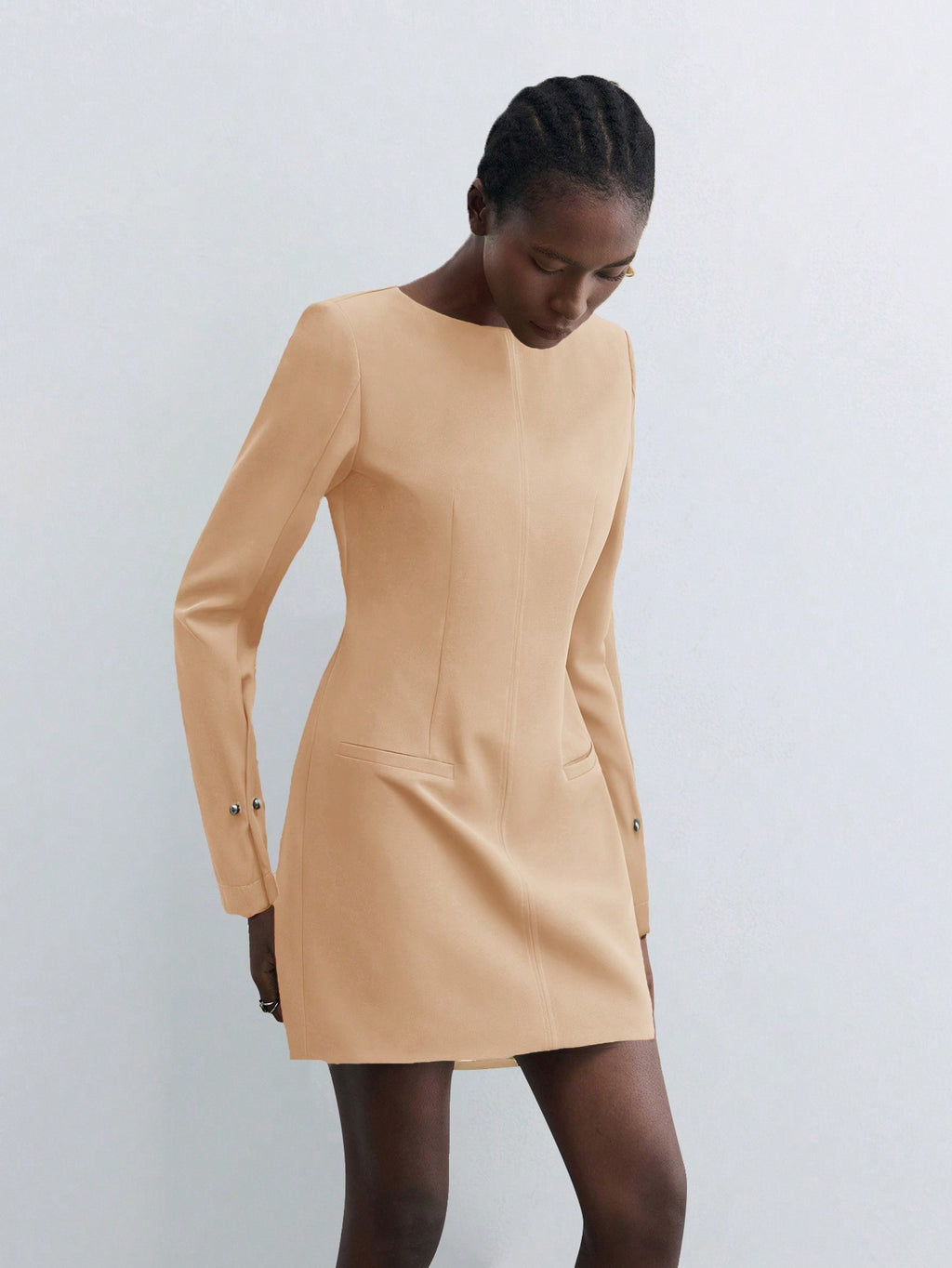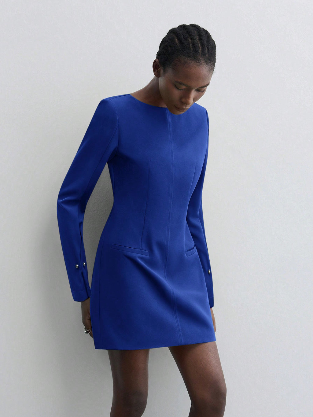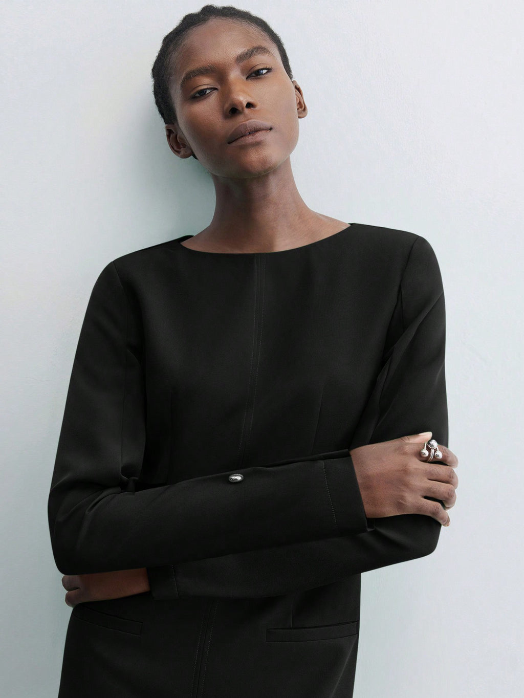 BELLAVOG Women's Elegant Solid Color Cinched Waist Long Sleeve Mini Dress With Metal Decor Epaulets, Black Boat Neck, Early Spring