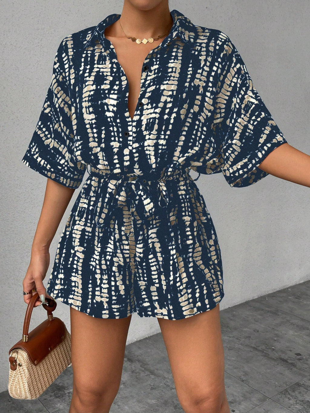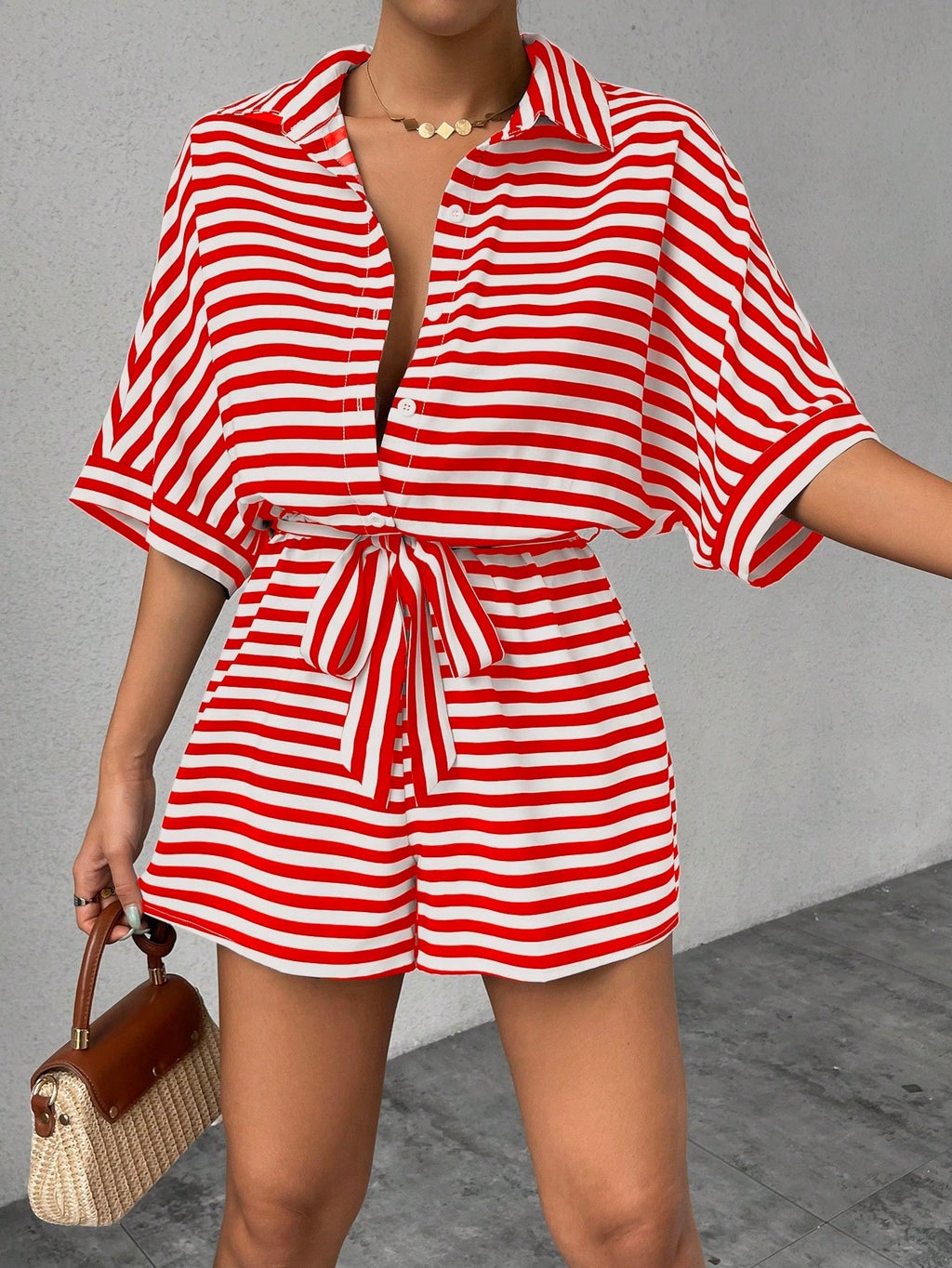 BELLAVOG Ženski zeleni prugasti ležerni romper, ljetni proljetni kombinezon s ovratnikom i kratkim rukavima, kopčanje na kopče
