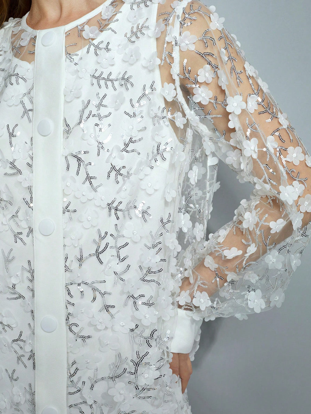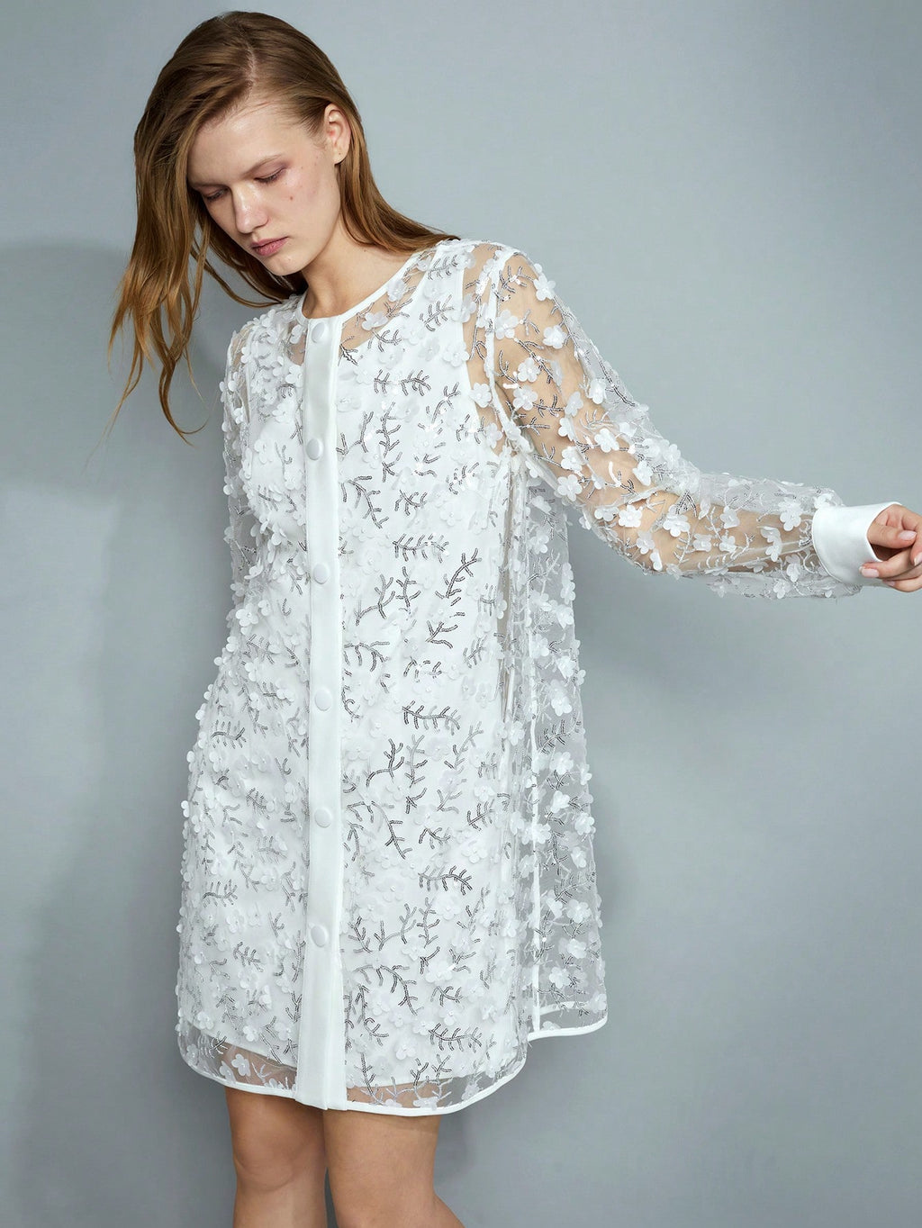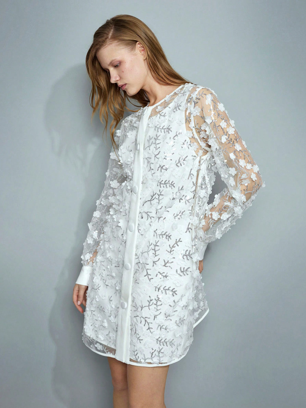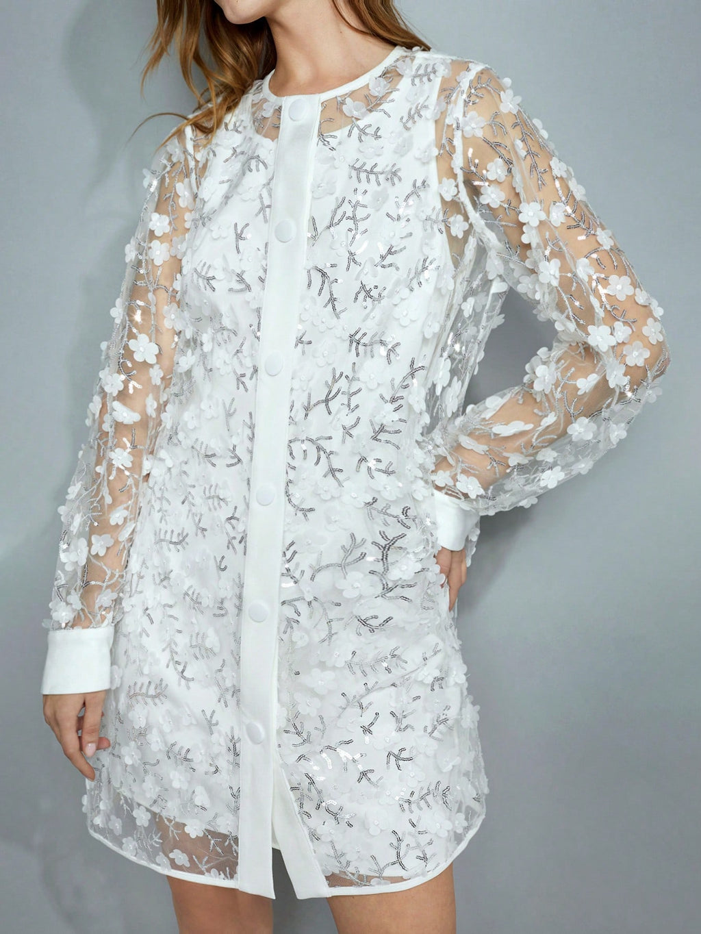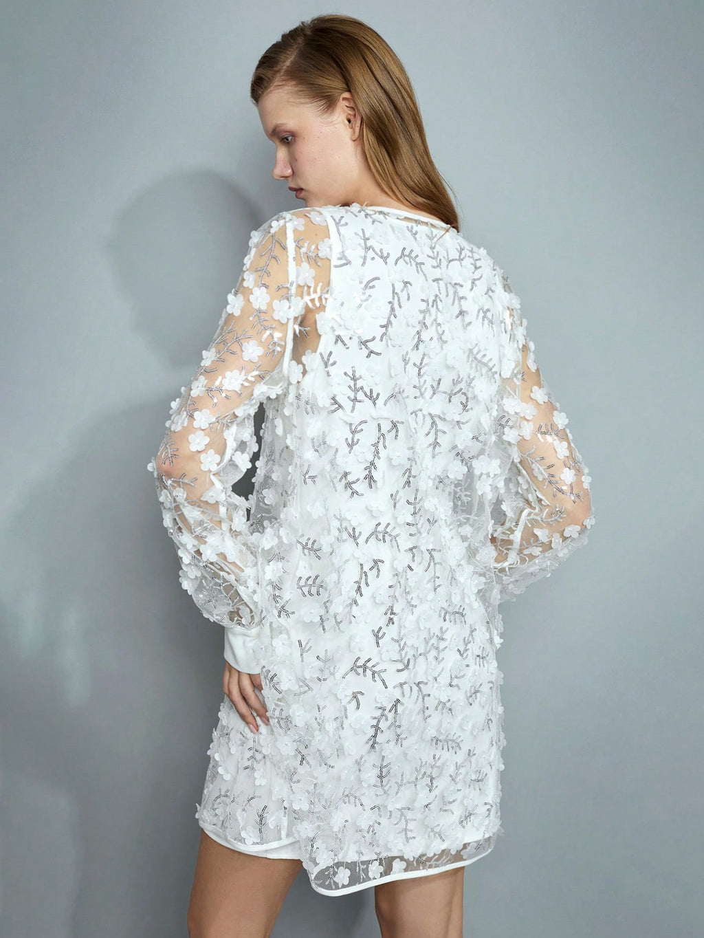 BELLAVOG Women's Romantic Elegant 3D Floral Sequins Transparent White Holiday Long Sleeve Christmas Mini Dress, Fit For New Year Party, Festival Celebrations Valentine's Day,Boho
