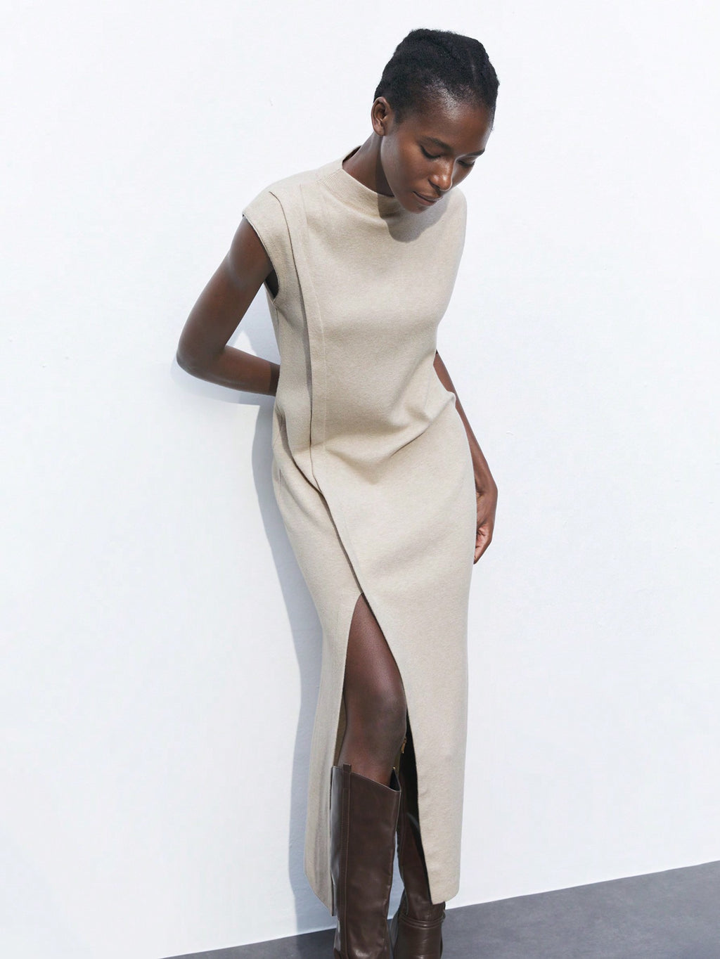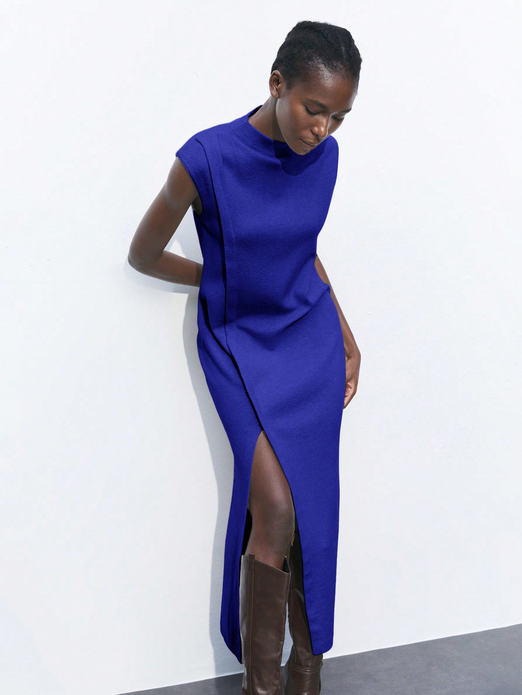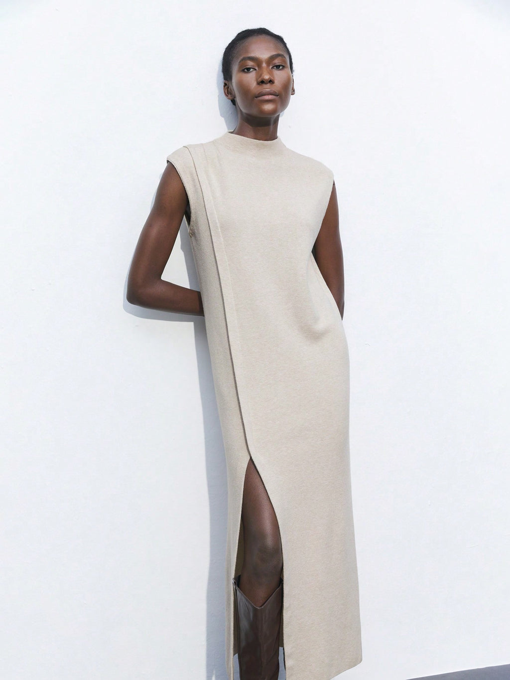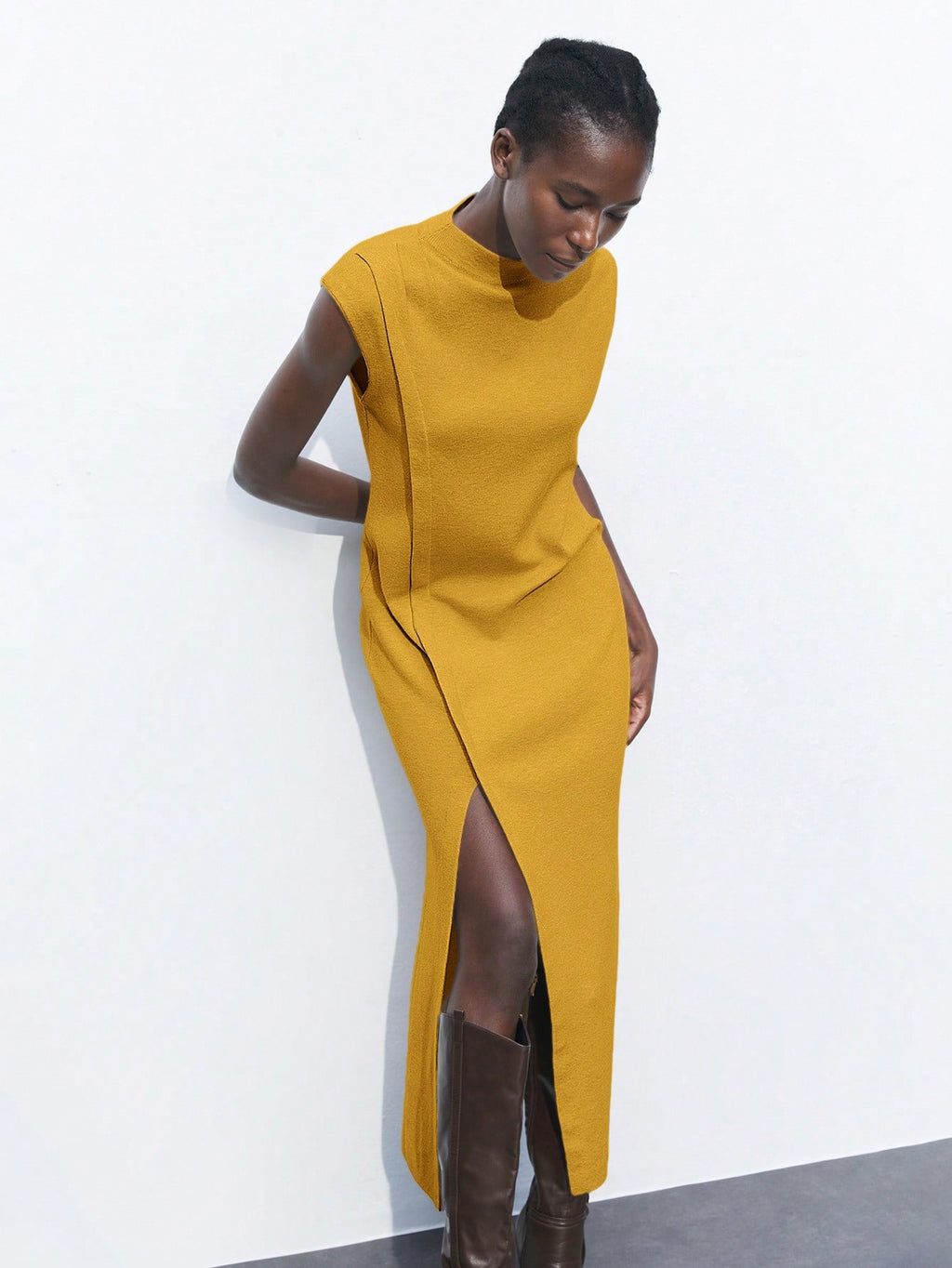 BELLAVOG Women's Solid Color Mandarin Collar Sleeveless Split Hem Casual Knit Dress, Elegant Ladies Dress Suitable For St. Patrick's Day, Easter, Spring Festival, Music Festival