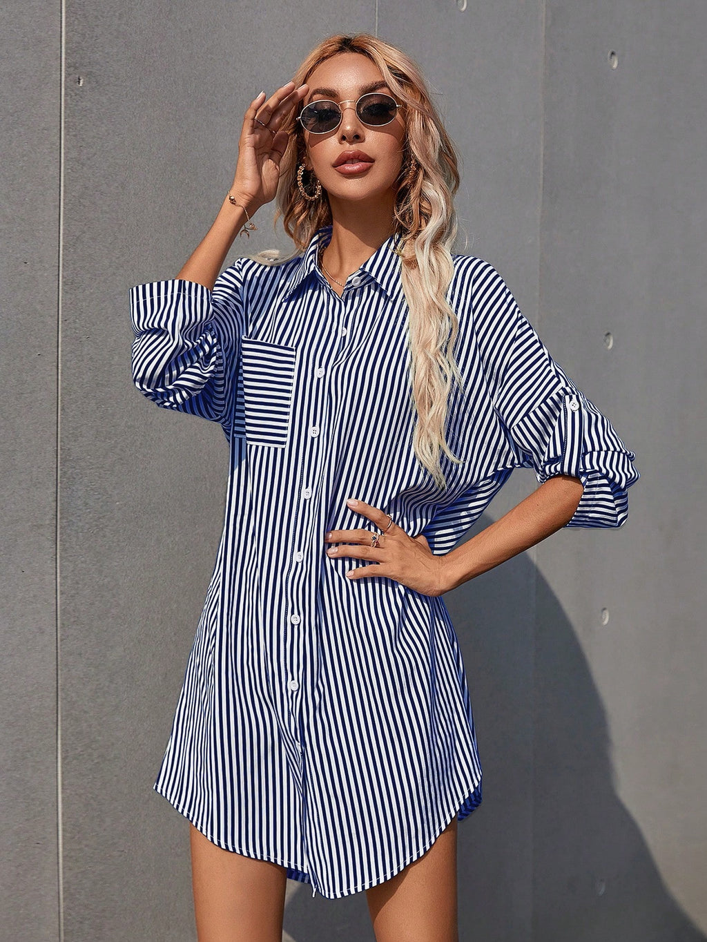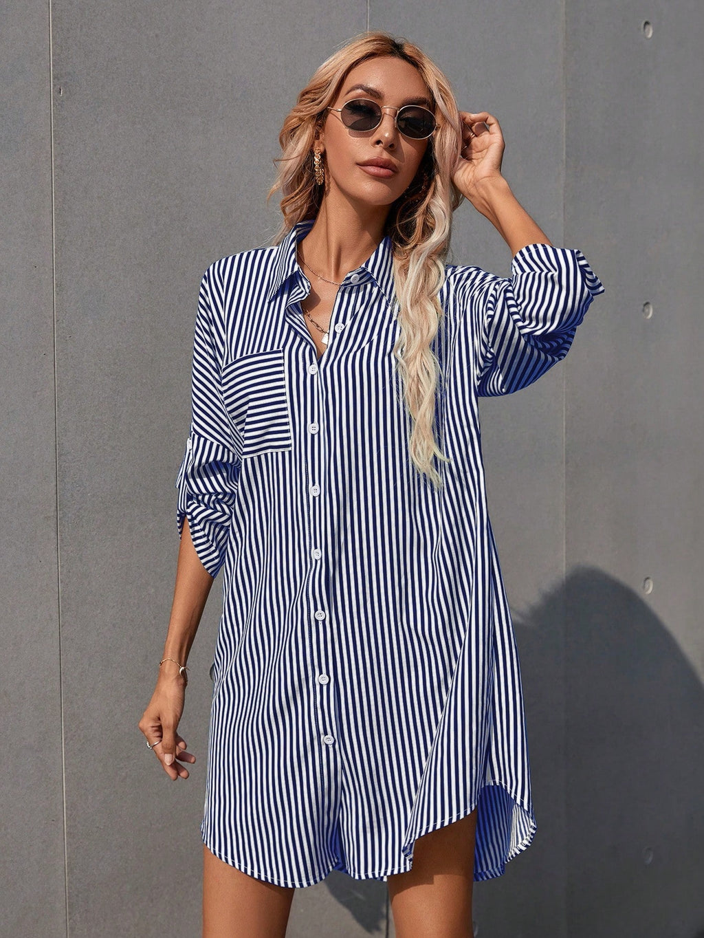 BELLAVOG Ženska prugasta košulja-haljina s podvrnutim rukavima