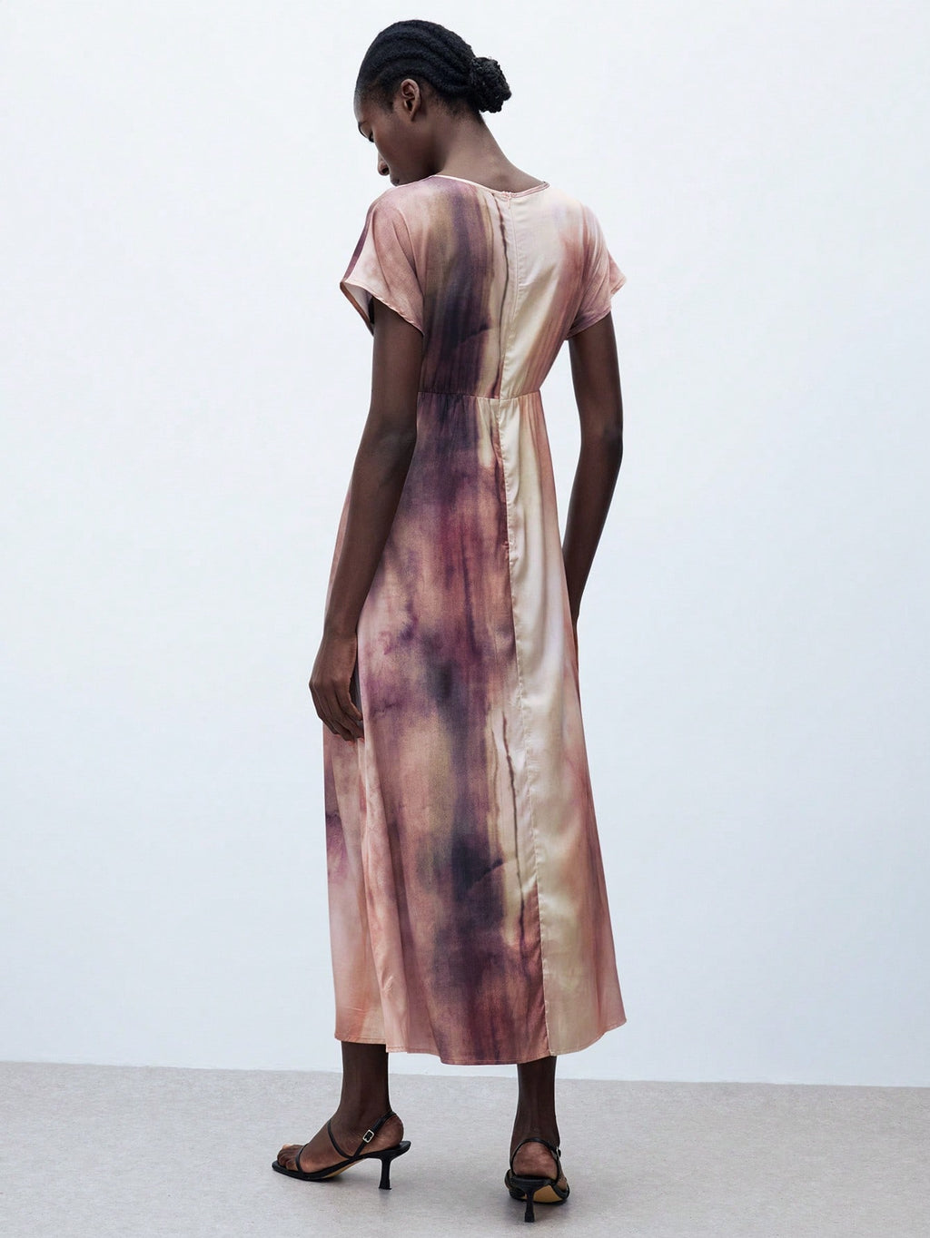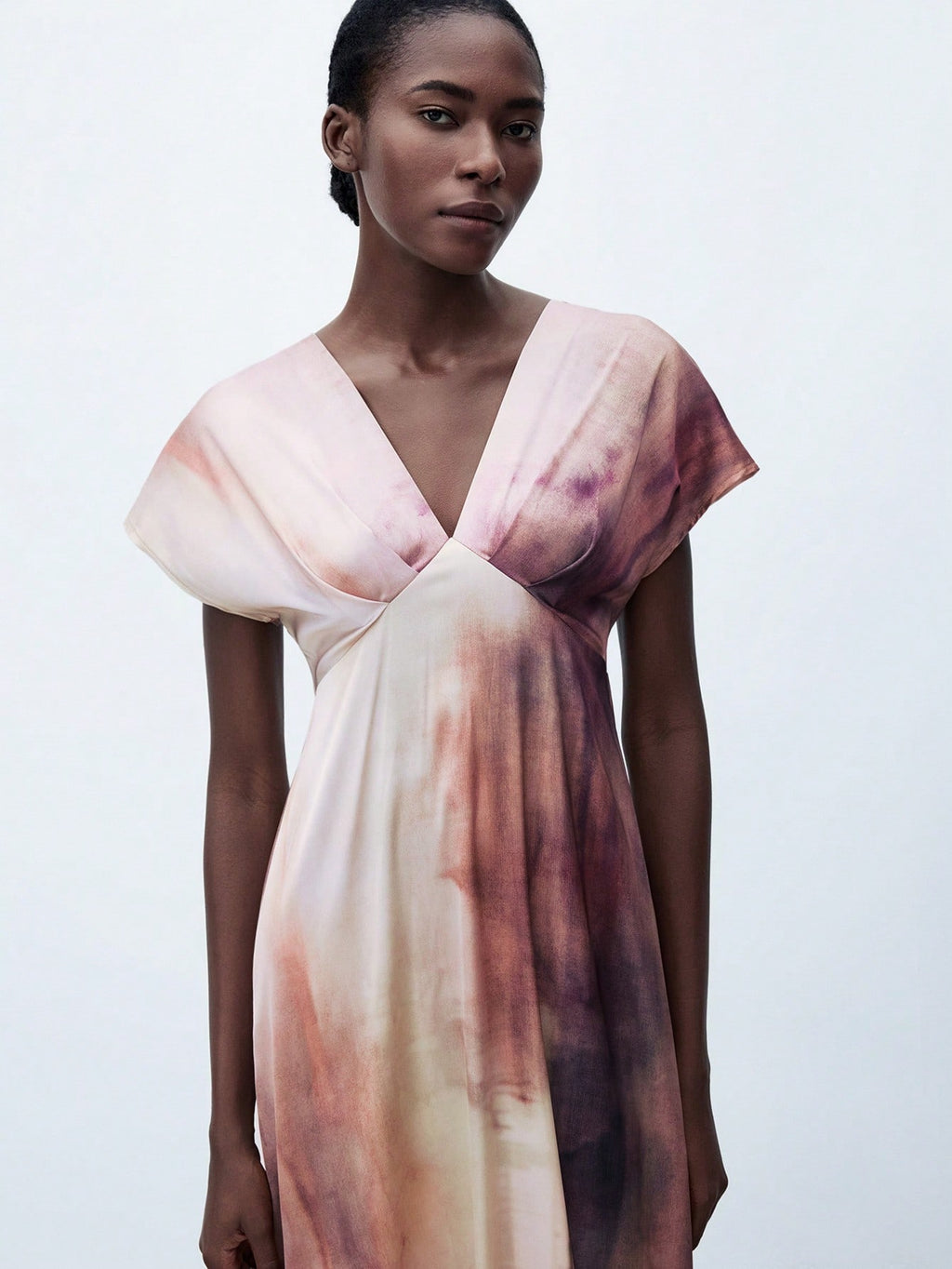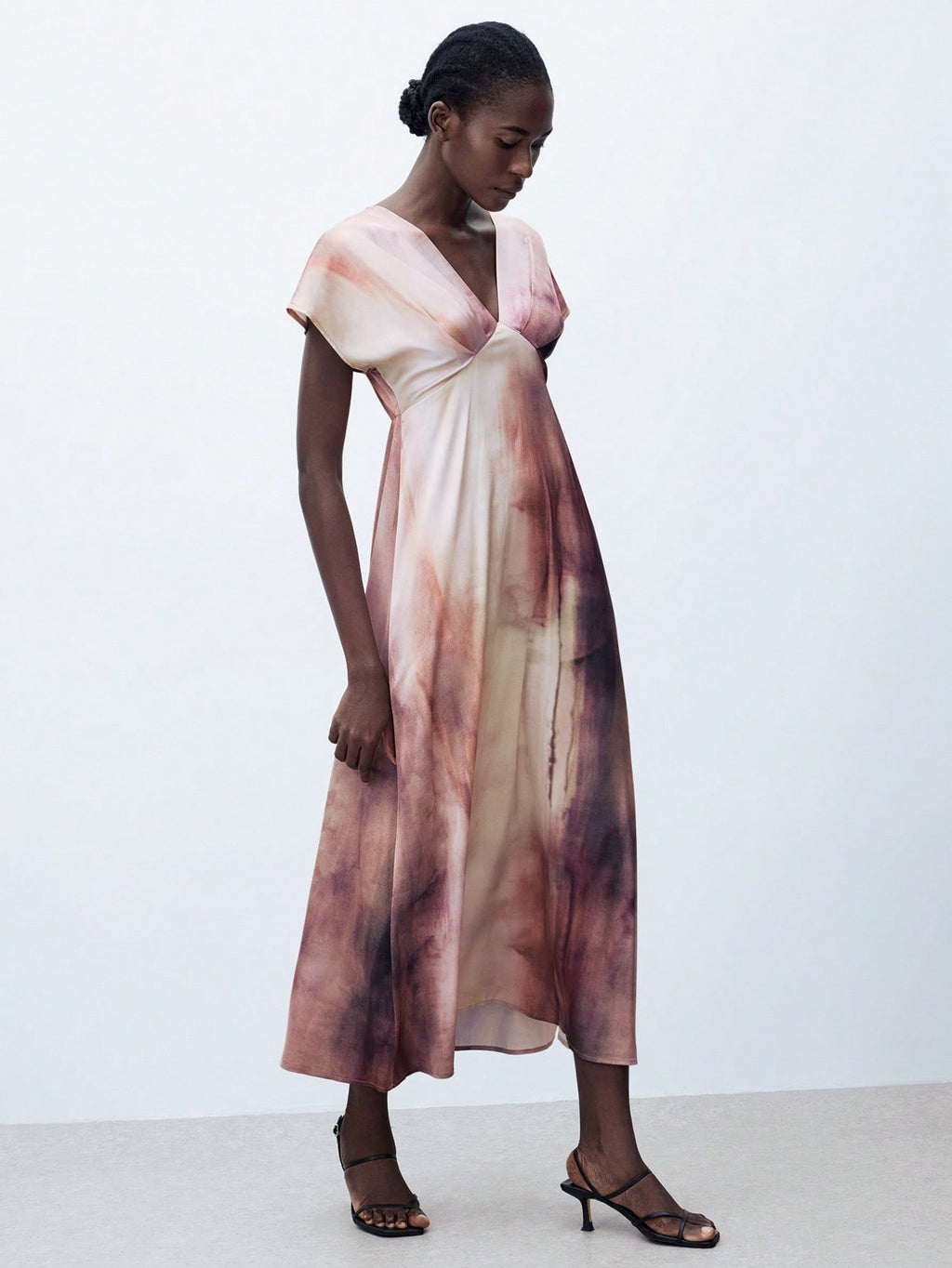 BELLAVOG Women's Tie Dye Print Asymmetrical Neck Versatile Casual Urban Fashion Summer Dress, Elegant Fitted Waist Design With V-Neck And Gathered Front, Suitable For Concerts And Everyday Wear
