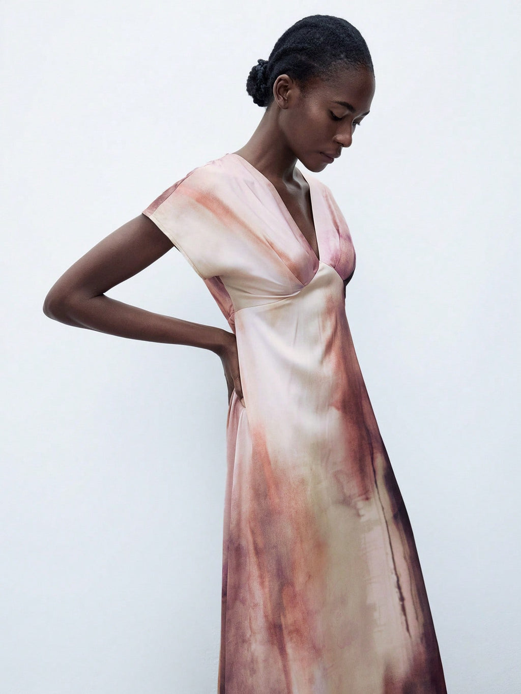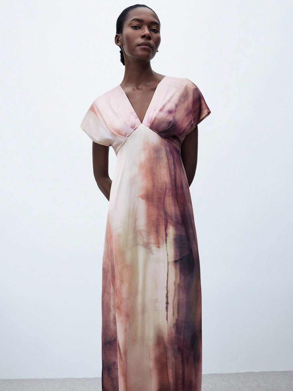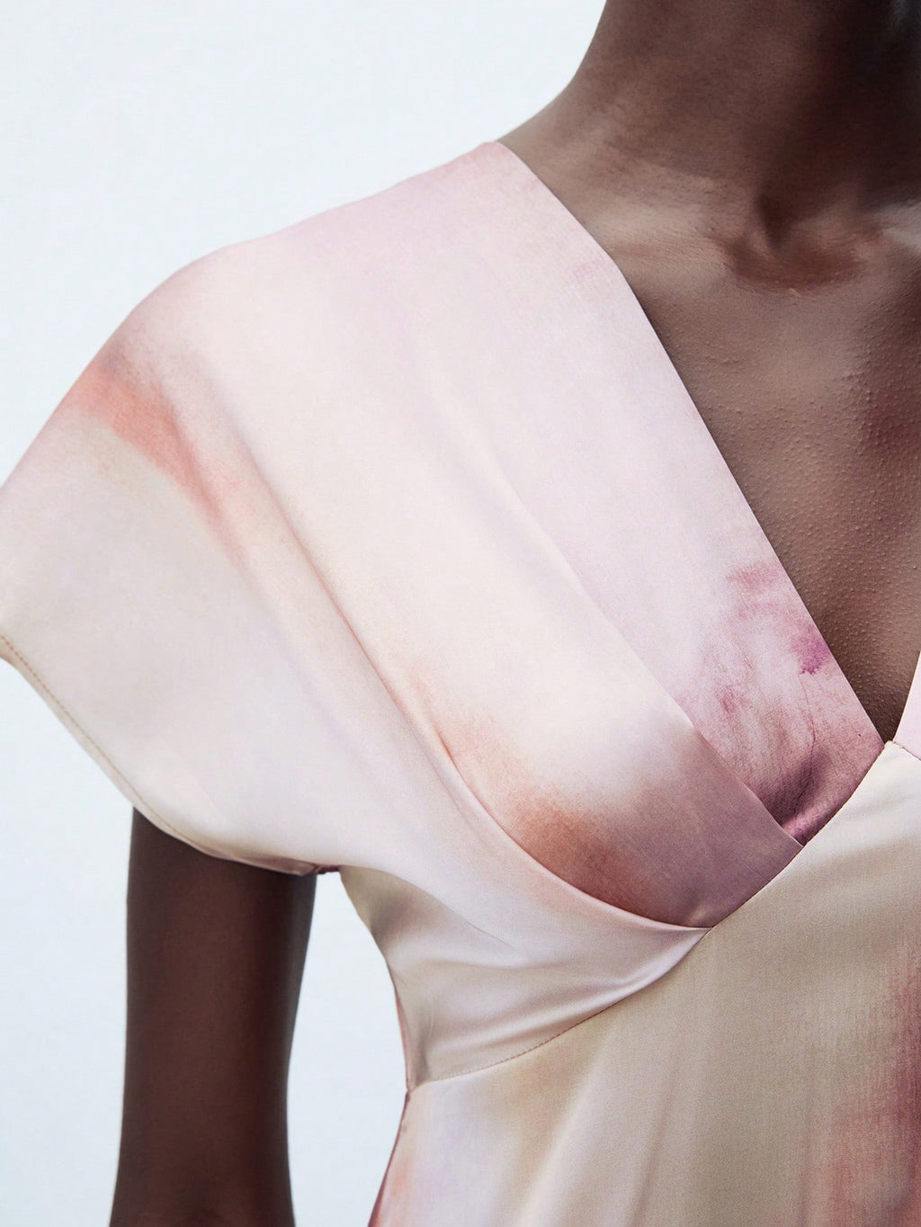 BELLAVOG Women's Tie Dye Print Asymmetrical Neck Versatile Casual Urban Fashion Summer Dress, Elegant Fitted Waist Design With V-Neck And Gathered Front, Suitable For Concerts And Everyday Wear