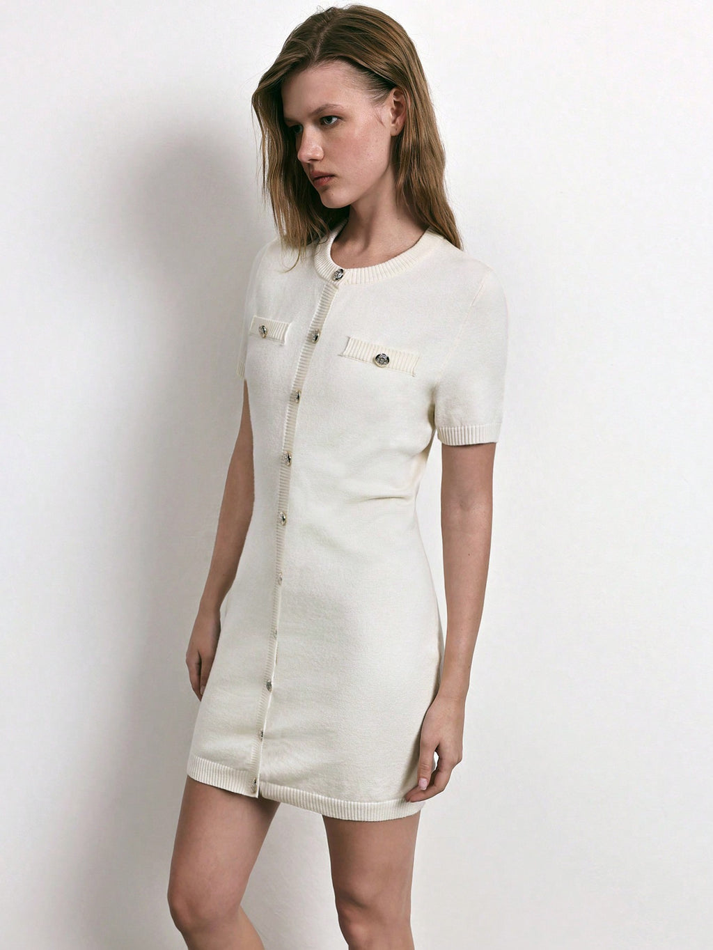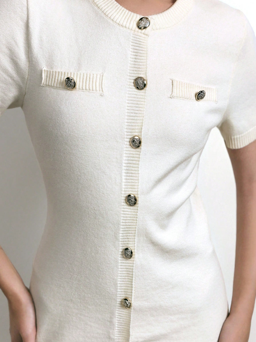 BELLAVOG Women's Urban Elegant Modern White Knitted Metallic Button Waist Fitted Sweater Dress, Short Sleeve, Casual Commuter Outfitting, Holiday, Christmas Party, Winter Valentine's Day