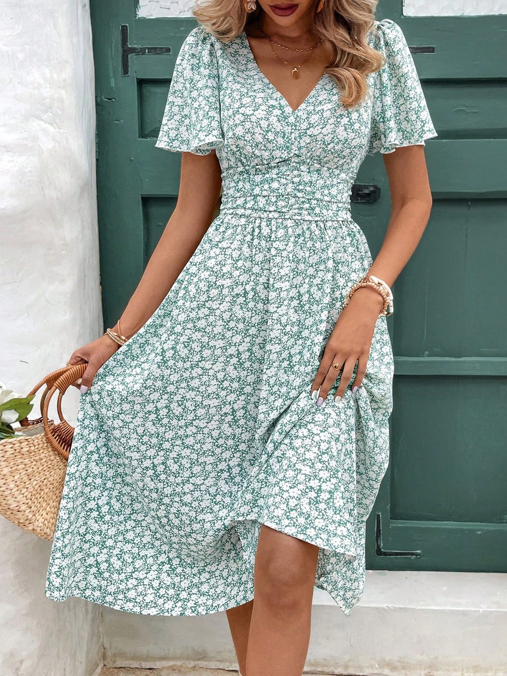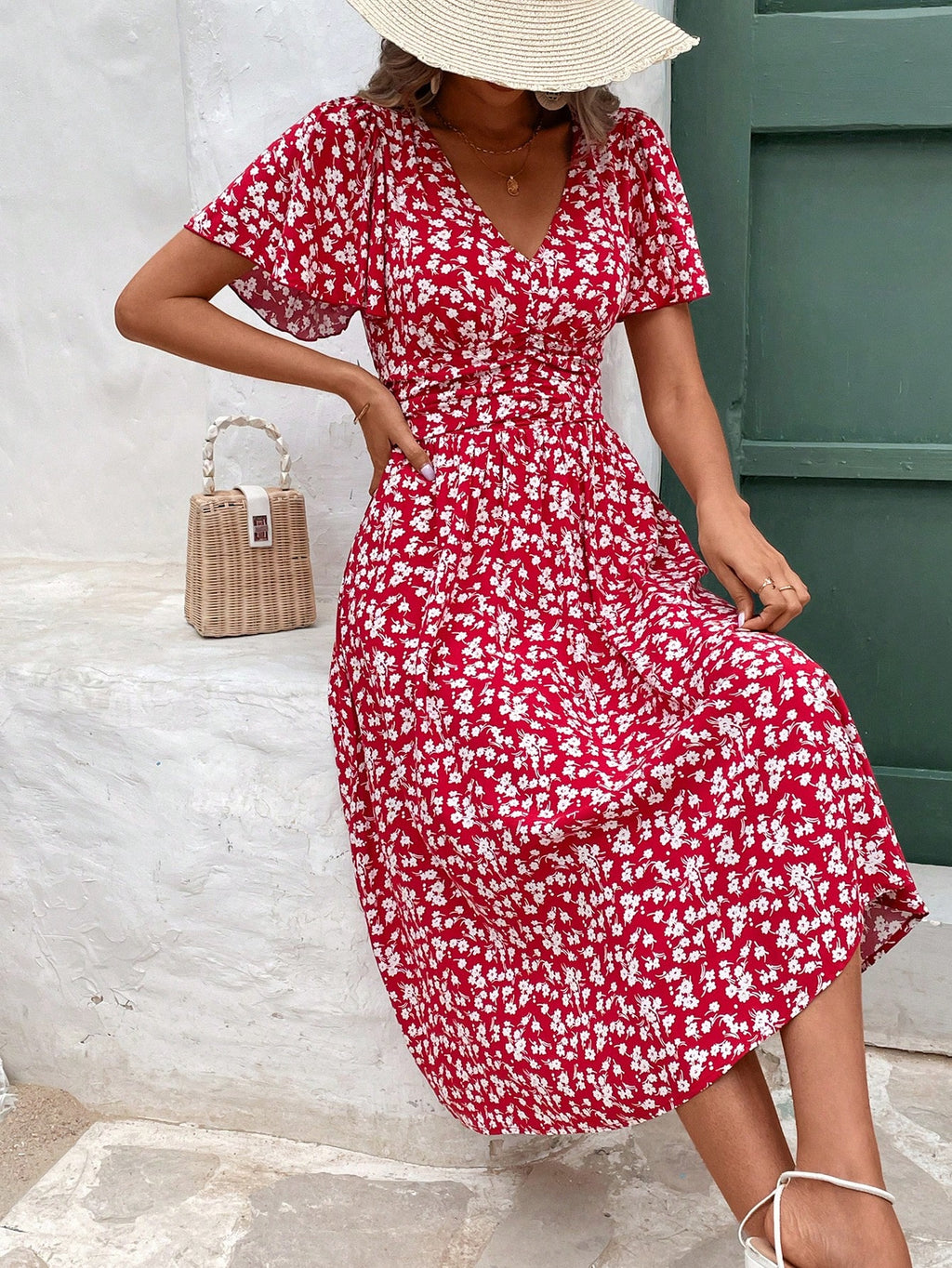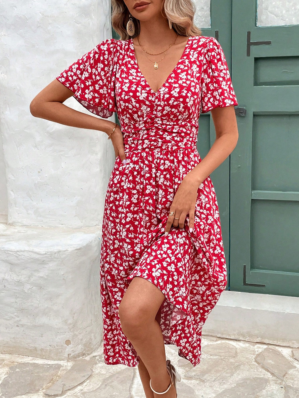 BELLAVOG Ženska haljina s V-izrezom i otvorenom kragnom, spuštenim ramenima, vezicama u struku i prorezom na rubu - ležerna ljetna haljina s cvjetnim printom, idealna za odmor.