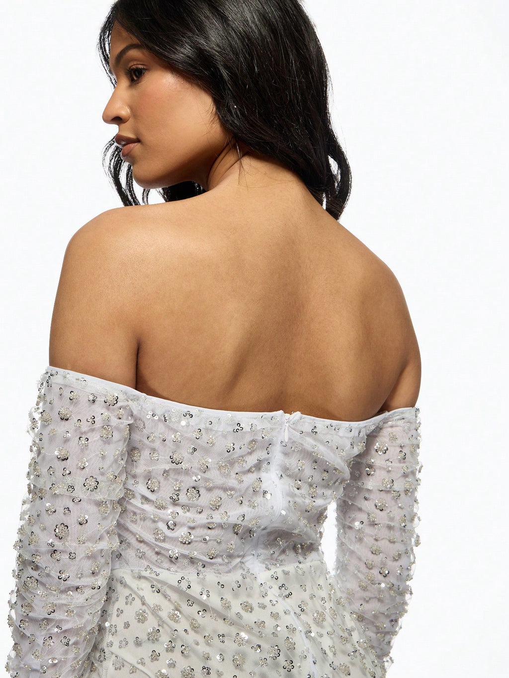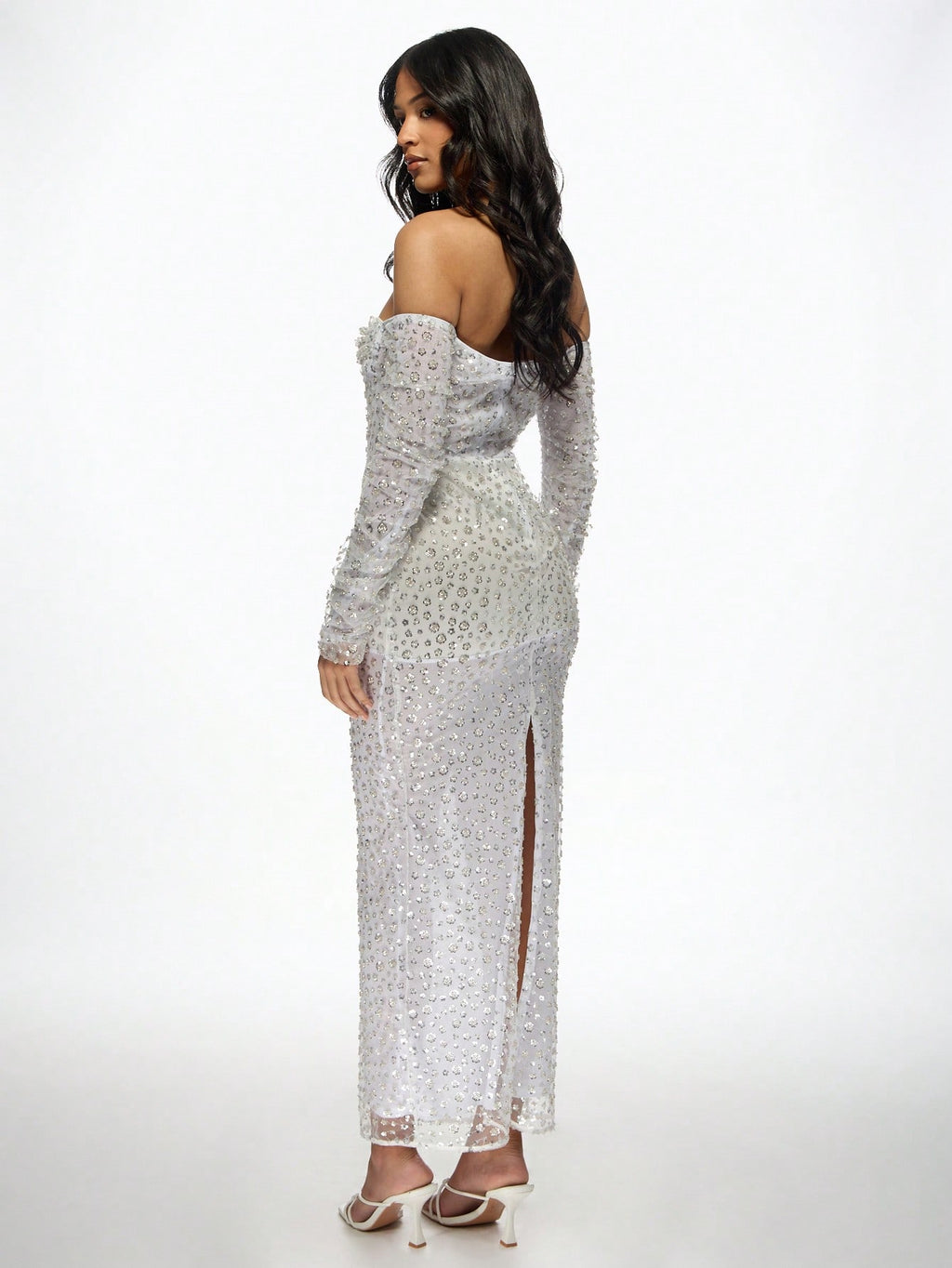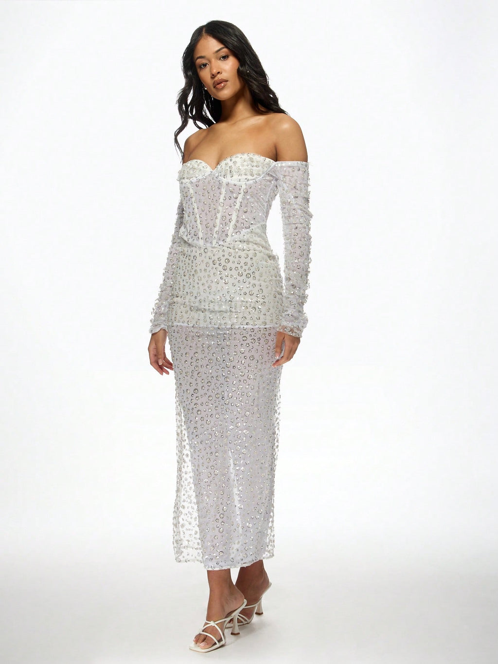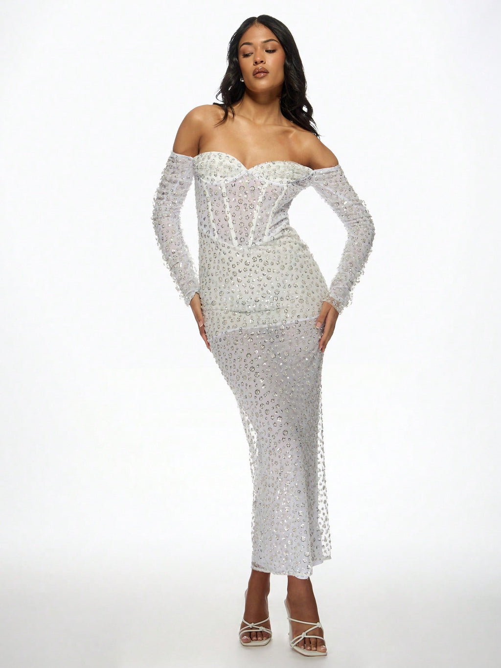 BELLAVOG Y2K Futuristic Sequin Embellished Corset Detail Bandeau Maxi Dress With Long Sleeves