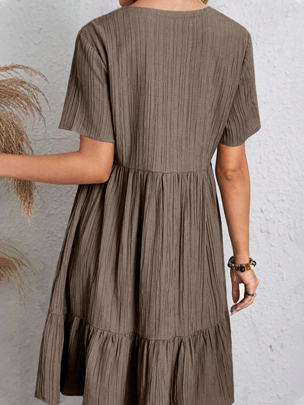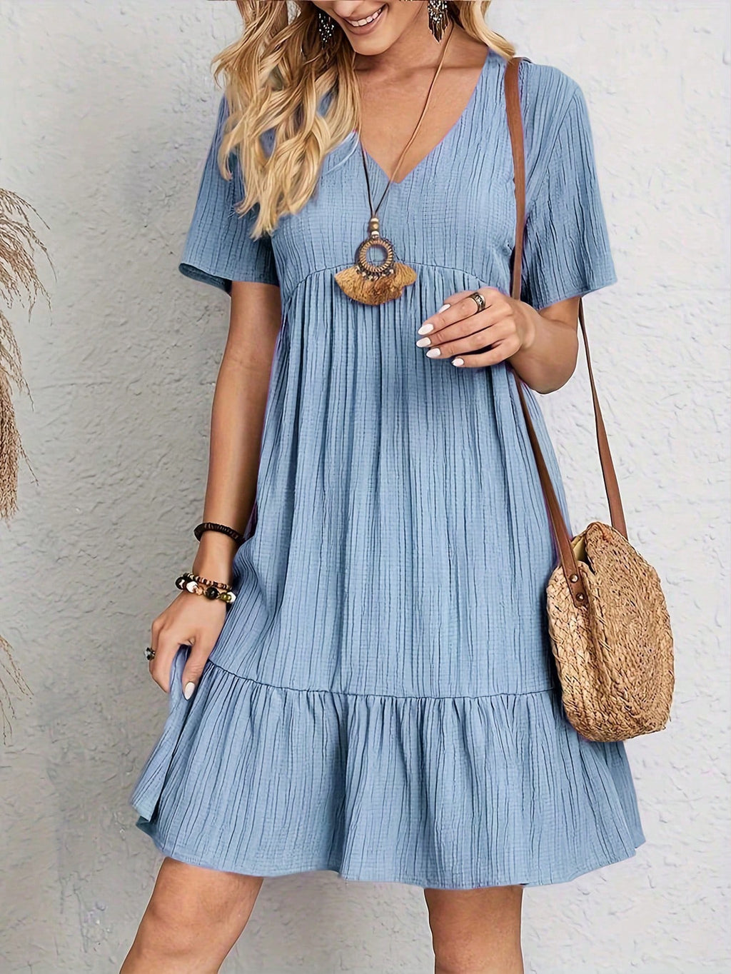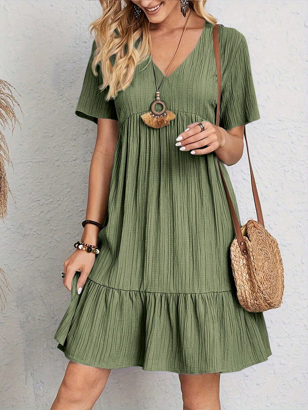 BELLAVOG Jednobojna haljina s V-izrezom i nabranim rubom, ljetna haljina kratkih rukava, odjevne kombinacije za odmor i plažu za žene