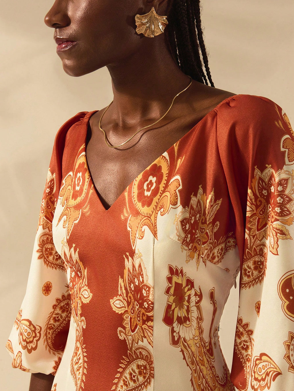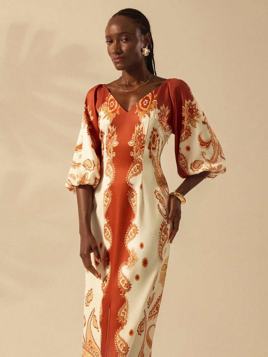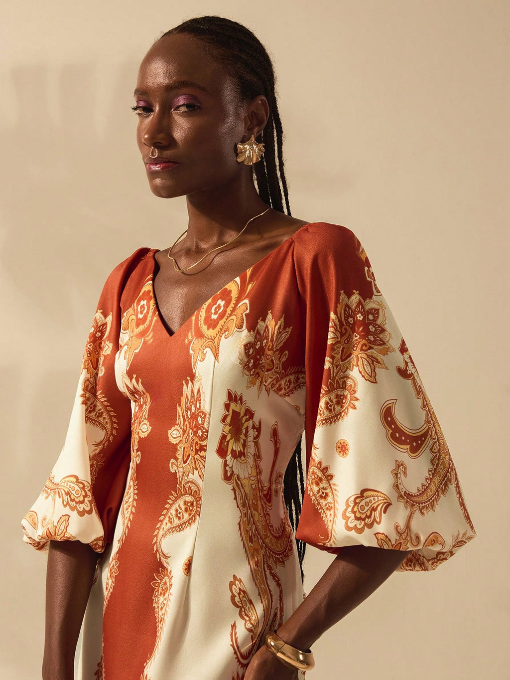 CAJUNI ​​Damen Boho tropisches Blumen Retro Muster V-Ausschnitt, Puffärmel, locker fallenes langes Kleid