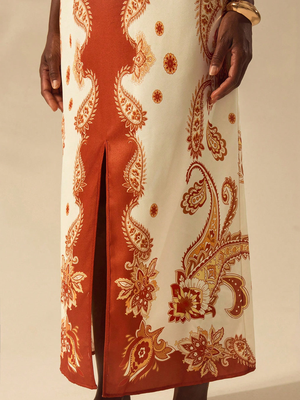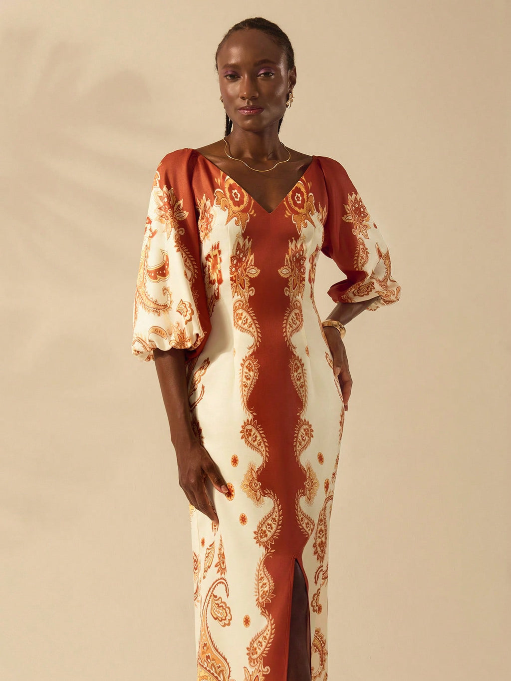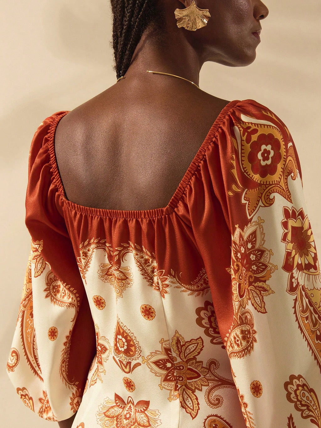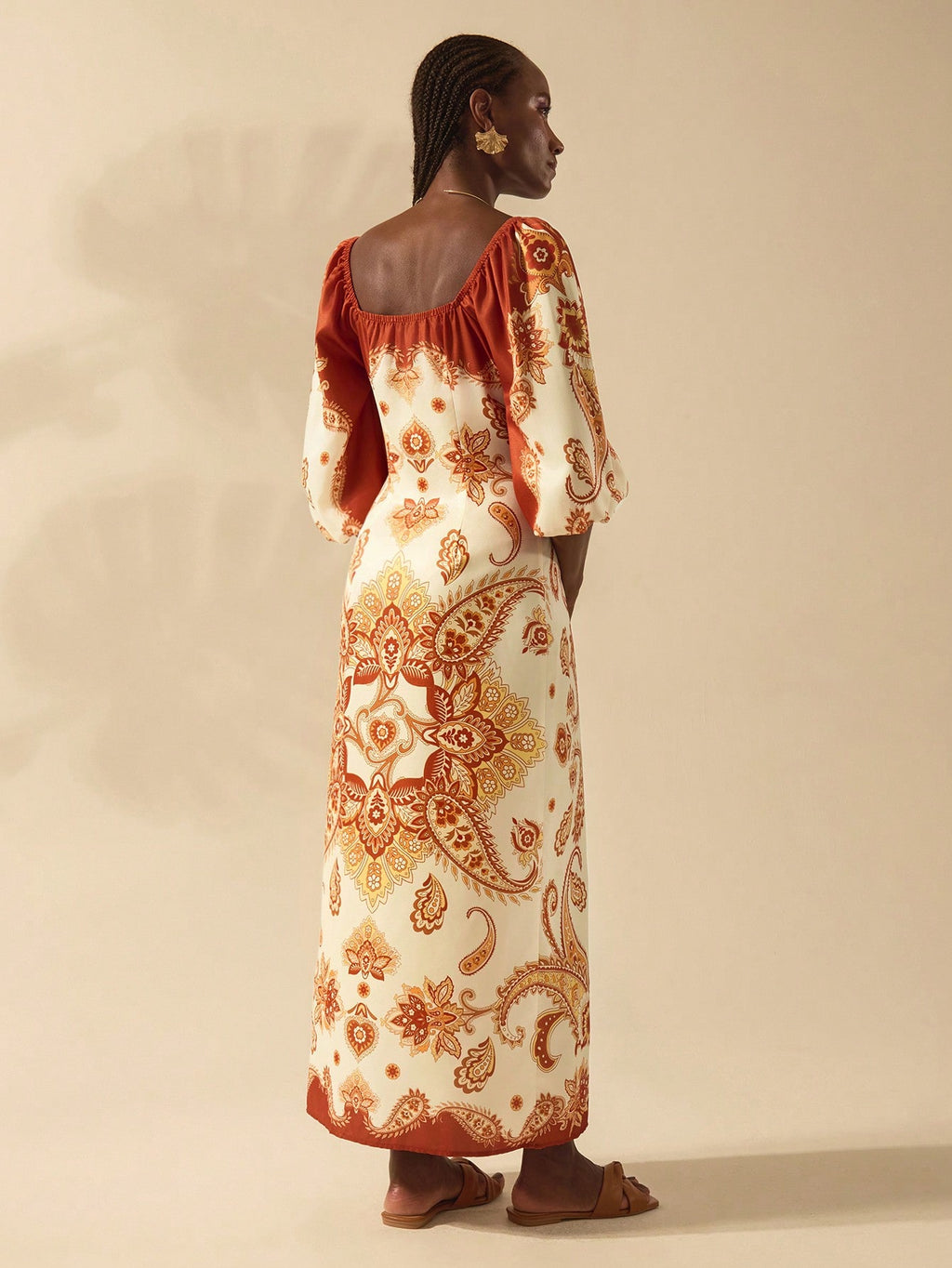 CAJUNI ​​Damen Boho tropisches Blumen Retro Muster V-Ausschnitt, Puffärmel, locker fallenes langes Kleid