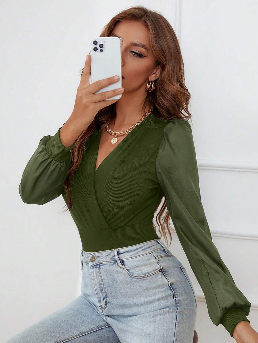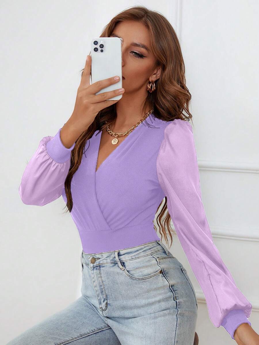 Chiquease Contrast Mesh Puff Sleeve Bodysuit Fall Cloth For Women
