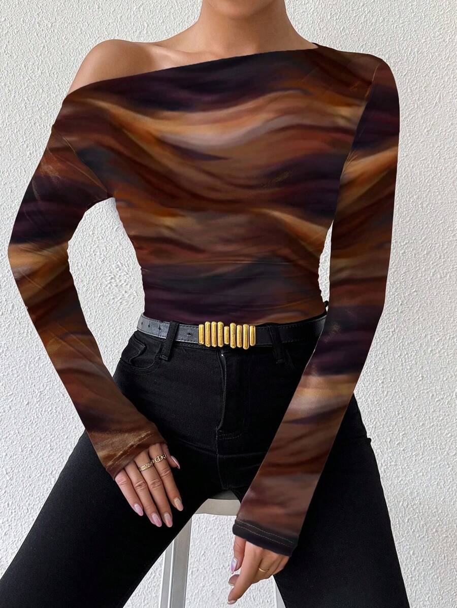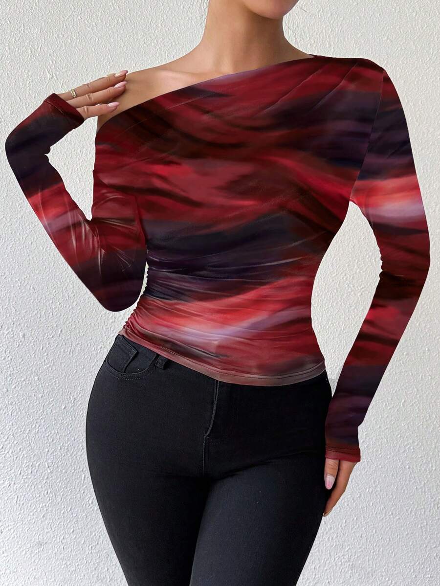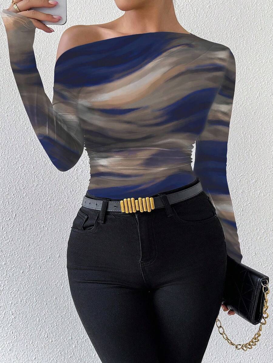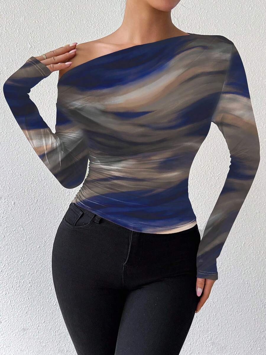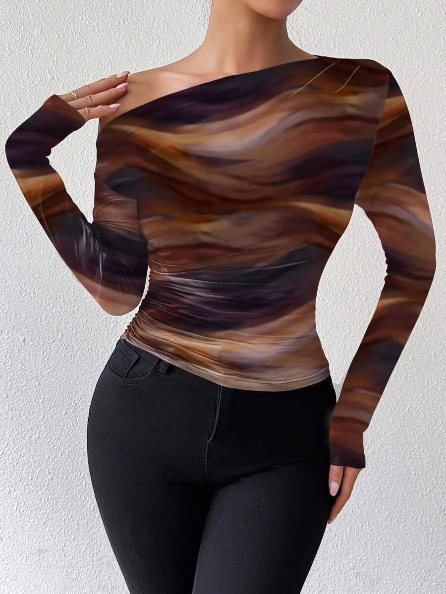 Chiquease Marble Ombre Print Asymmetric Ruched Long Sleeve Top For Spring Outfit Fall Cloth For Women