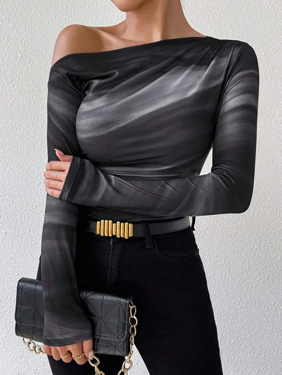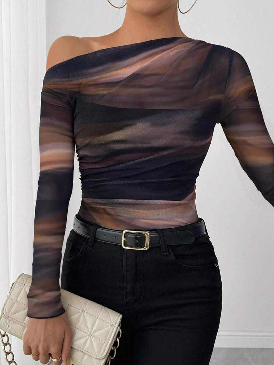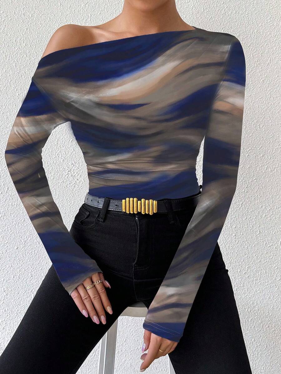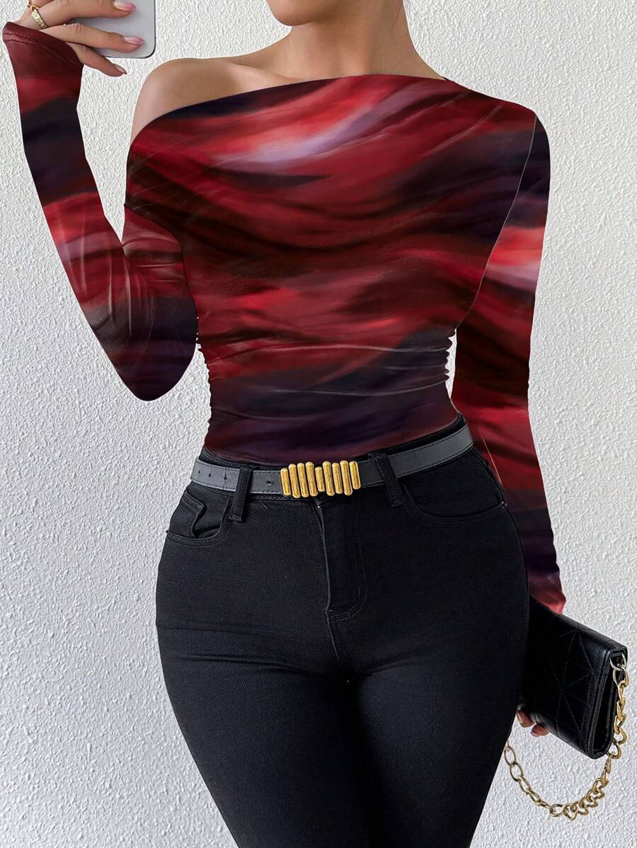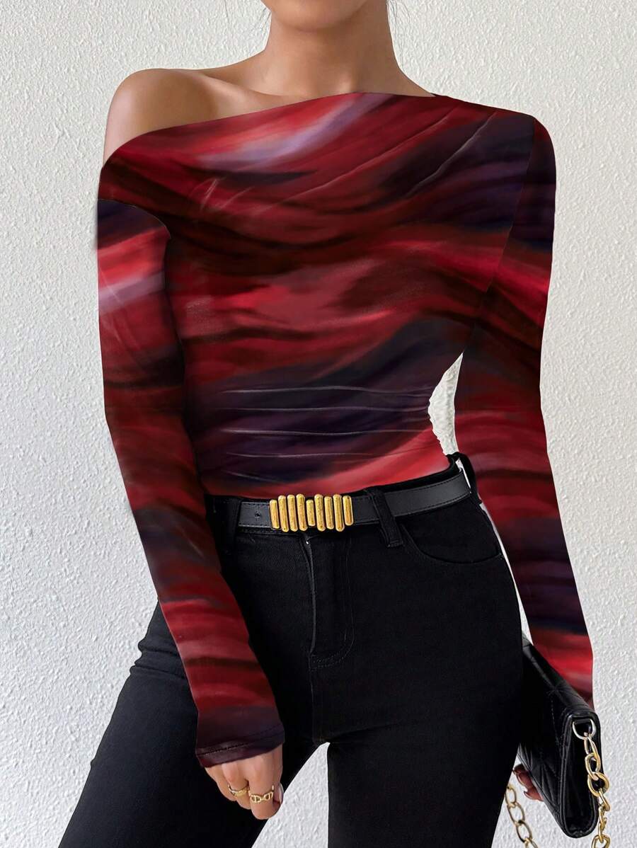 Chiquease Marble Ombre Print Asymmetric Ruched Long Sleeve Top For Spring Outfit Fall Cloth For Women