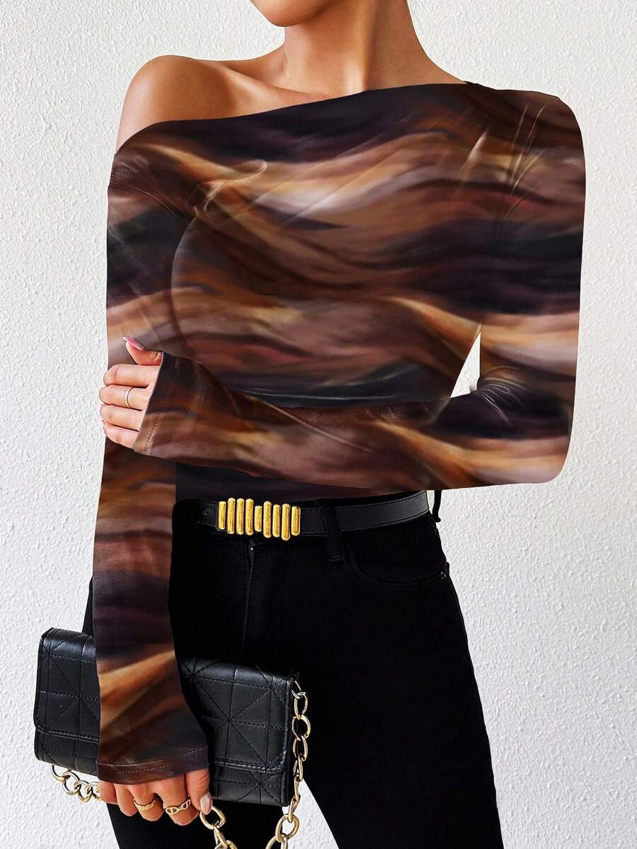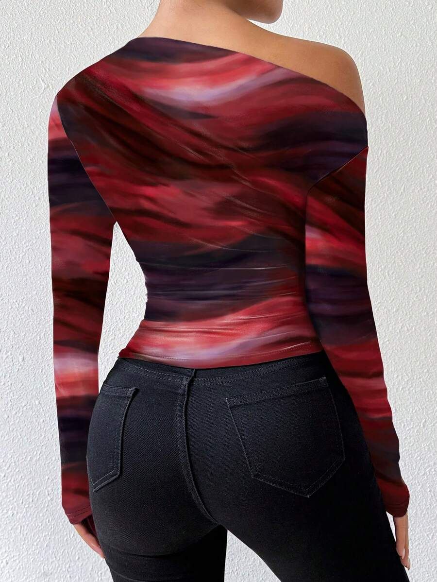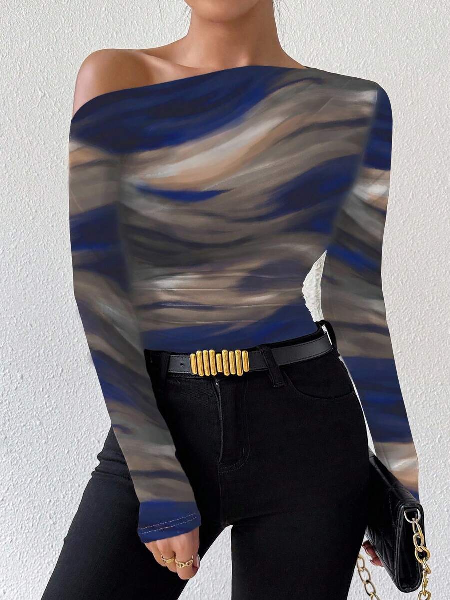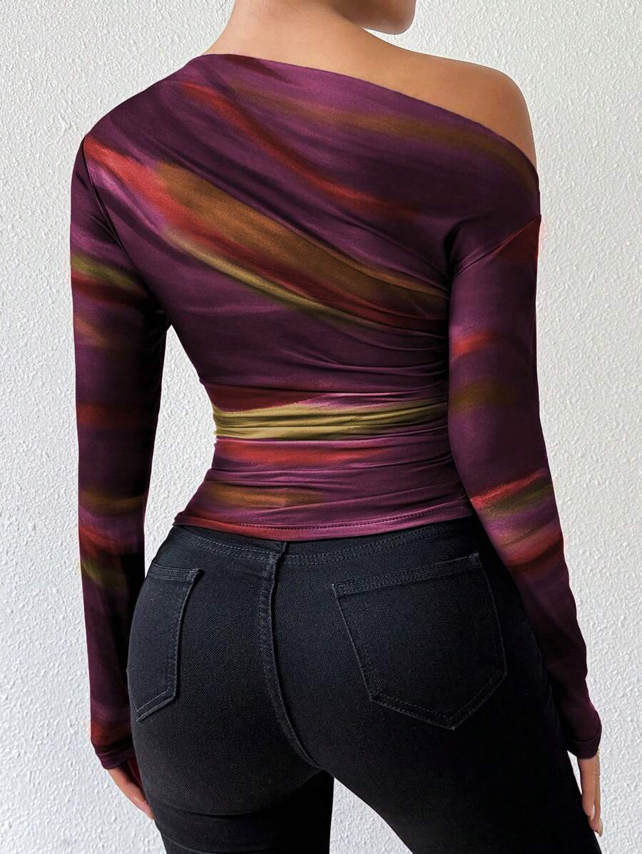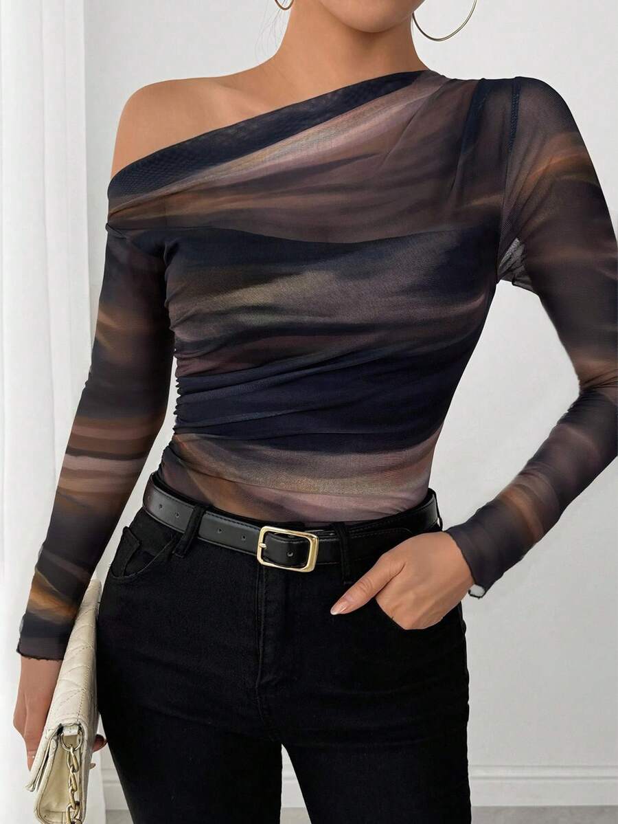 Chiquease Marble Ombre Print Asymmetric Ruched Long Sleeve Top For Spring Outfit Fall Cloth For Women